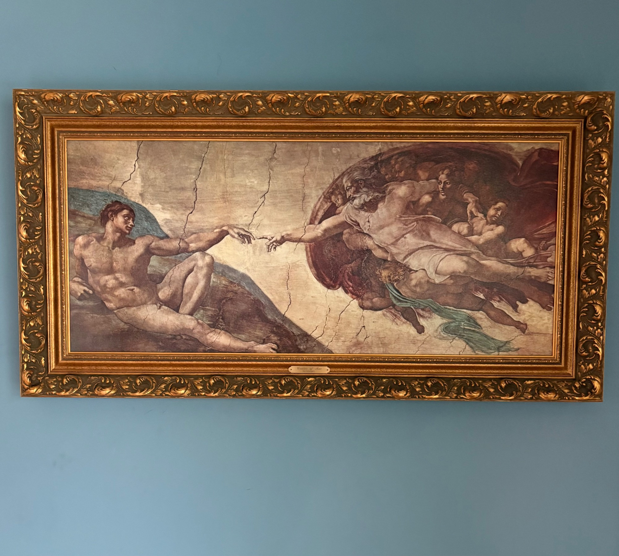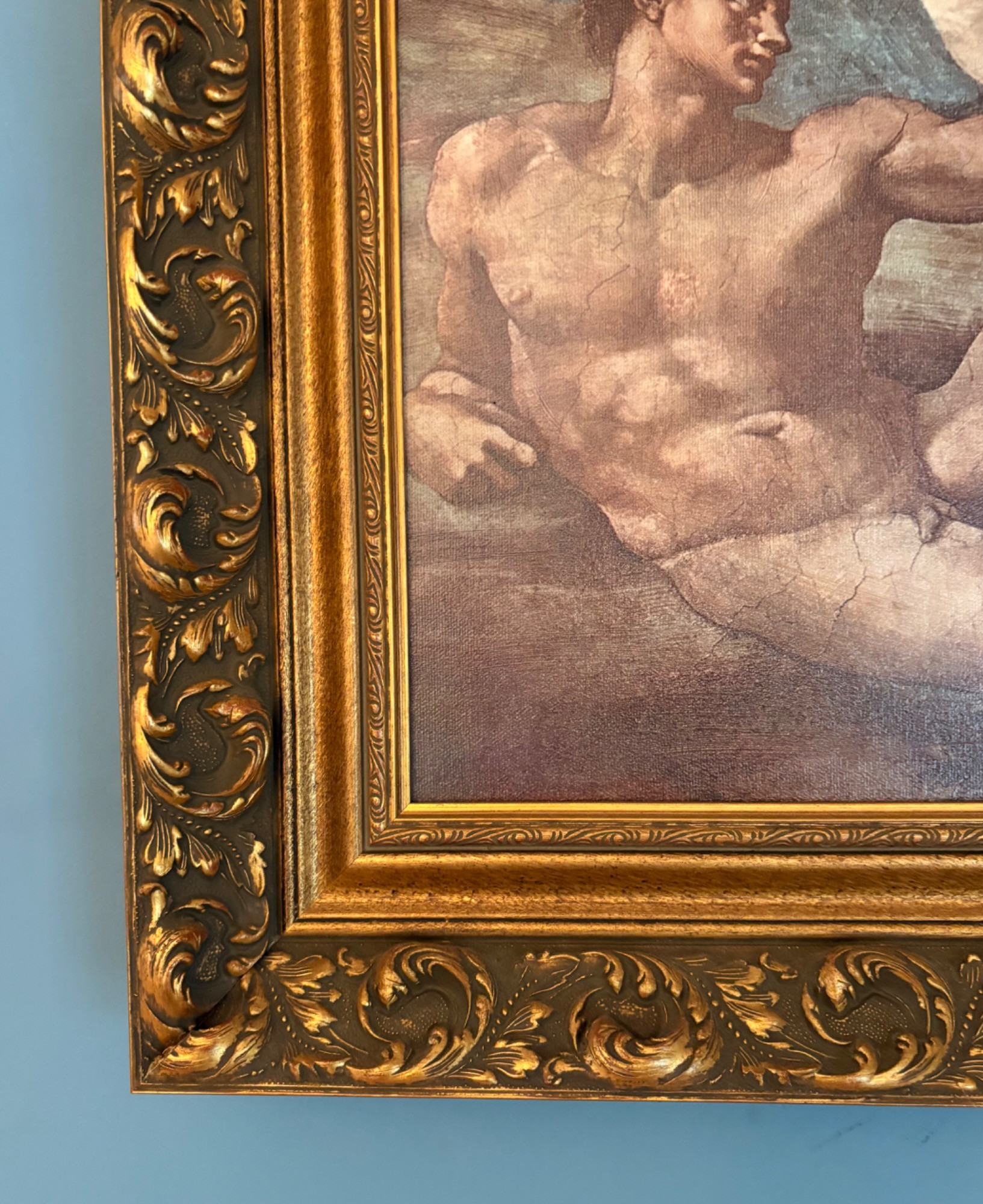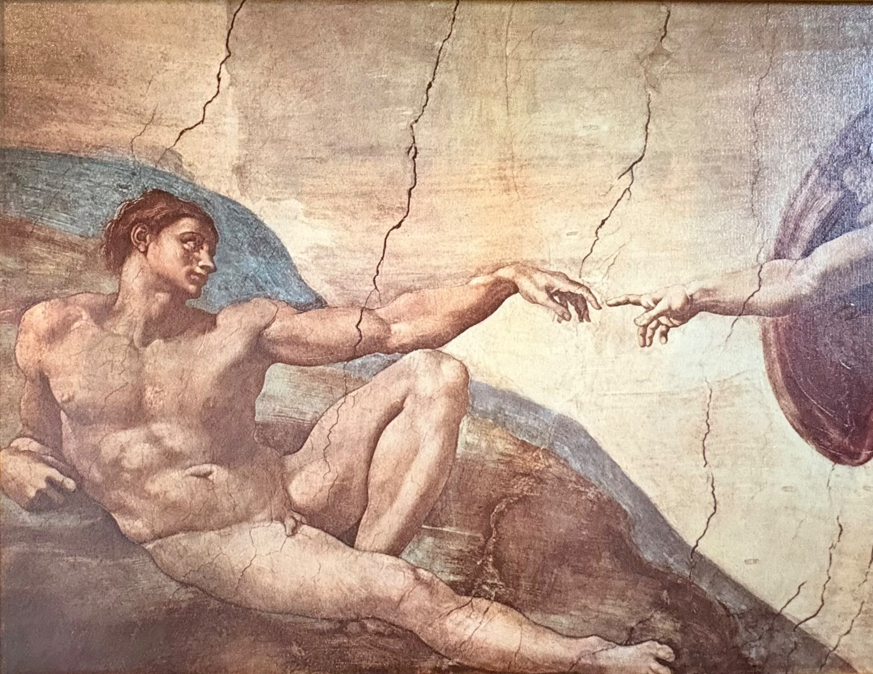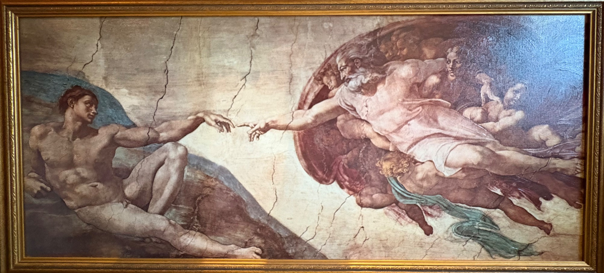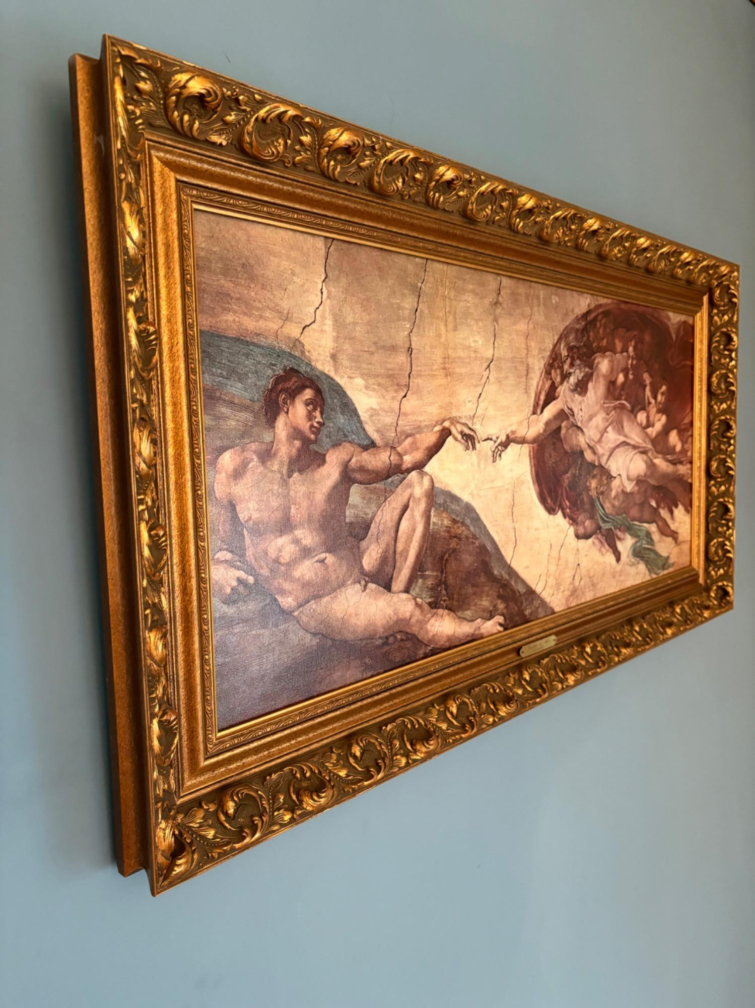 "The Creation of Man" by Michelangelo di Lodovico Buonarotti Simoni, aka Michelangelo (1475 - 1564) Reproduction on canvas of a portion of the Sistine Chapel ceiling in The Vatican. Note: the original this piece reproduces was a fresco, thus the lighter more pale paint hues typical of the medium. This is a larger piece at about 3.5' high by 2' wide framed. We are usure of the origin of this reproduction - given the image/frame, we think it might have been from Around the Corner Art but are not certain. Can be shipped FedEx.