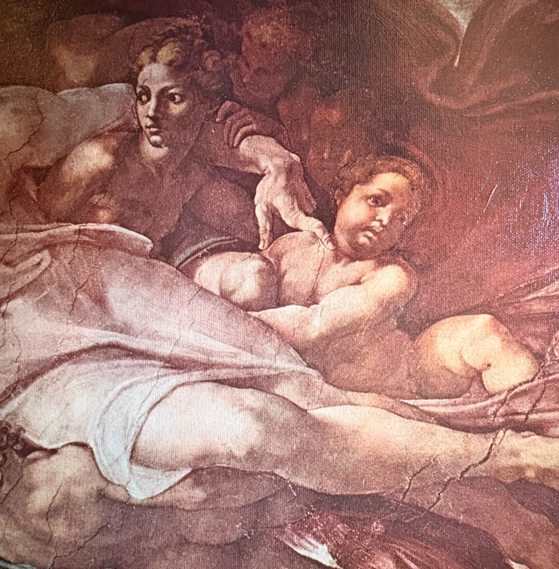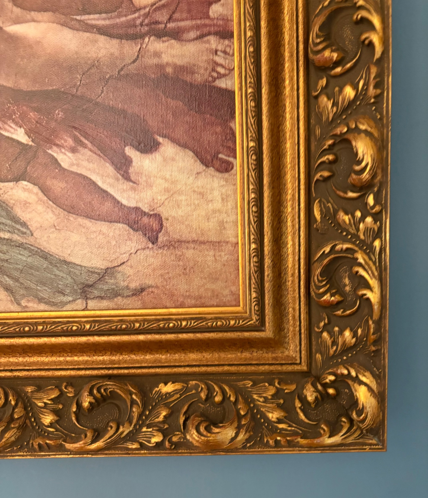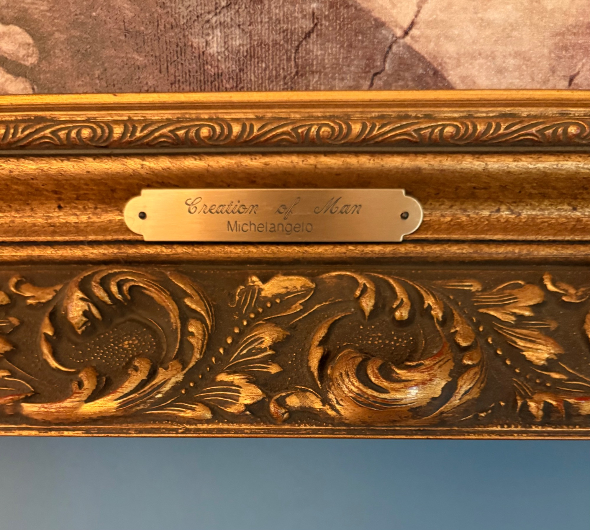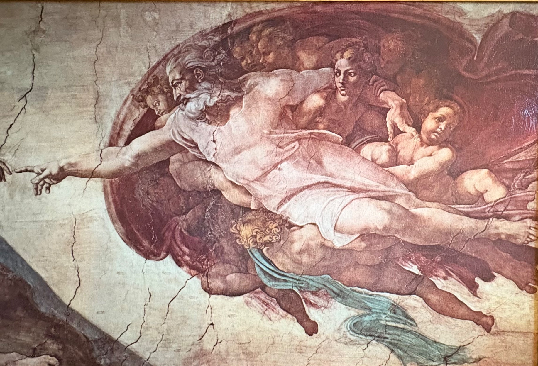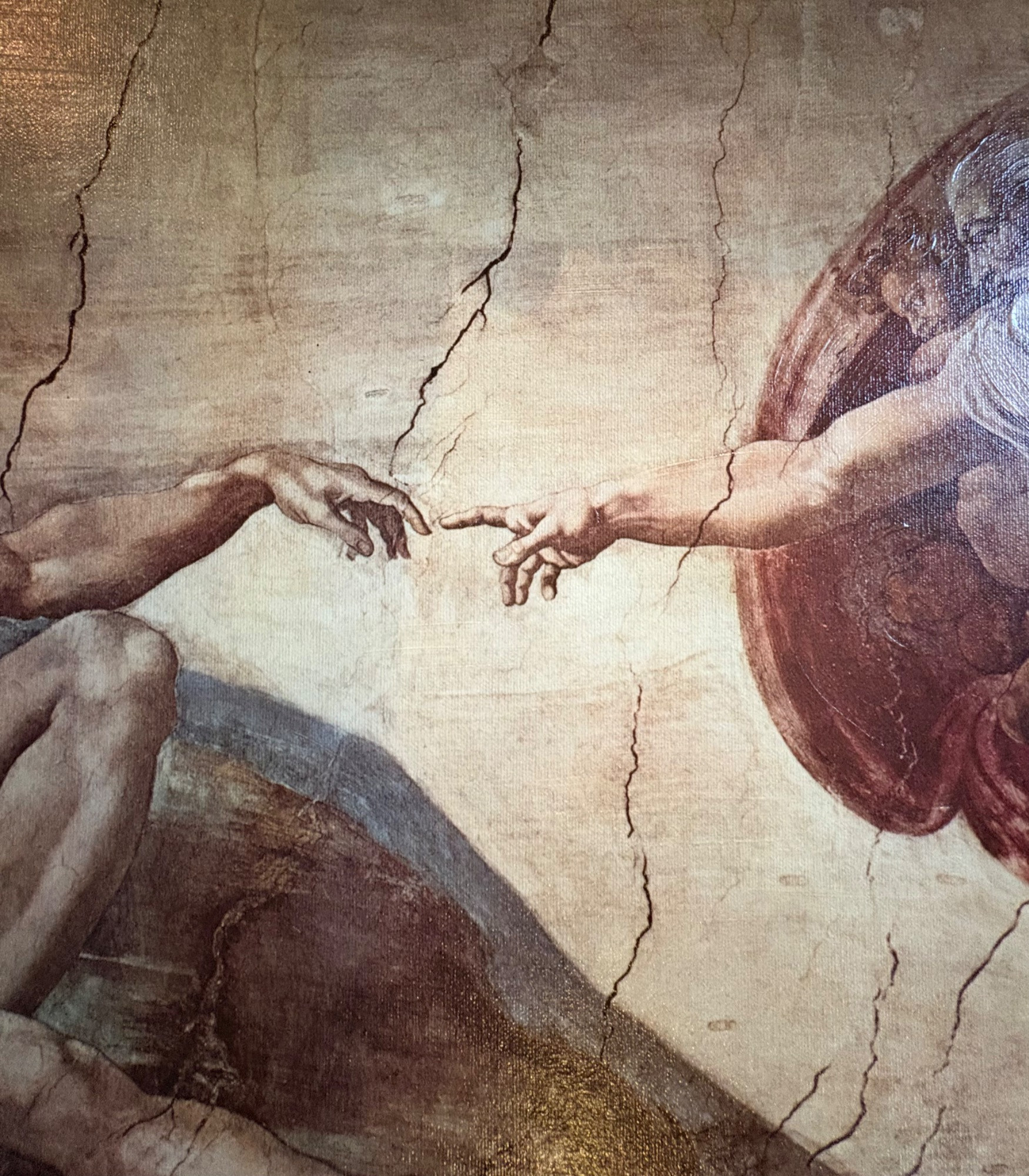 "The Creation of Man" by Michelangelo di Lodovico Buonarotti Simoni, aka Michelangelo (1475 - 1564) Reproduction on canvas of a portion of the Sistine Chapel ceiling in The Vatican. Note: the original this piece reproduces was a fresco, thus the lighter more pale paint hues typical of the medium. This is a larger piece at about 3.5' high by 2' wide framed. We are usure of the origin of this reproduction - given the image/frame, we think it might have been from Around the Corner Art but are not certain. Can be shipped FedEx.
