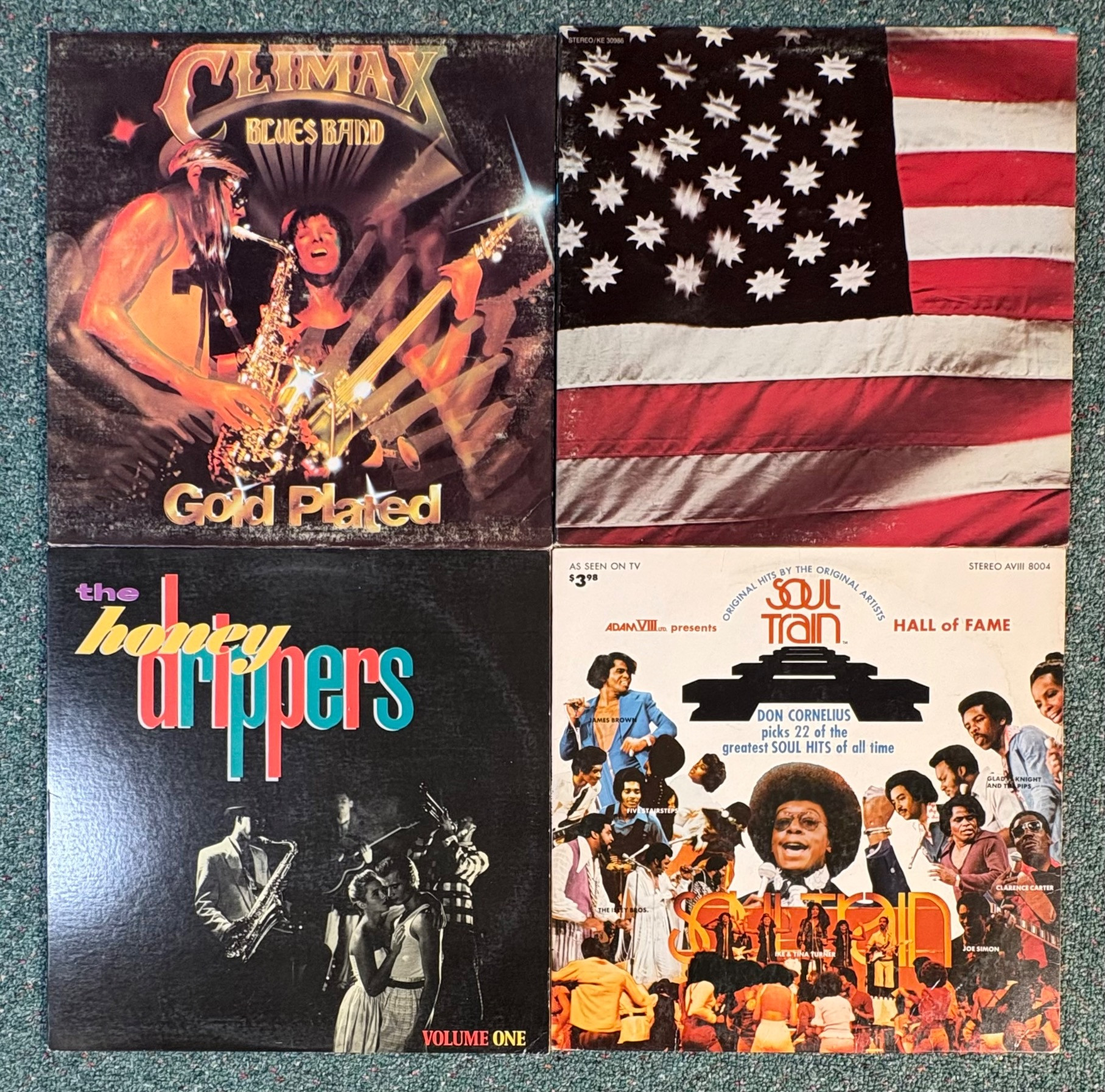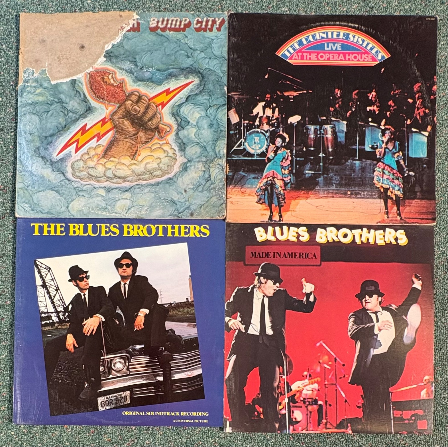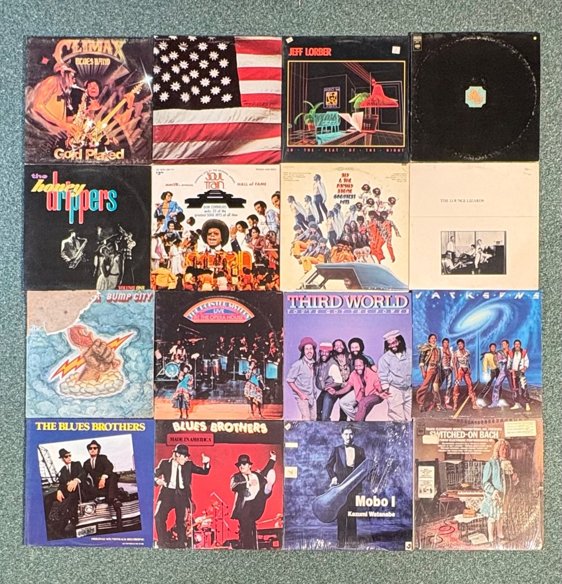 16 vintage vinyl LPs! Our client had eclectic taste and loved his albums - thus, most of these have been lovingly played over the years. We checked to make sure the correct album was in the correct cover and did a cursory glance for any egregious scratches. Some covers reflect heavy use and are worn/split in places/have names written on them. However, the majority are in good used shape. Artists/Bands in this lot include: Tower Of Power Blues Brothers (2 albums) The Pointer Sisters Third World Kazumi Watanabe Jackson’s Switched On Bach Jeff Lorber Sly & The Family Stone (2 albums) Chicago The Lounge Lizards Soul Train Hall Of Fame Climax Blues Band The Honeydrippers Note: Soul Train Hall of Fame missing inner sleeve.