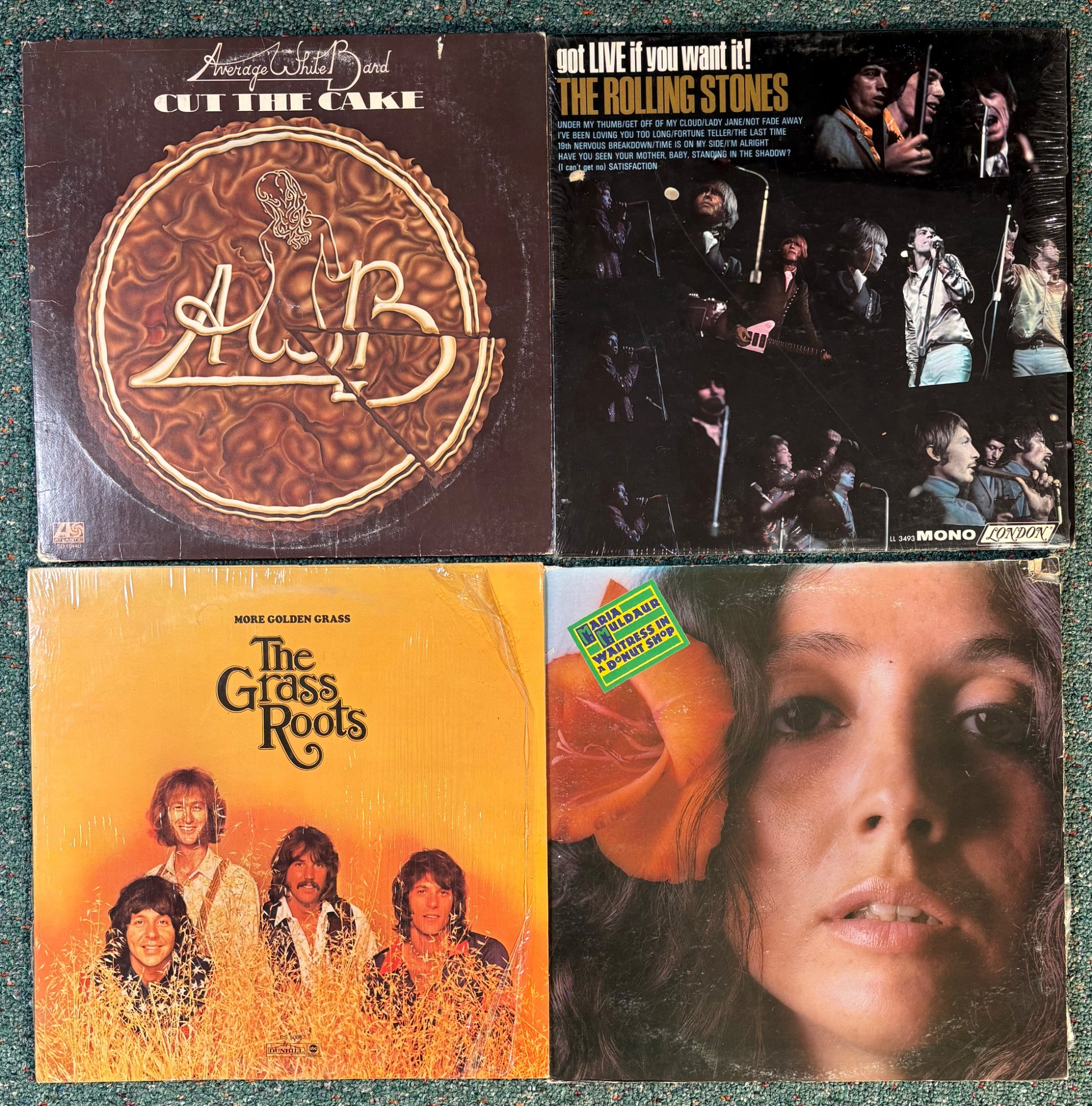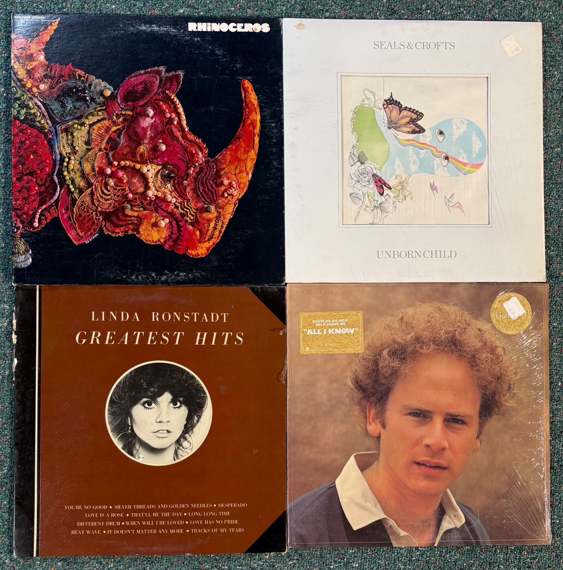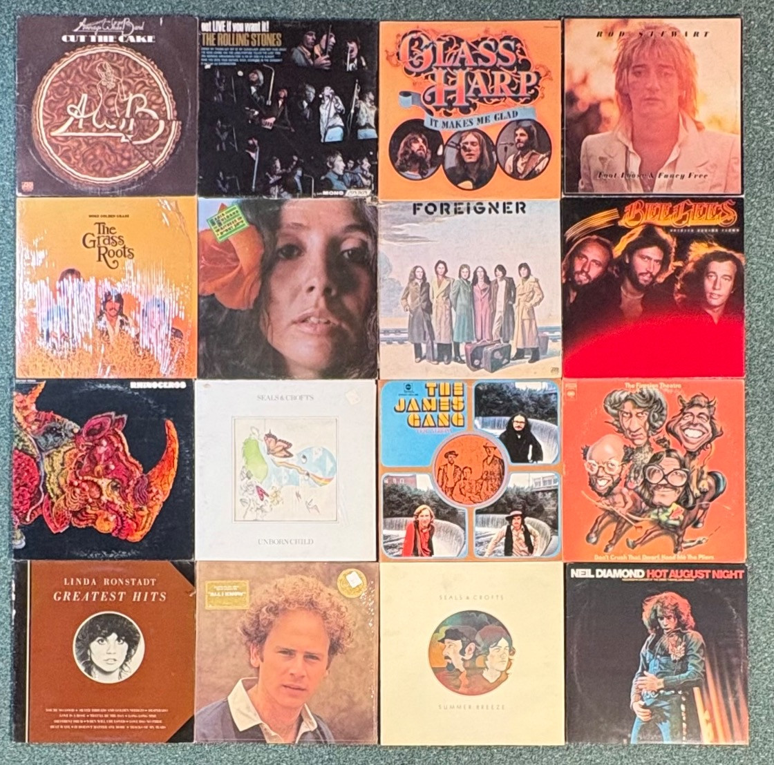 16 vintage vinyl LPs! Our client had eclectic taste and loved his albums - thus, most of these have been lovingly played over the years. We checked to make sure the correct album was in the correct cover and did a cursory glance for any egregious scratches. Some covers reflect heavy use and are worn/split in places/have names written on them. However, the majority are in good used shape. Artists/Bands in this lot include: Rod Stewart Glass Harp Foreigner Bee Gees Rhinoceros Linda Ronstadt Seals & Crofts (2 albums) Art Garfunkel The James Gang Fire Sign Theater Neil Diamond Rolling Stones Maria Moldaur Average White Band The Grass Roots
