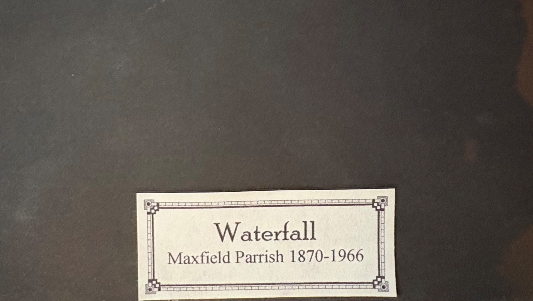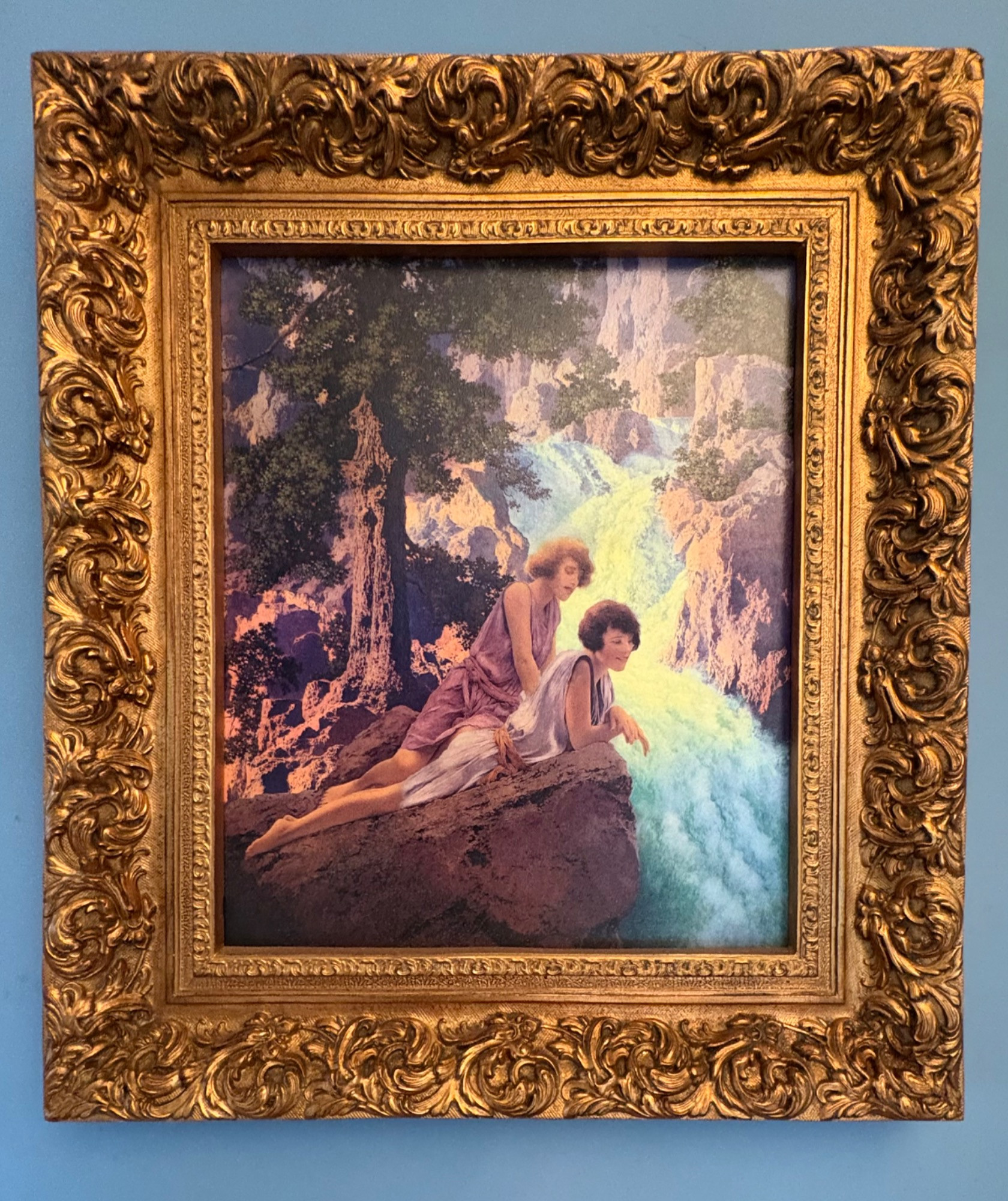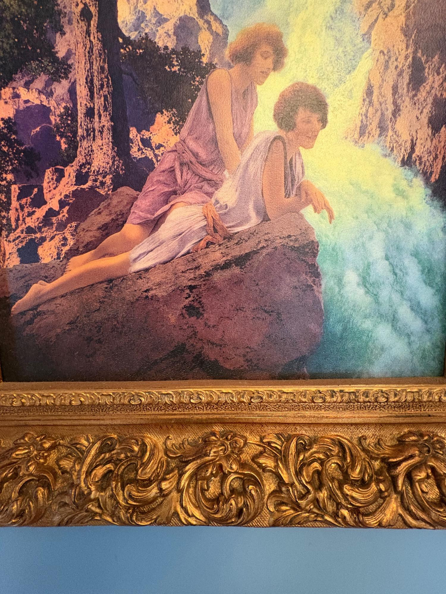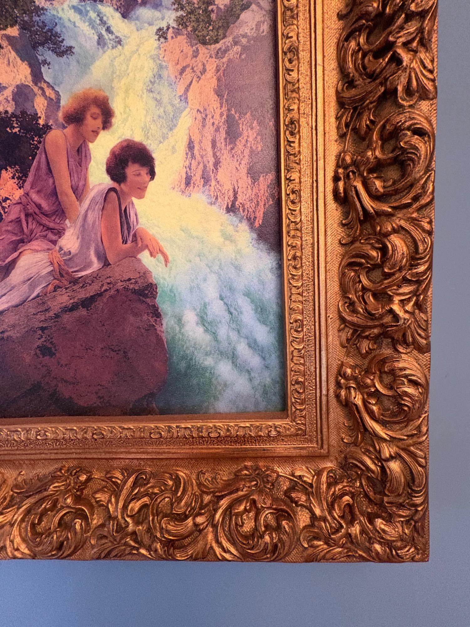 "Waterfall" by Maxwell Parrish (1870 - 1966). Reproduction print (flat) of the painting with distinctly pinkish cast to it. Detailed frame in gold. Medium size at about 3' high by 2.5' wide framed. From Around the Corner Fine Art of Virginia known for producing high quality reproductions & frames in the 1980s & 1990s (Sadly, they appear to have closed shop in the early 2000s). We found a catalogue offering many of the exact works our client owned that roughly aligns with our client's purchase dates (pre-internet when everything was phone ordered or mail ordered). For those curious about the original price range/production of the paintings, see catalogue info in photos below after the listing photos.