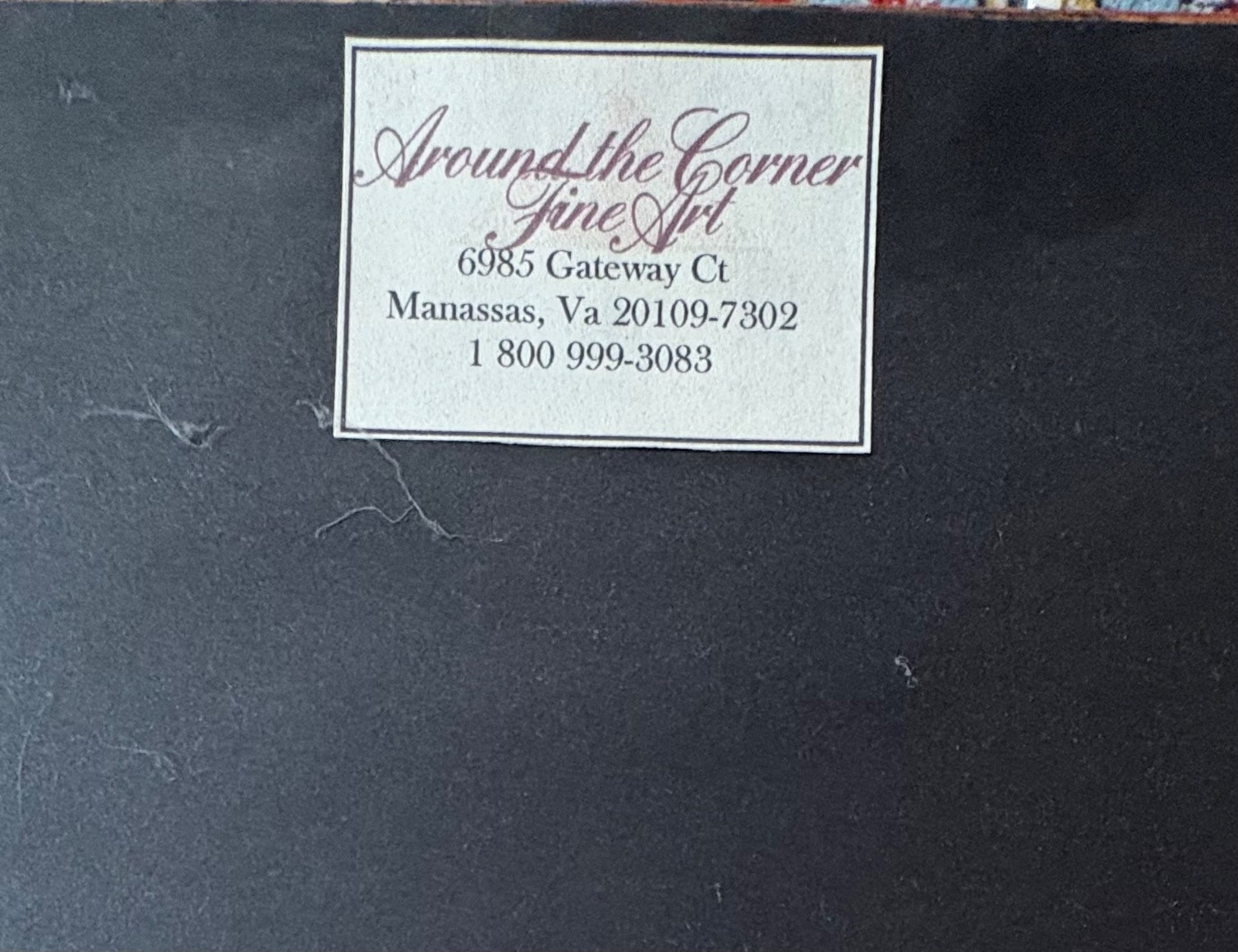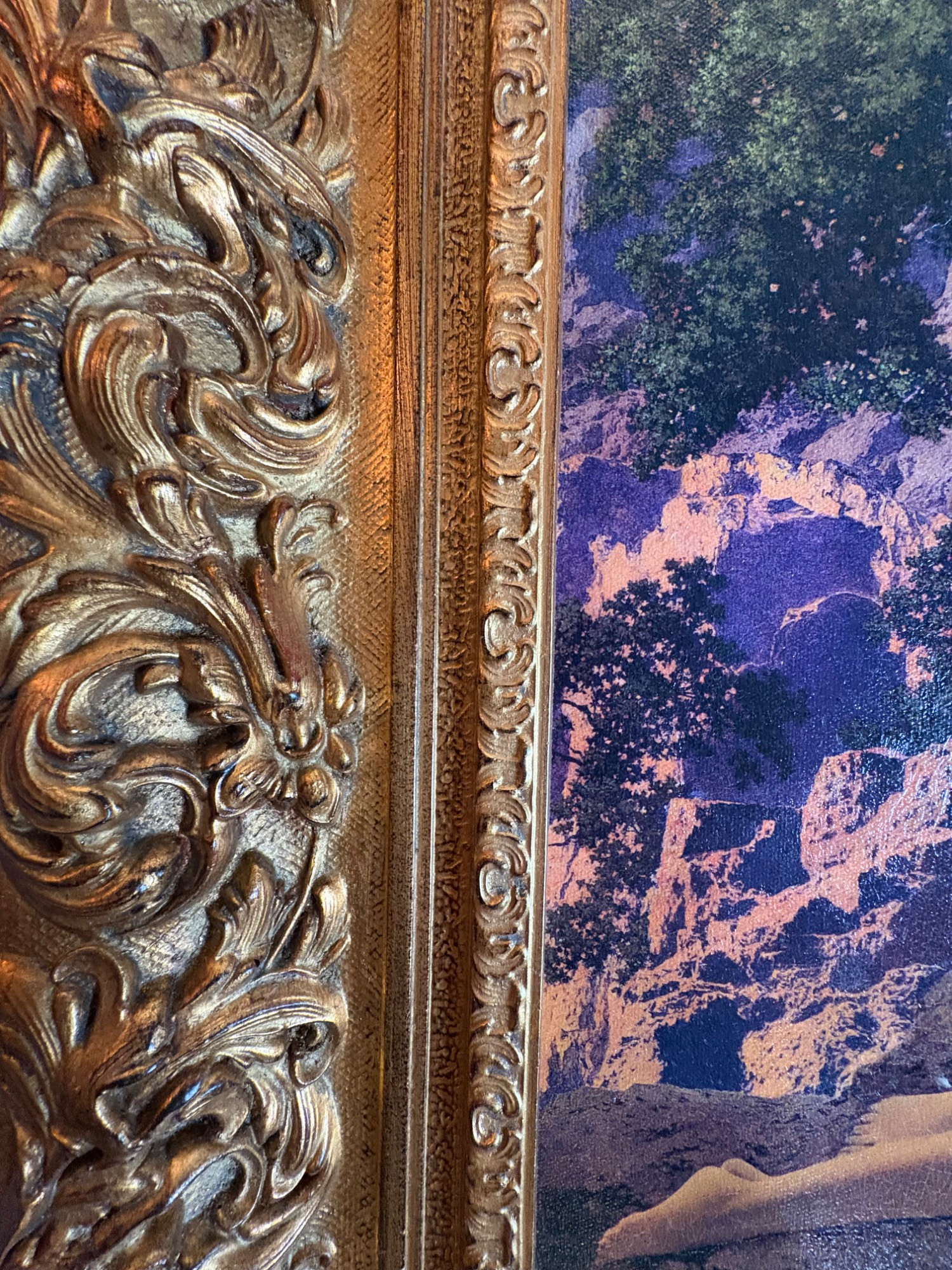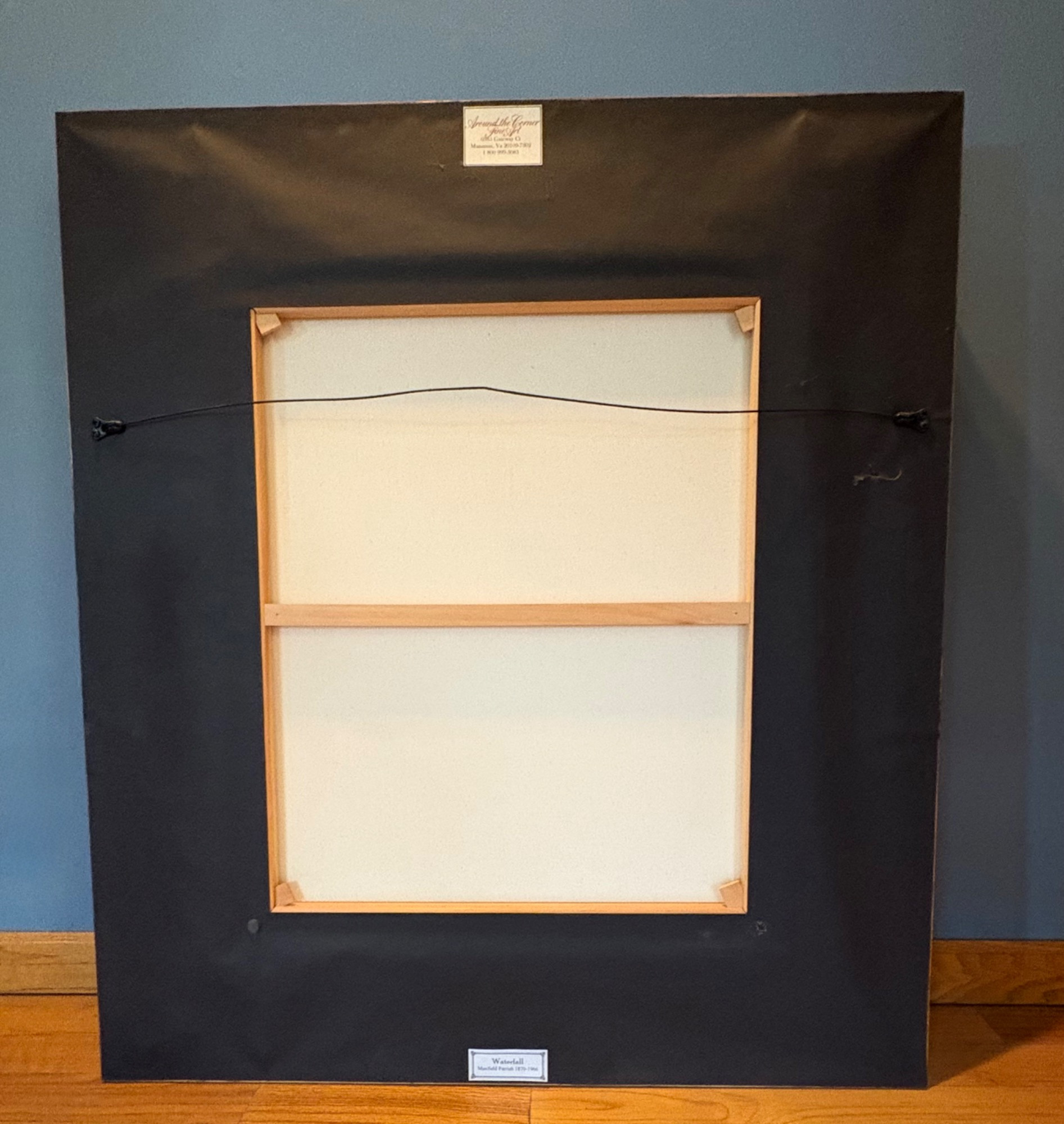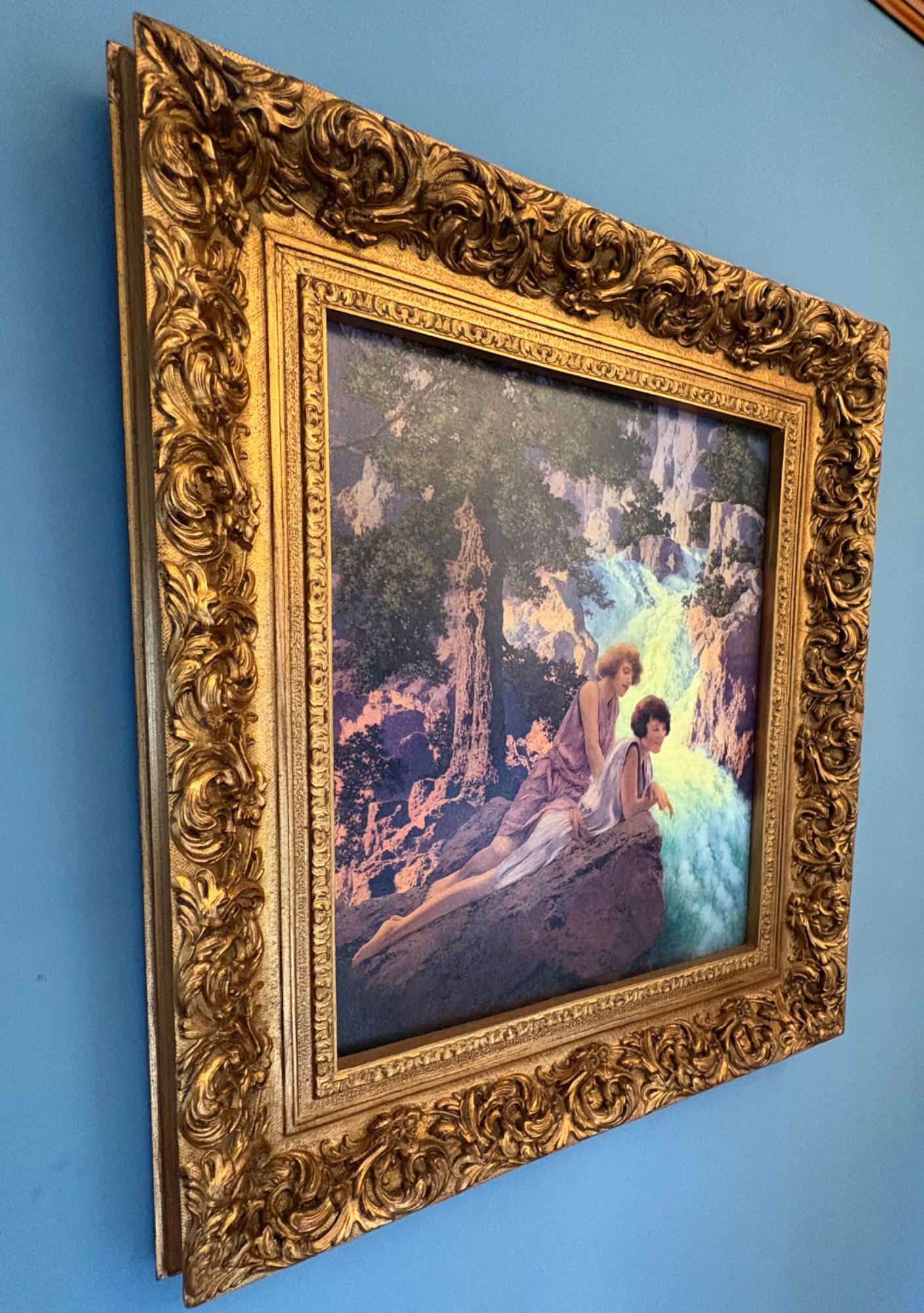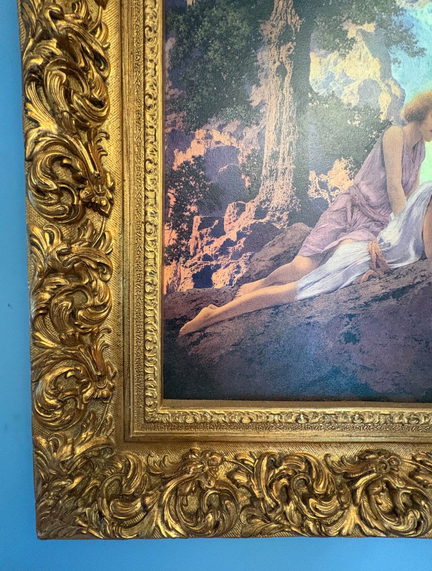 "Waterfall" by Maxwell Parrish (1870 - 1966). Reproduction print (flat) of the painting with distinctly pinkish cast to it. Detailed frame in gold. Medium size at about 3' high by 2.5' wide framed. From Around the Corner Fine Art of Virginia known for producing high quality reproductions & frames in the 1980s & 1990s (Sadly, they appear to have closed shop in the early 2000s). We found a catalogue offering many of the exact works our client owned that roughly aligns with our client's purchase dates (pre-internet when everything was phone ordered or mail ordered). For those curious about the original price range/production of the paintings, see catalogue info in photos below after the listing photos.