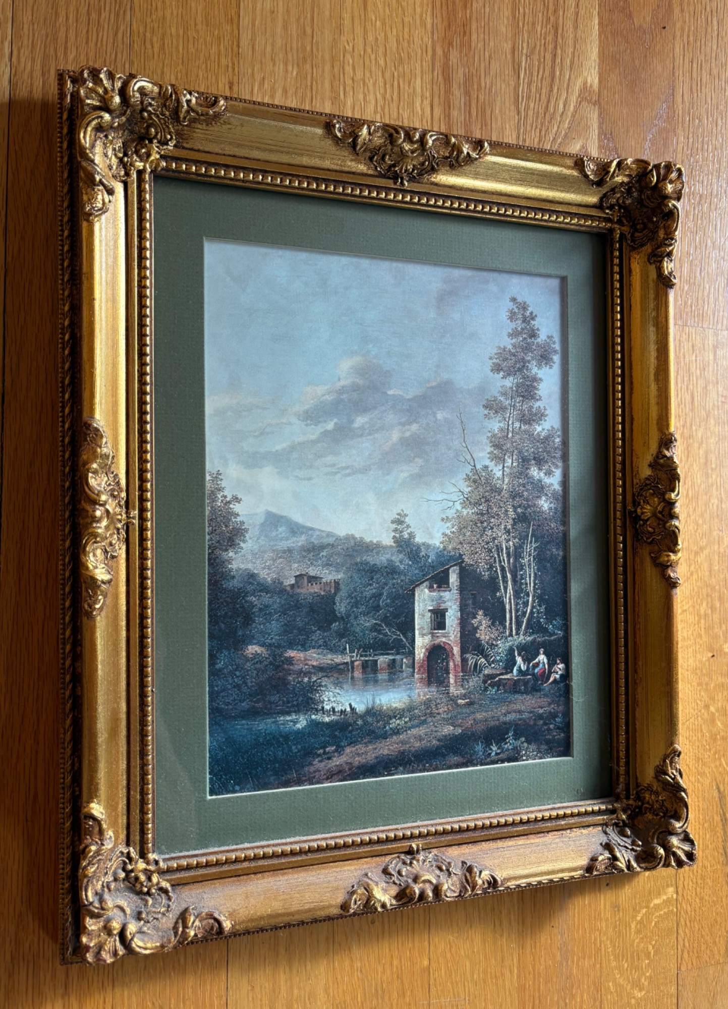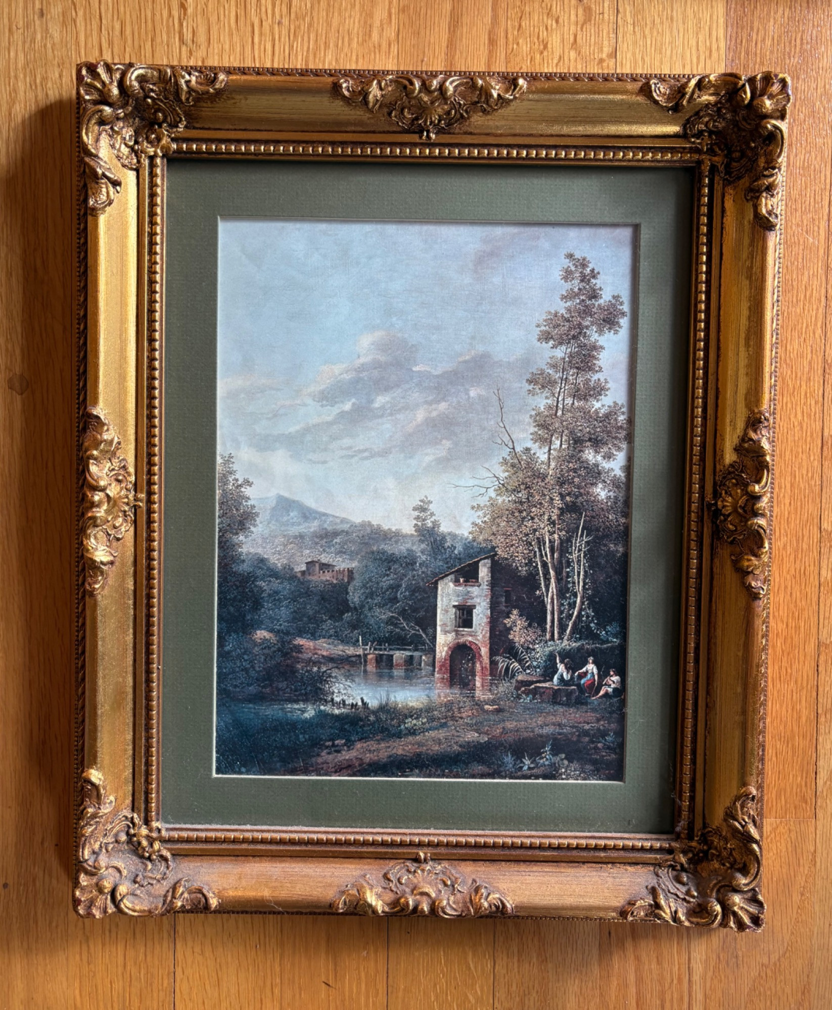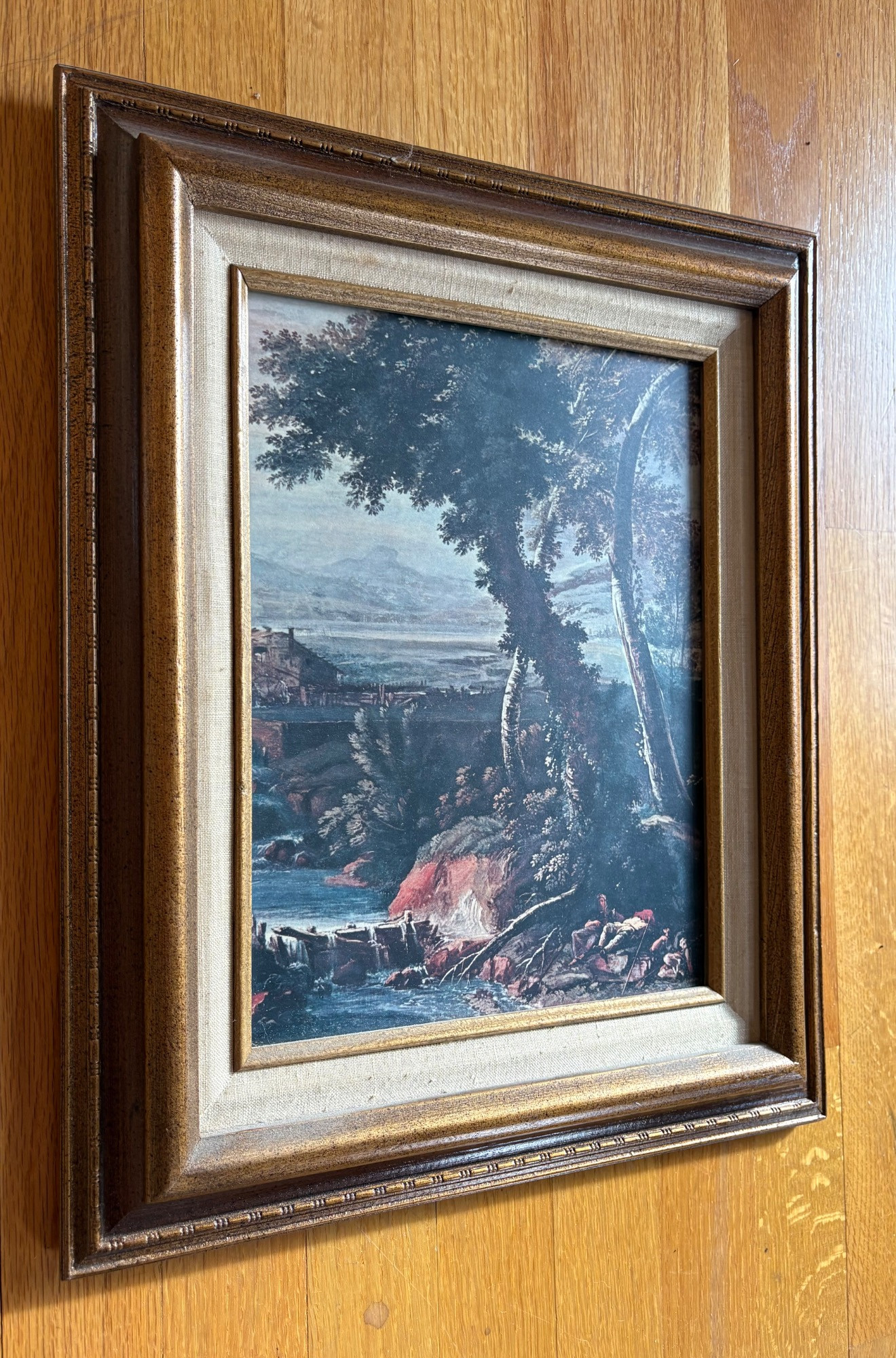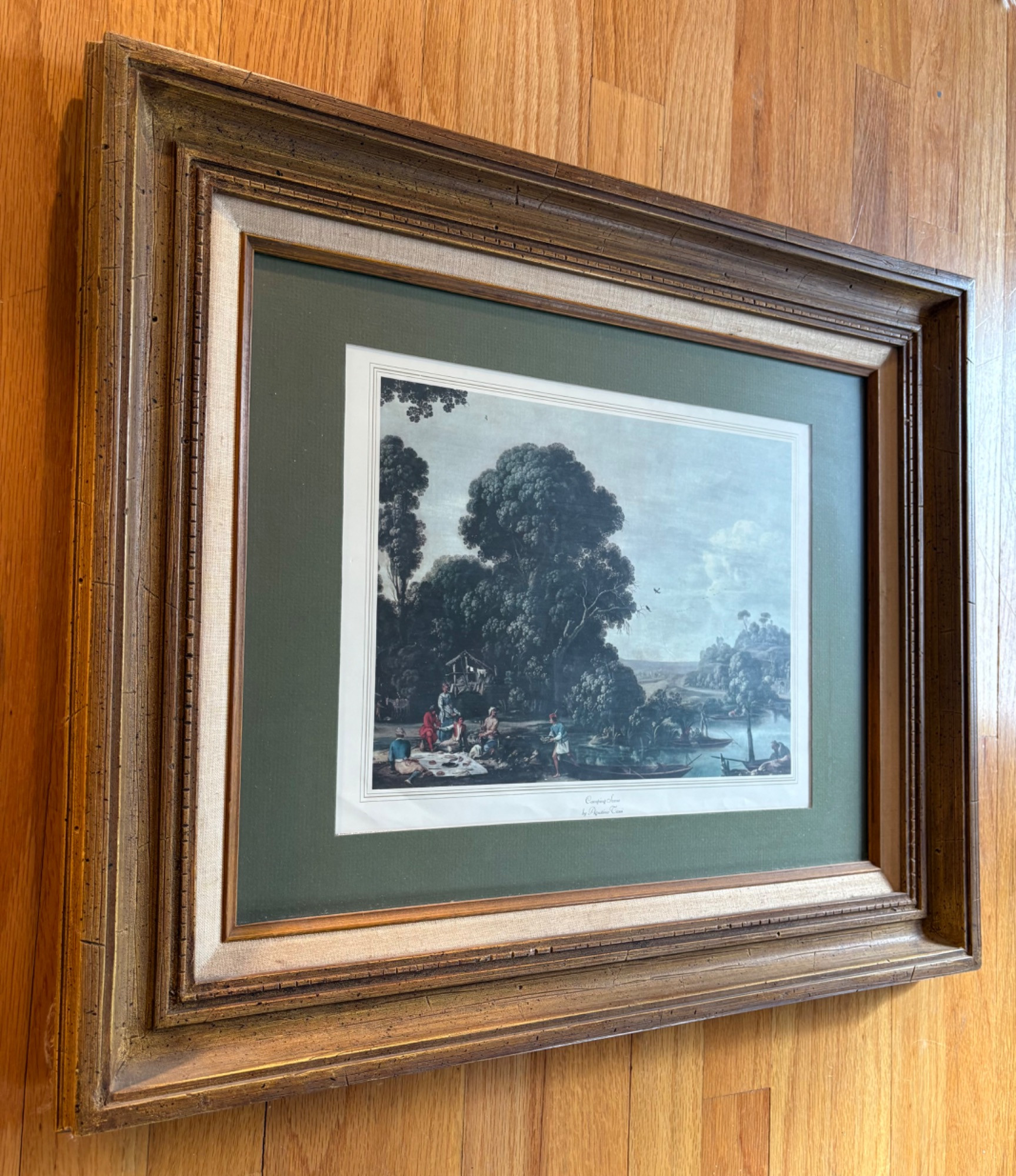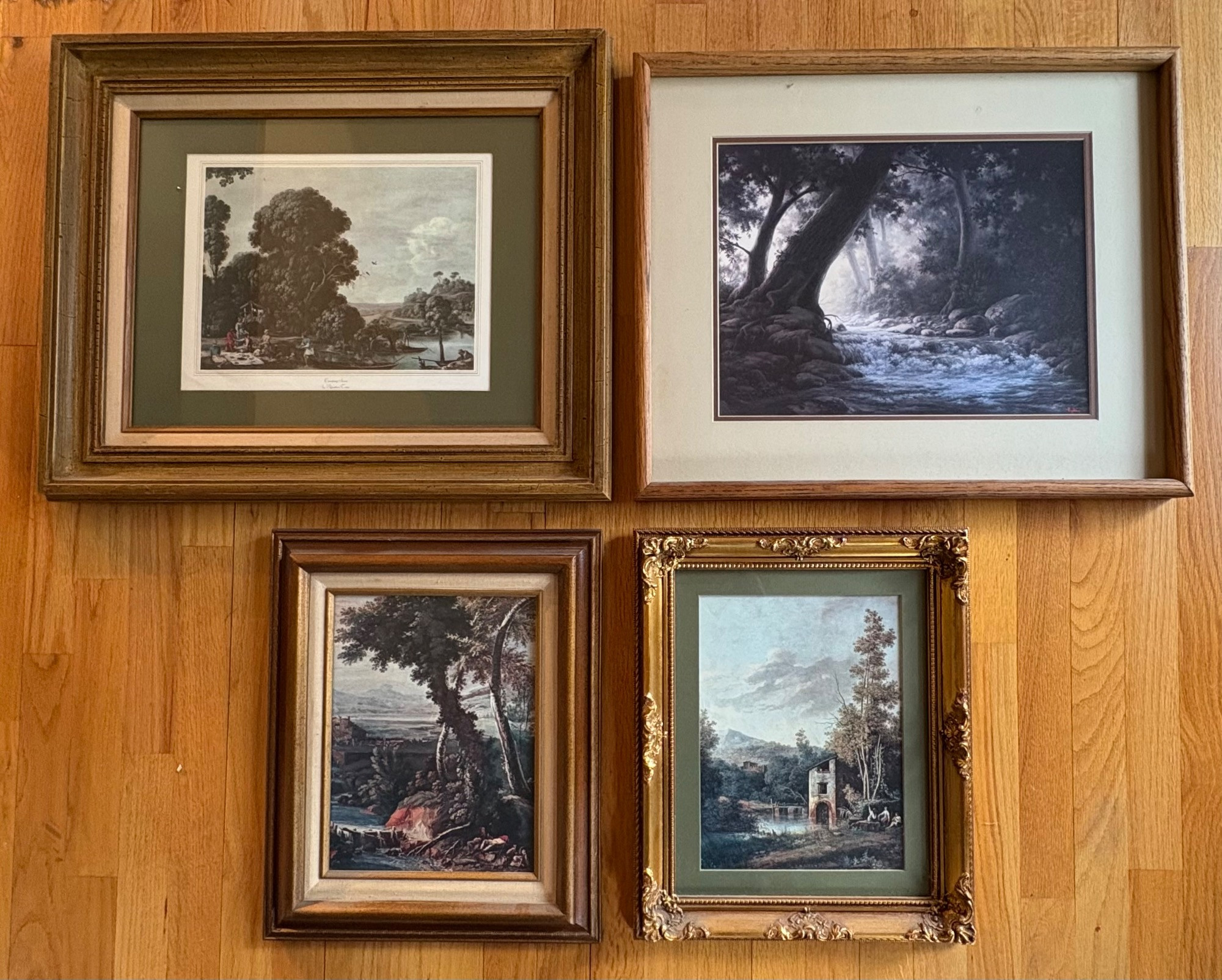 Four reproduction landscape prints from various artists. Each has a slightly different frame and all are in good vintage condition. Camping scene by Augustino Tassi measures 19.75" H x 23.75" W x 1.75" D Winberg print measures 19" H x 23" W x 1.75" D: Landscape with old mill and lots of sky measures 17" H x 14" W x 2" D Riverside print with linen mat measures 17.25" H x 14" W x 1.75" D