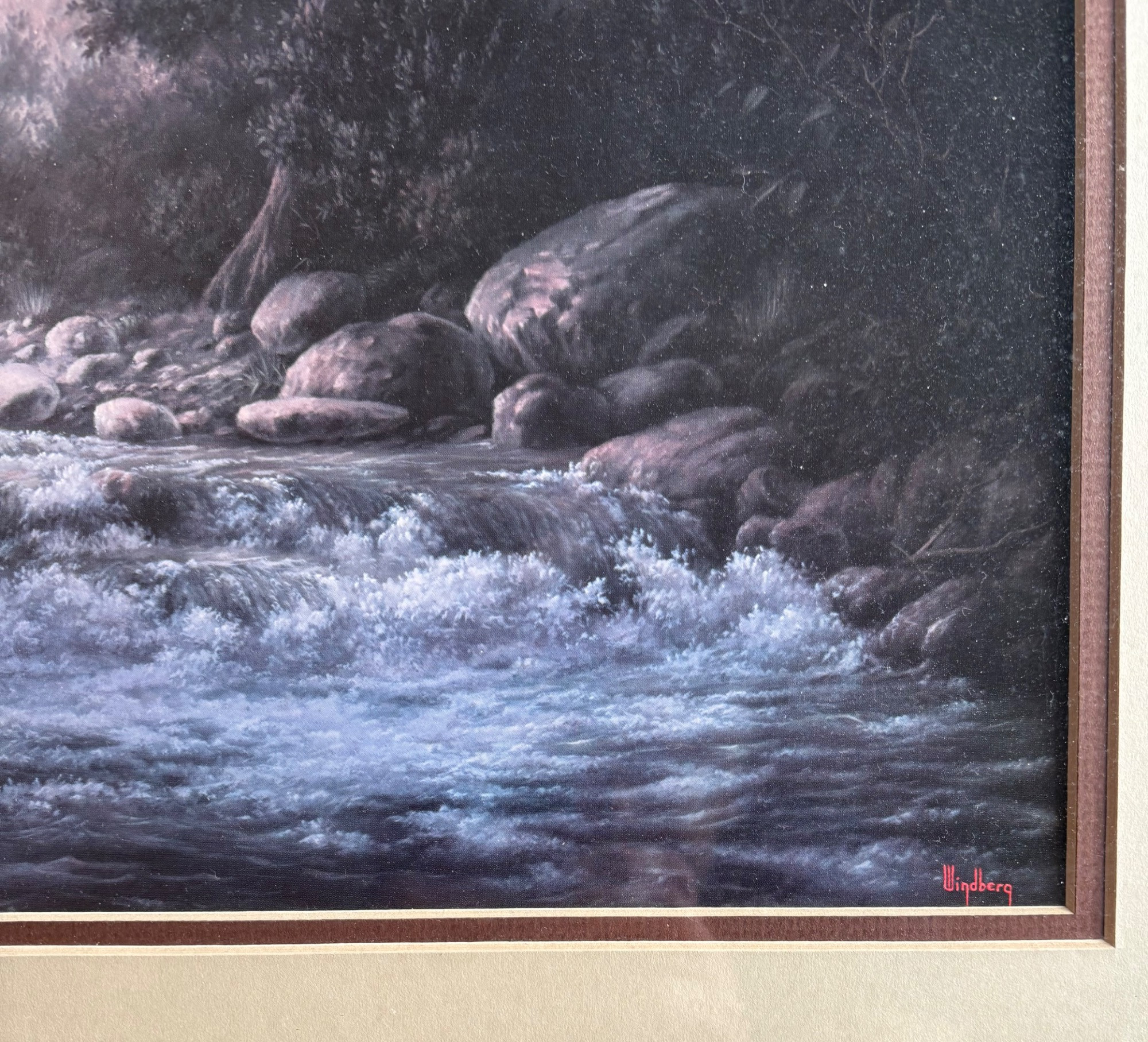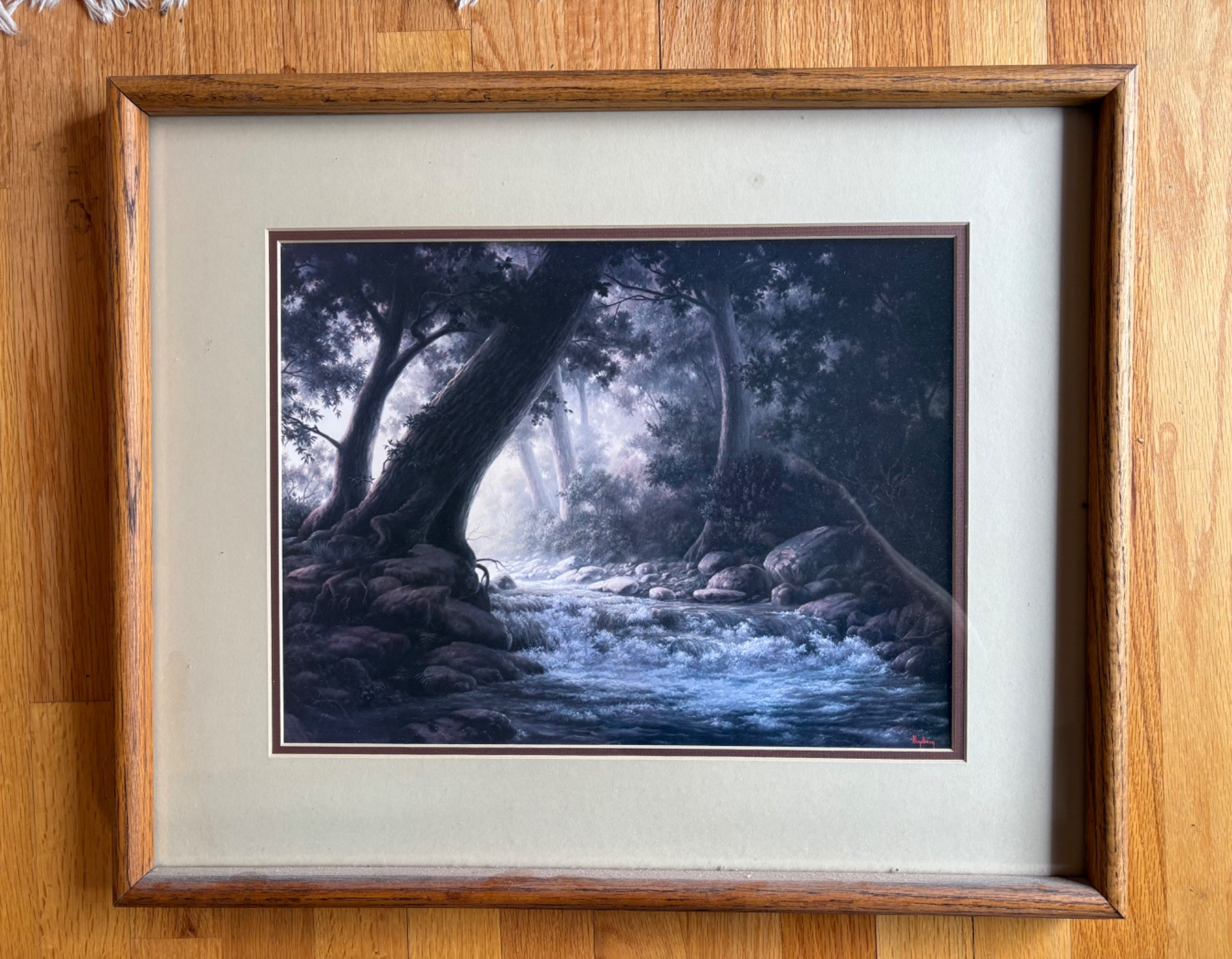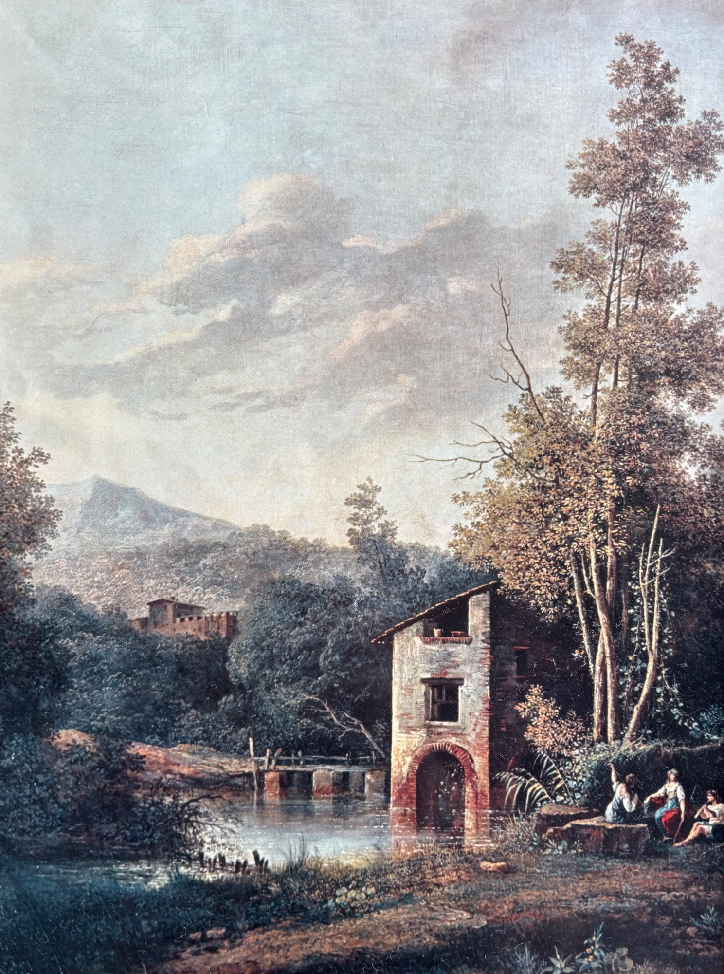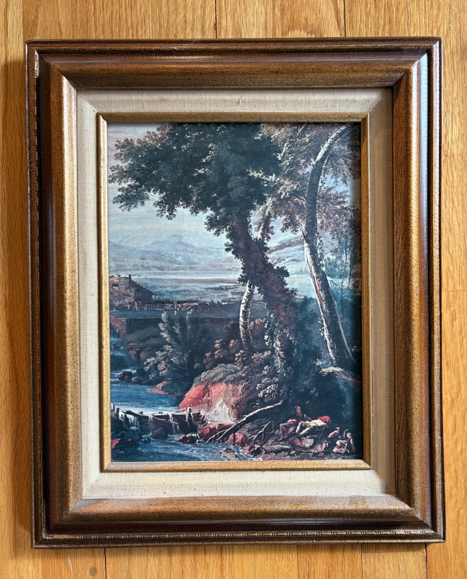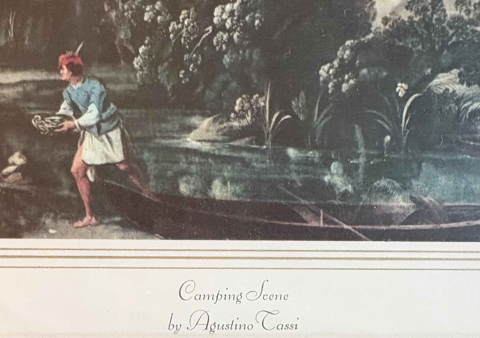 Four reproduction landscape prints from various artists. Each has a slightly different frame and all are in good vintage condition. Camping scene by Augustino Tassi measures 19.75" H x 23.75" W x 1.75" D Winberg print measures 19" H x 23" W x 1.75" D: Landscape with old mill and lots of sky measures 17" H x 14" W x 2" D Riverside print with linen mat measures 17.25" H x 14" W x 1.75" D