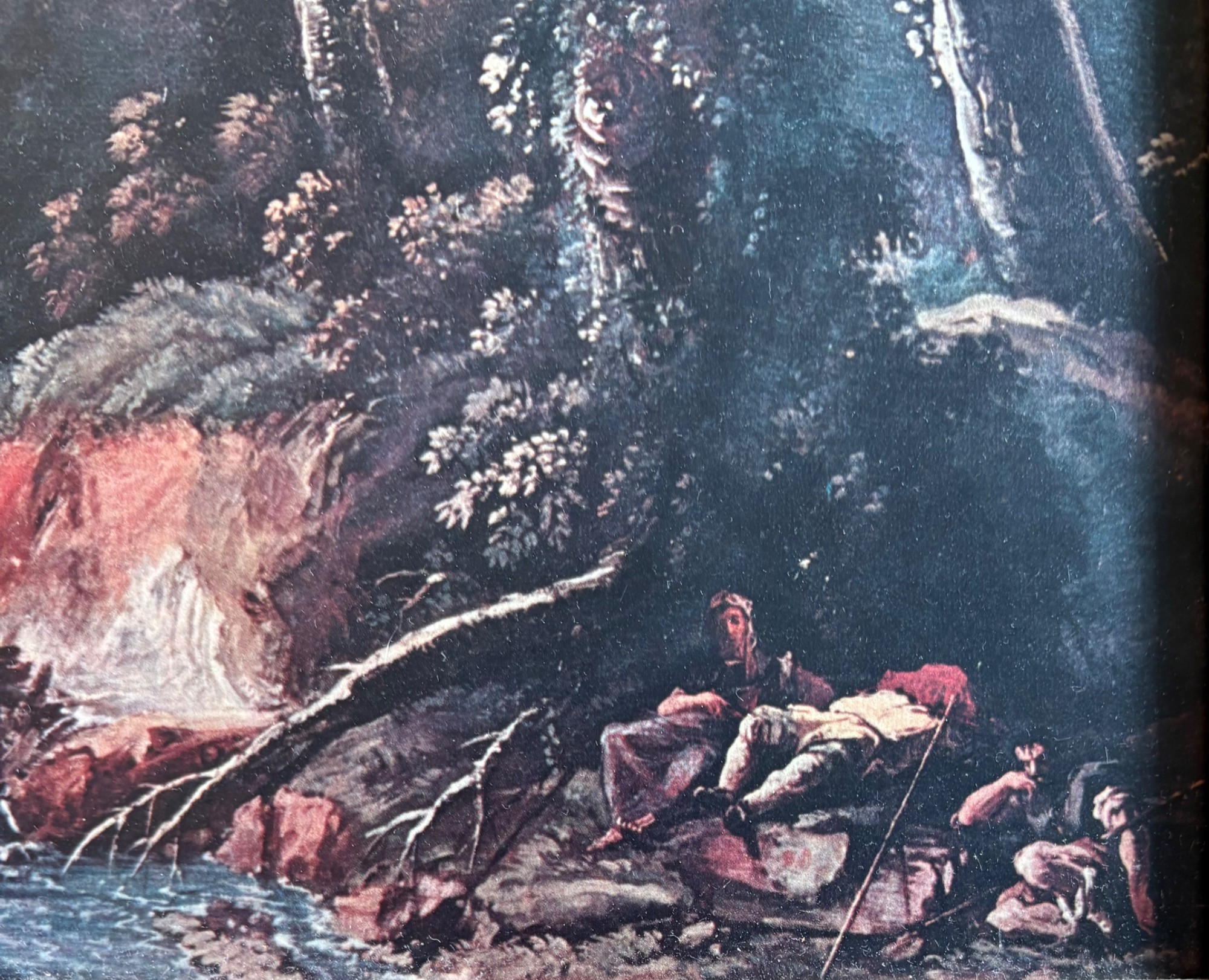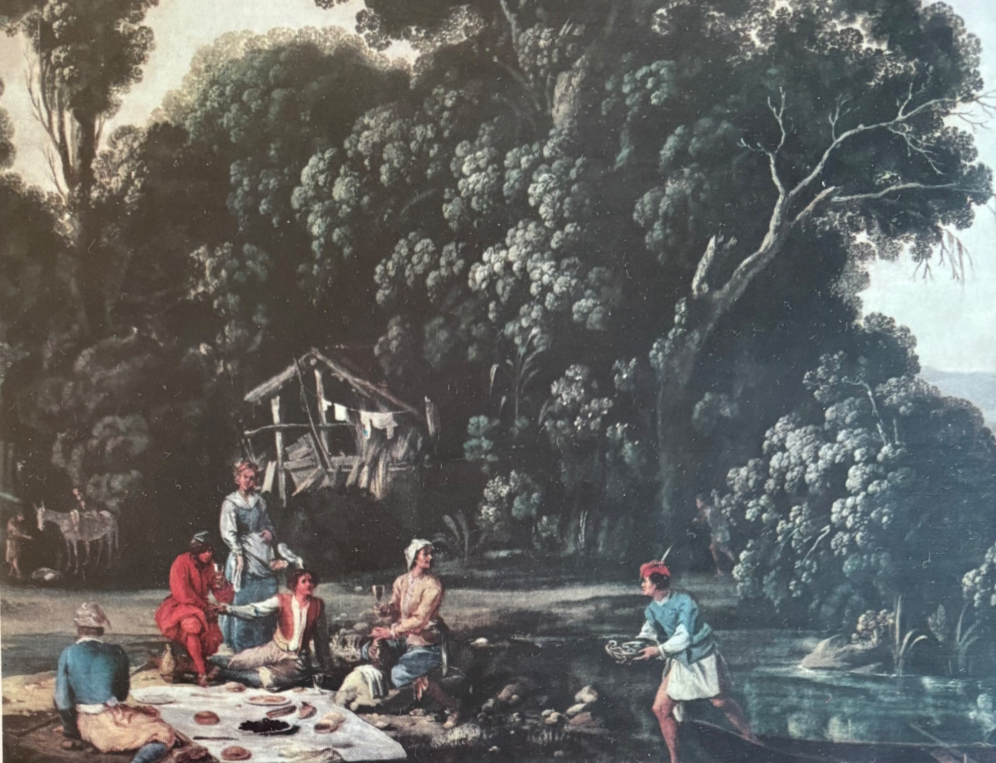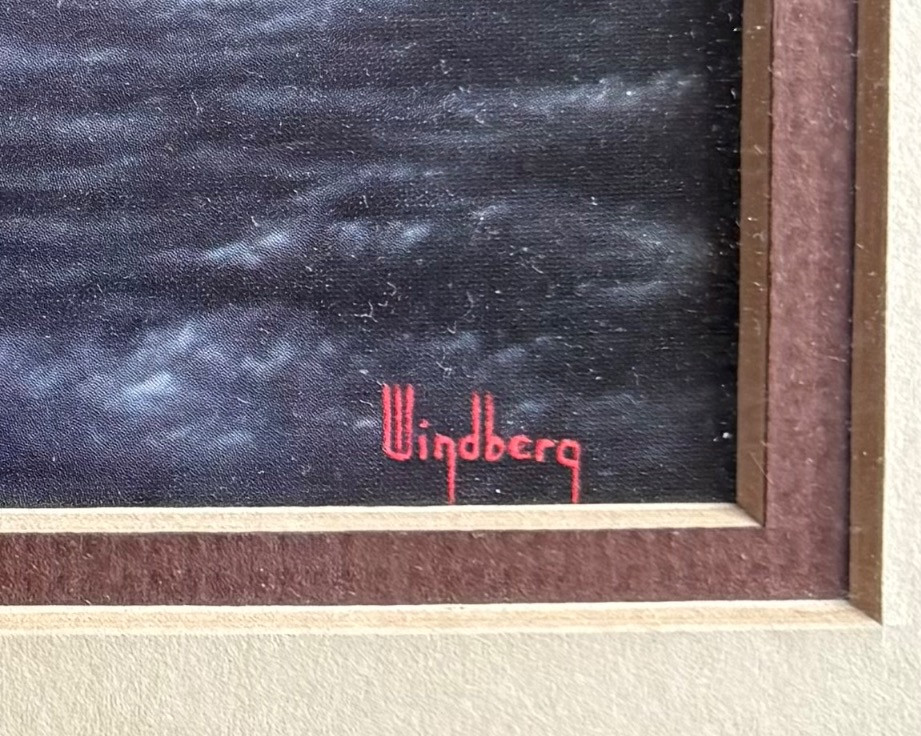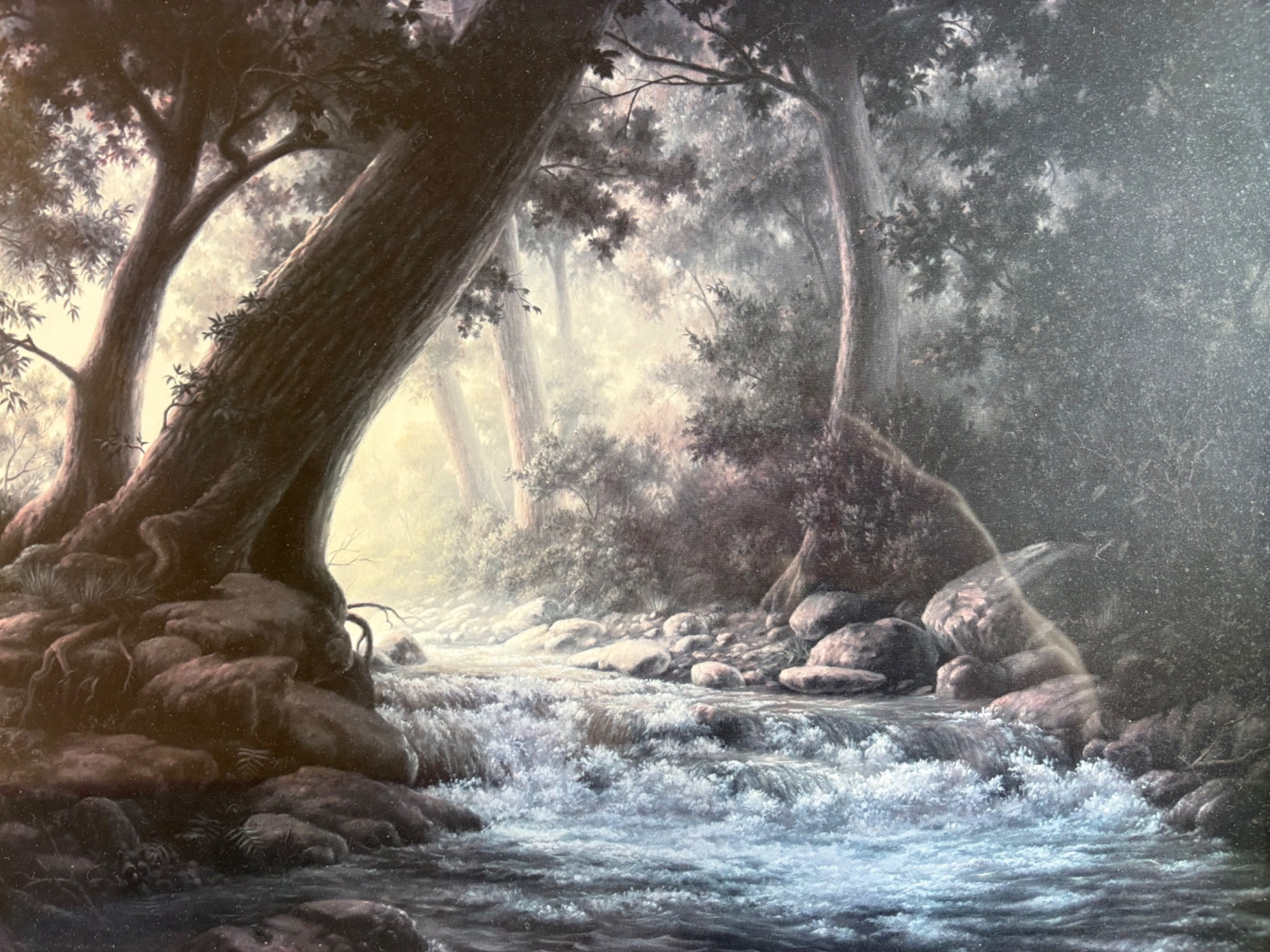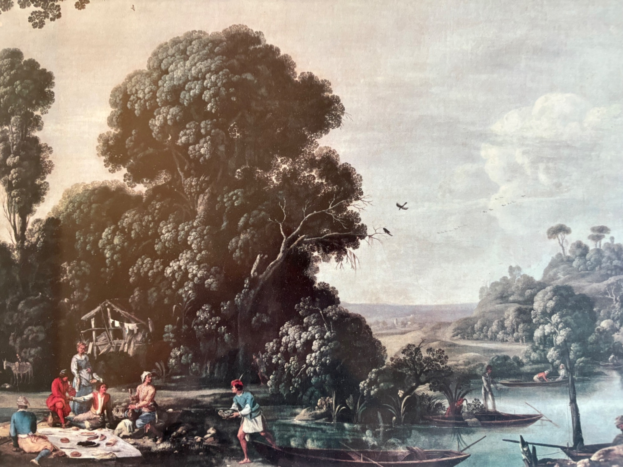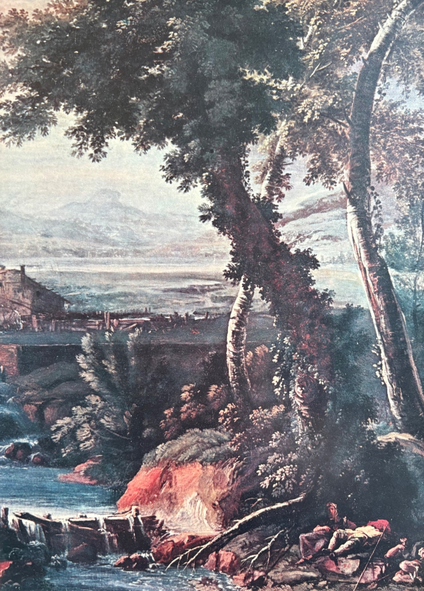Four reproduction landscape prints from various artists. Each has a slightly different frame and all are in good vintage condition. Camping scene by Augustino Tassi measures 19.75" H x 23.75" W x 1.75" D Winberg print measures 19" H x 23" W x 1.75" D: Landscape with old mill and lots of sky measures 17" H x 14" W x 2" D Riverside print with linen mat measures 17.25" H x 14" W x 1.75" D
