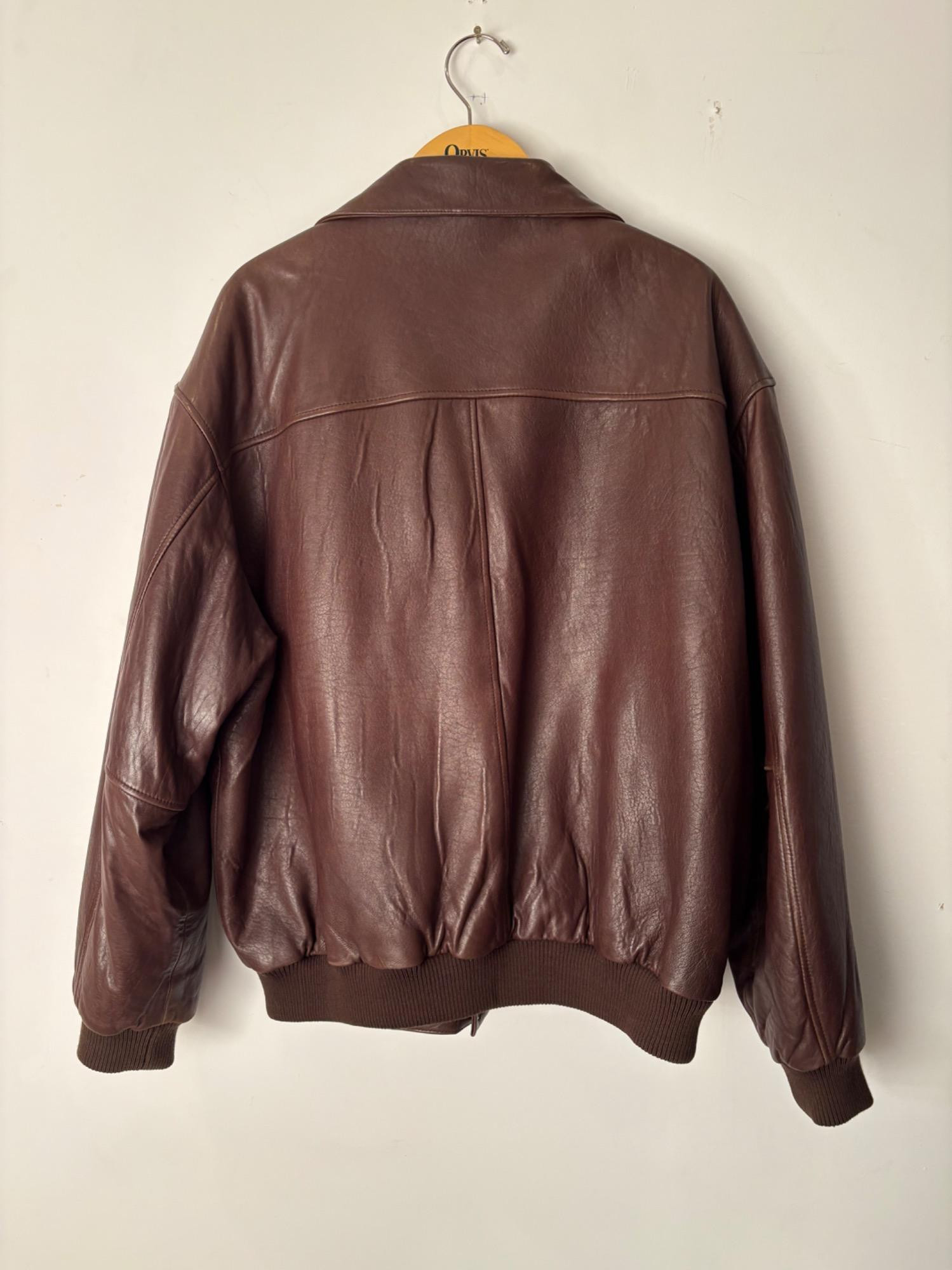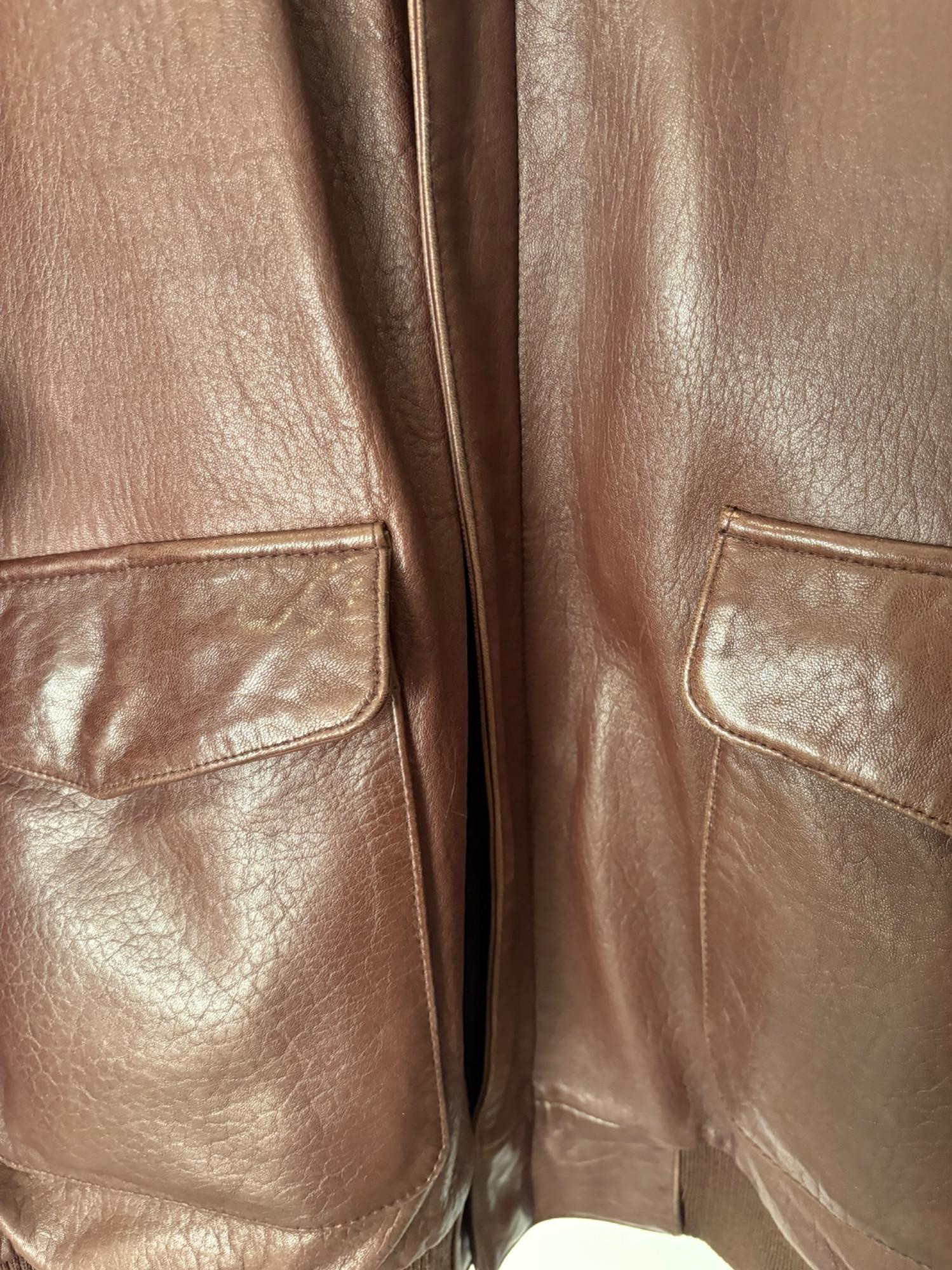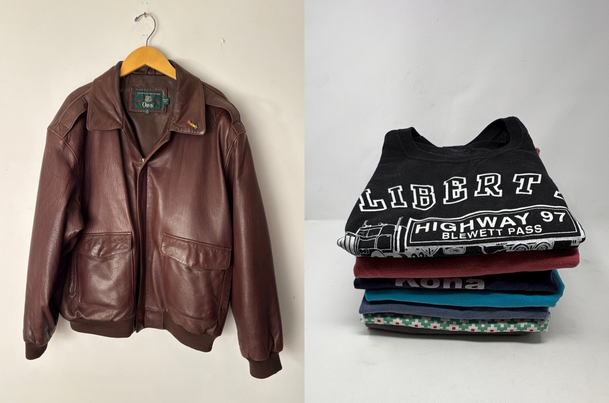 Jacket & t-shirt lot in large size; most we would consider XXL. Super-soft Orvis lambskin leather jacket with front patch pockets, welted slip-in pockets behind, elasticated knit on waist & cuffs, and an inside breast pocket. Size XXL with pit to pit measuring almost 30". In excellent condition with just a small pbit of barely noticeable wear at the back collar - see last photo. Mixed group of 7 t-shirts in XL/XXL sizes. No egregious stains noted, but collars removed and neck opening serged on several (our client hated tight necklines).See photos for details.