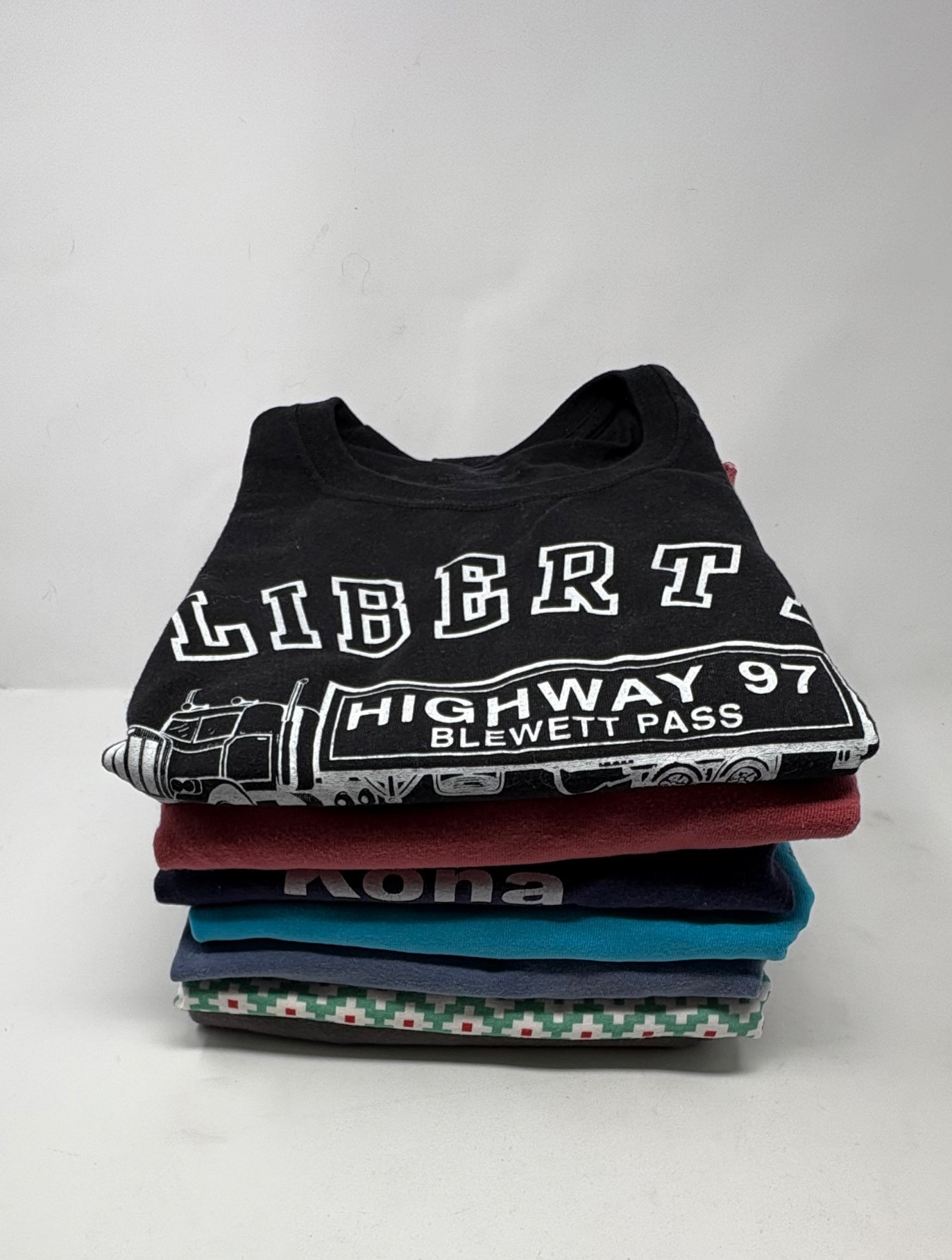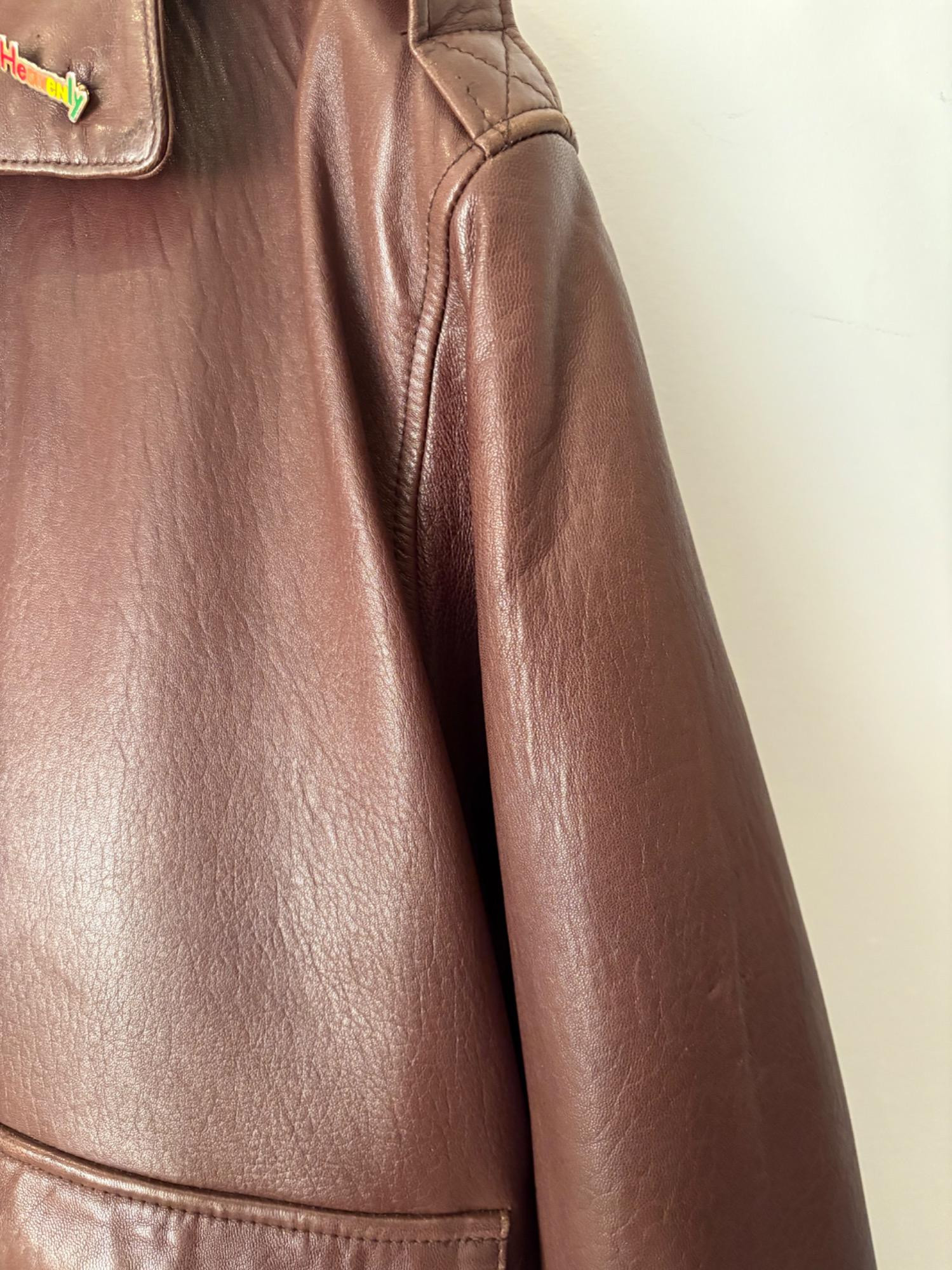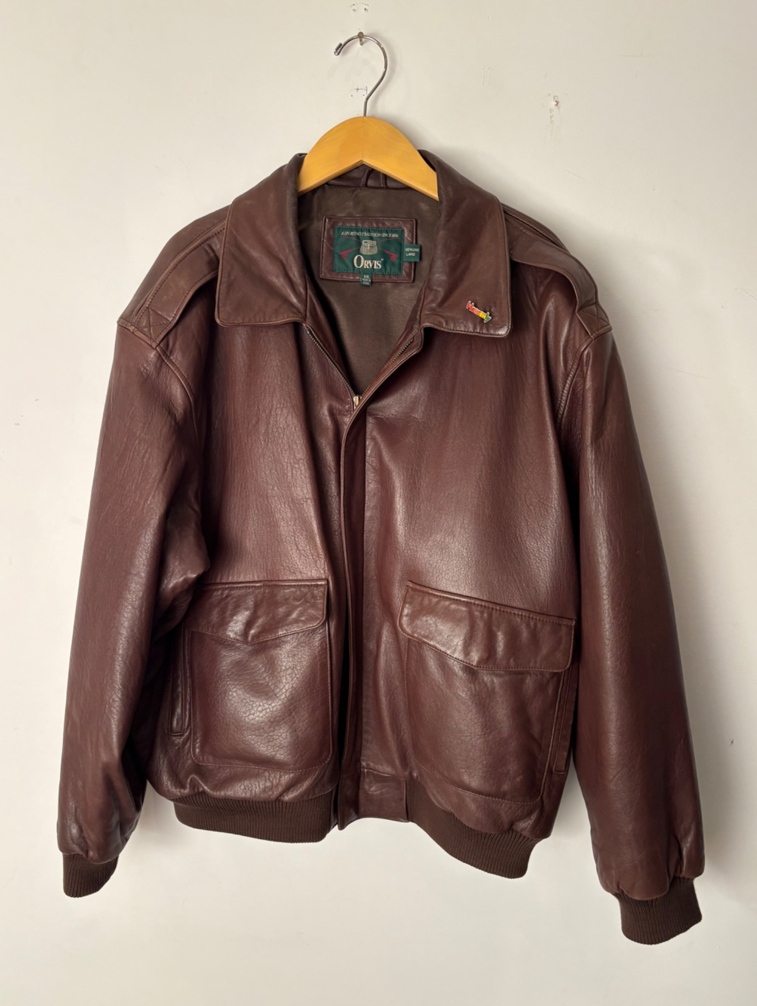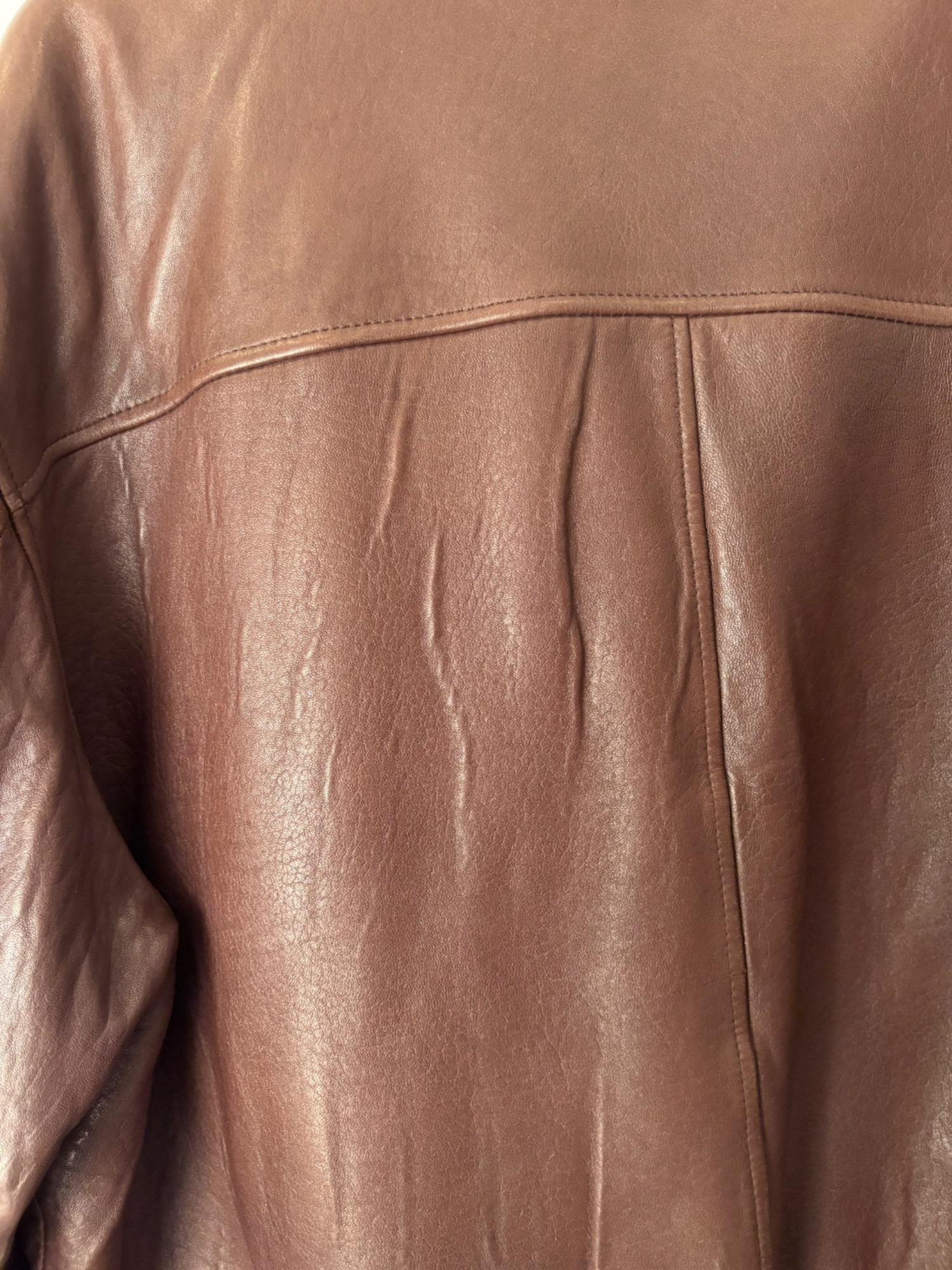 Jacket & t-shirt lot in large size; most we would consider XXL. Super-soft Orvis lambskin leather jacket with front patch pockets, welted slip-in pockets behind, elasticated knit on waist & cuffs, and an inside breast pocket. Size XXL with pit to pit measuring almost 30". In excellent condition with just a small pbit of barely noticeable wear at the back collar - see last photo. Mixed group of 7 t-shirts in XL/XXL sizes. No egregious stains noted, but collars removed and neck opening serged on several (our client hated tight necklines).See photos for details.