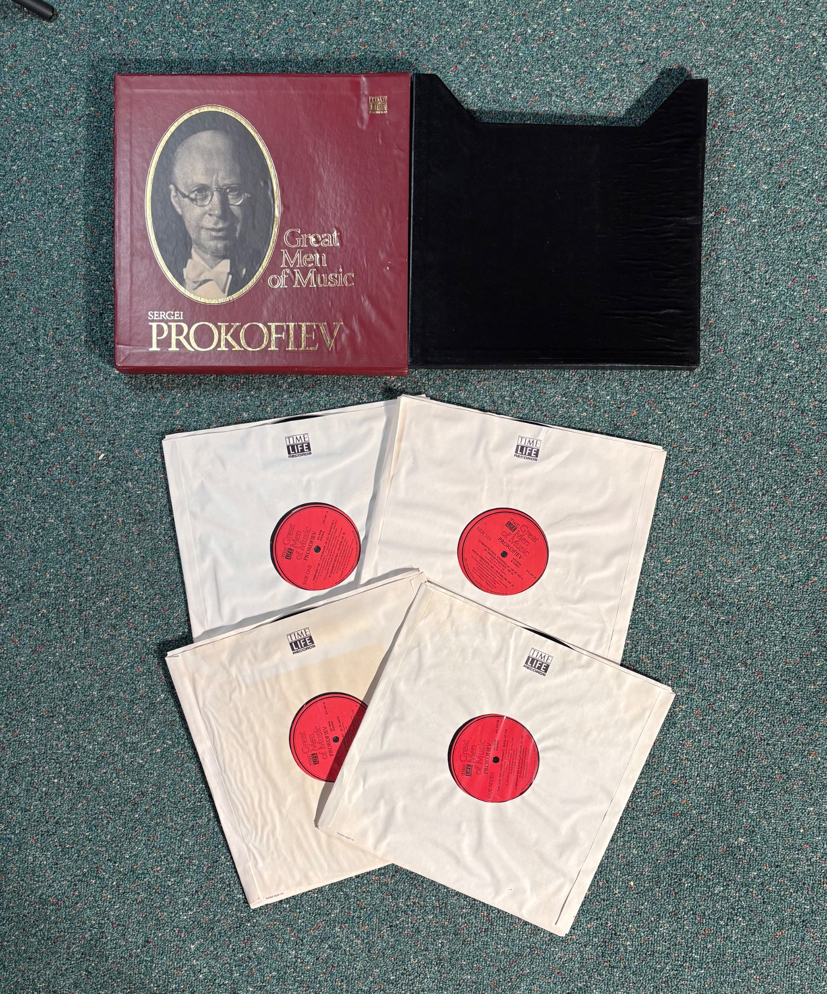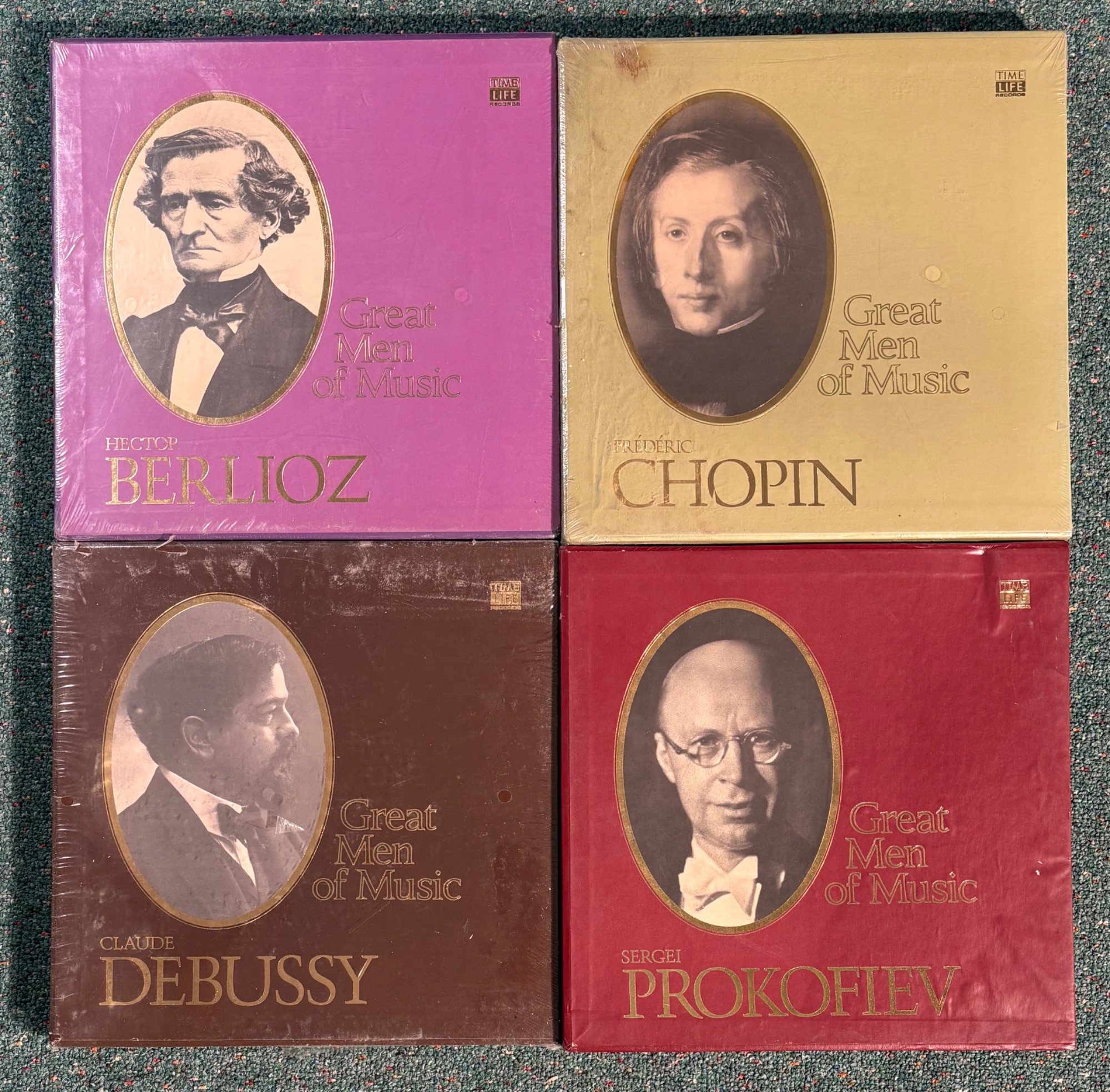 4 vintage boxed sets of Classical LPs from the Time-Life "Great Men of Music" Series. Each box contains 4 albums of the composers' most well-known compositions. We believe these are from the original release of the series in the 1970s. Frederick Chopin box is unopened. Claude Debussy box is unopened. Hector Berlioz box is unopened. Sergey Prokofiev box is opened but in good condition. for more info: https://www.classicalmusicguide.com/viewtopic.php?t=39815