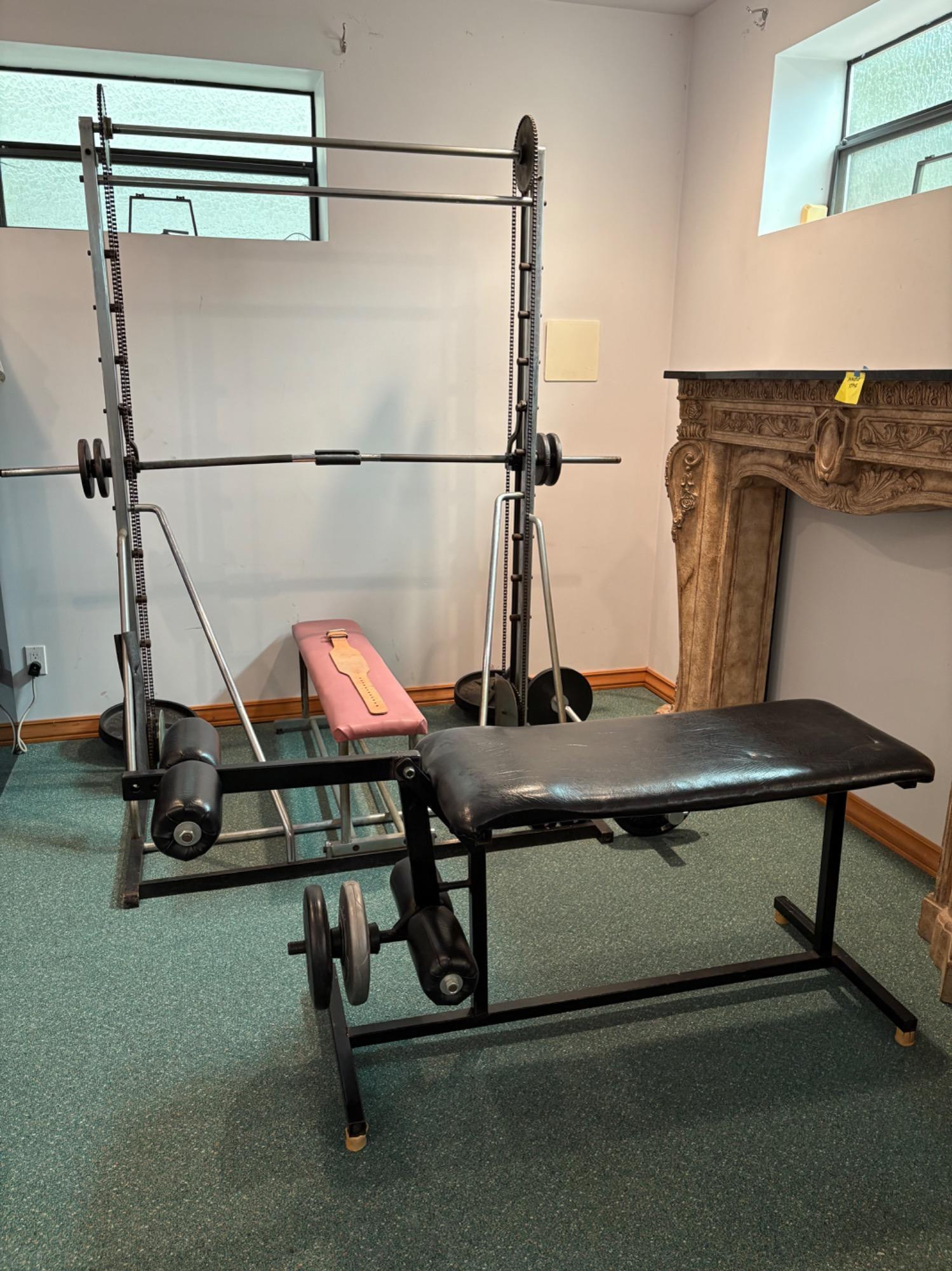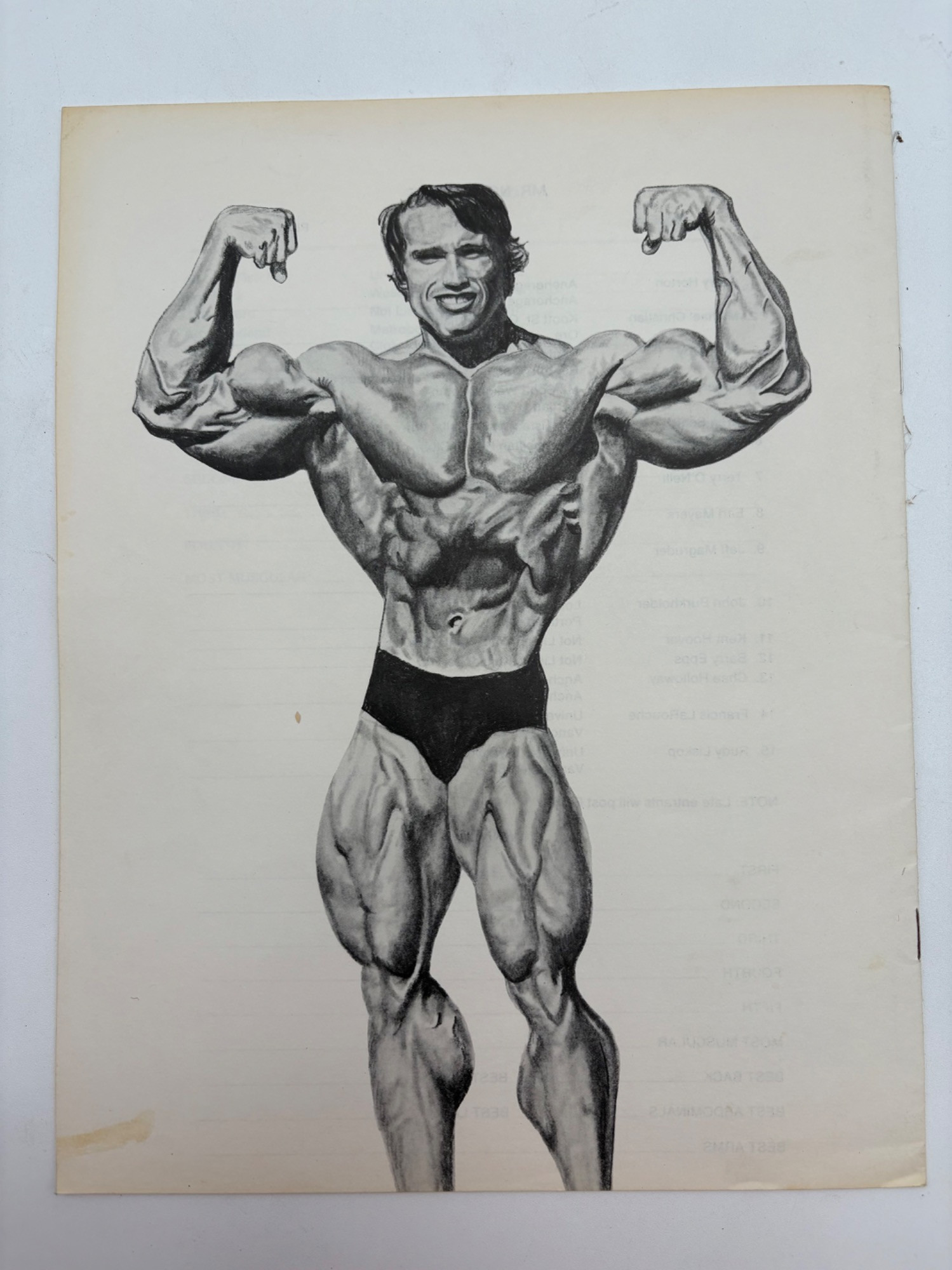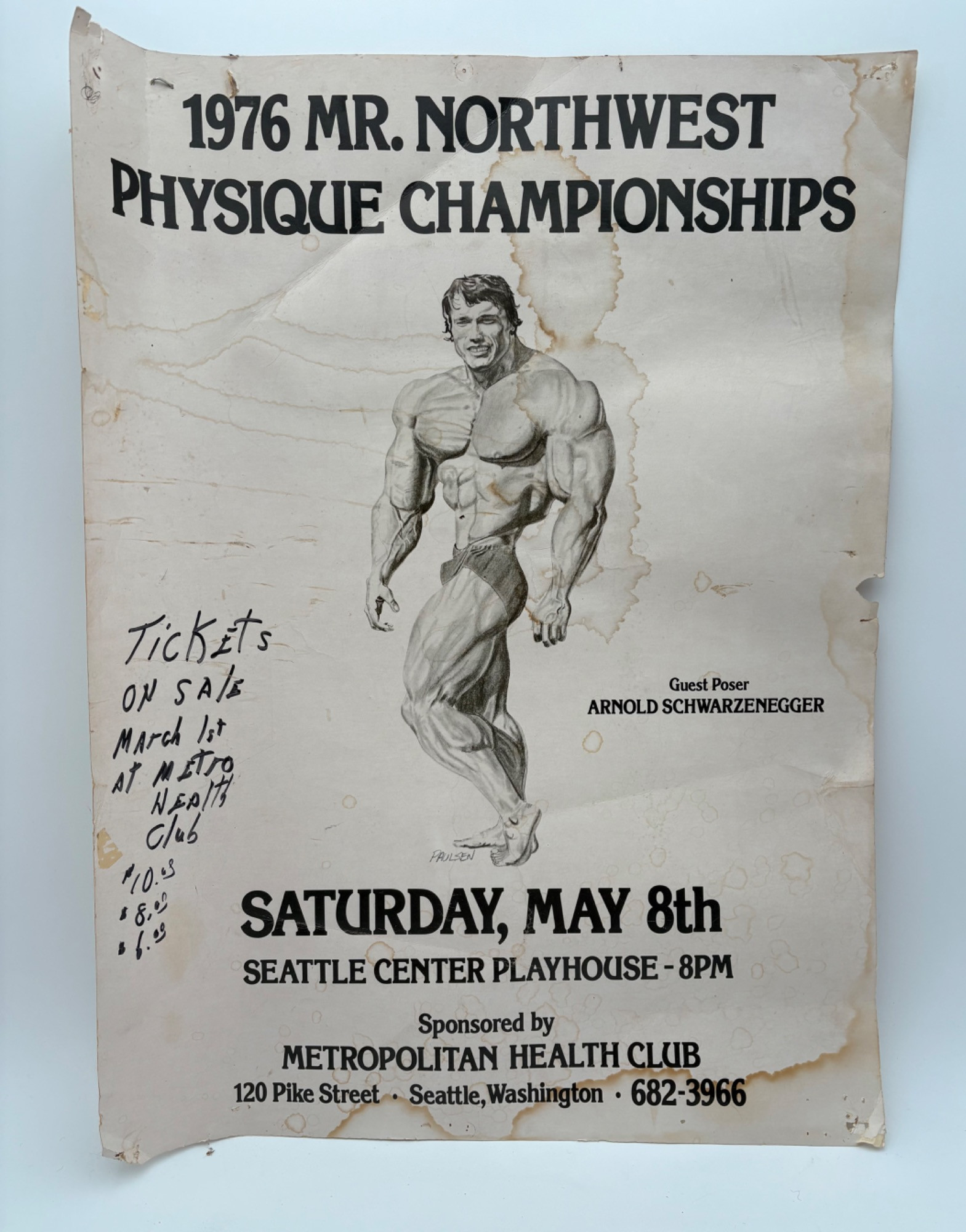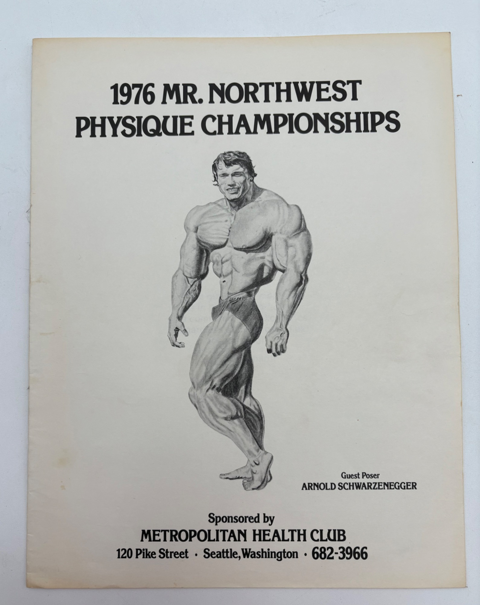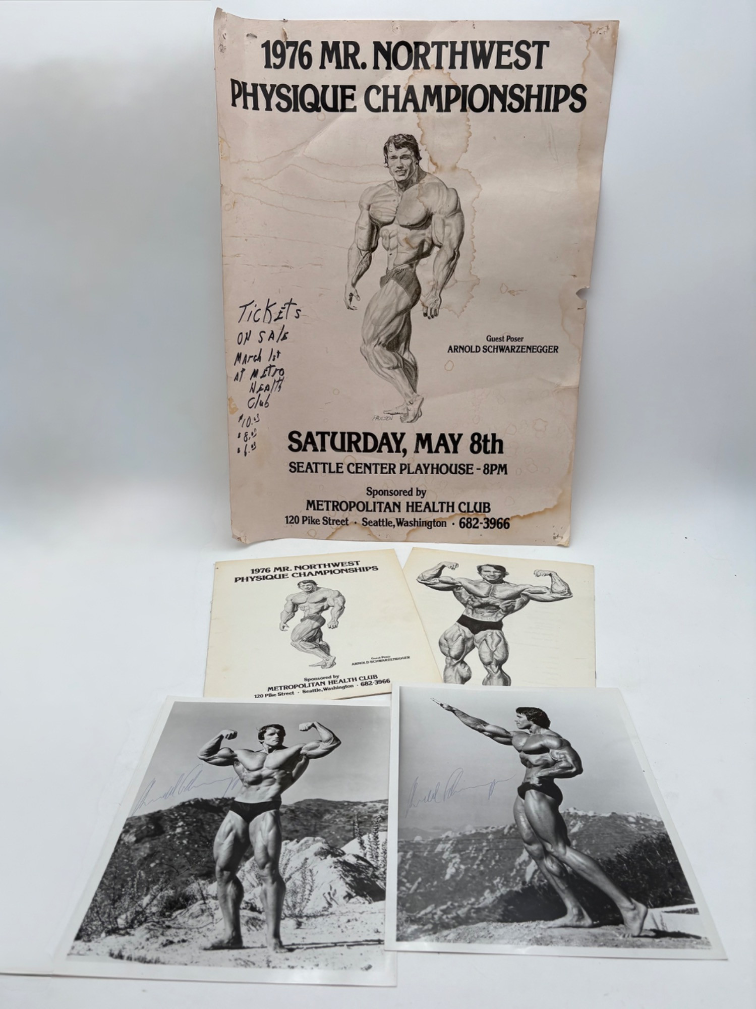 Free weight set with two benches. Pulley-equipped lift bar and multiple weights. Weights are in various denominations from hand weights to 35lbs. What you see in the pictures is what you get. Also included is a size "small" leather weight belt. BONUS - Ephemera from Arnold Schwarzenegger’s guest appearance at the 1976 Mr. Northwest Physique Championships. Includes a wall poster (water stained & a bit bent), programs for the competition (in pretty good shape), and 2 different 8" x 10" black-and-white photos (great condition) signed in blue ball point pen by Arnold. Hopefully this is in inspiration for you! Local Pickup Only. Bidding on this lot is an agreement that: (1.) You will have 2 capable, able-bodied persons to lift and load at a minimum. (2.) You will bring a hand truck and/or any other tools needed to remove this item. If these steps are not followed your item will be forfeited and no refund given.