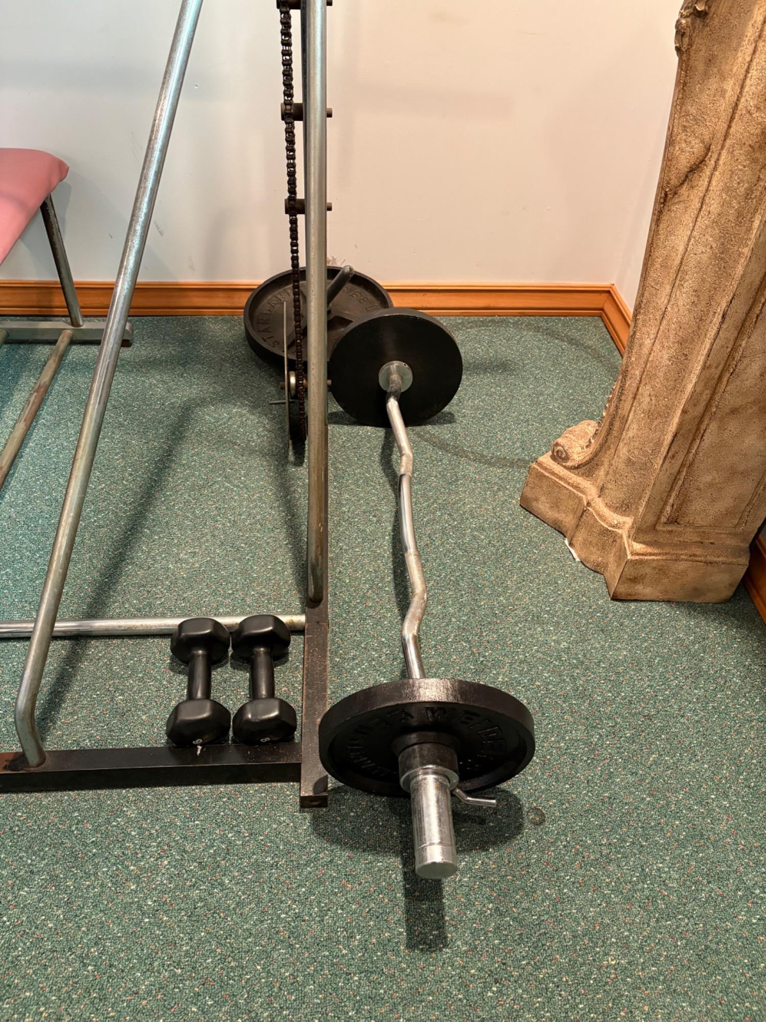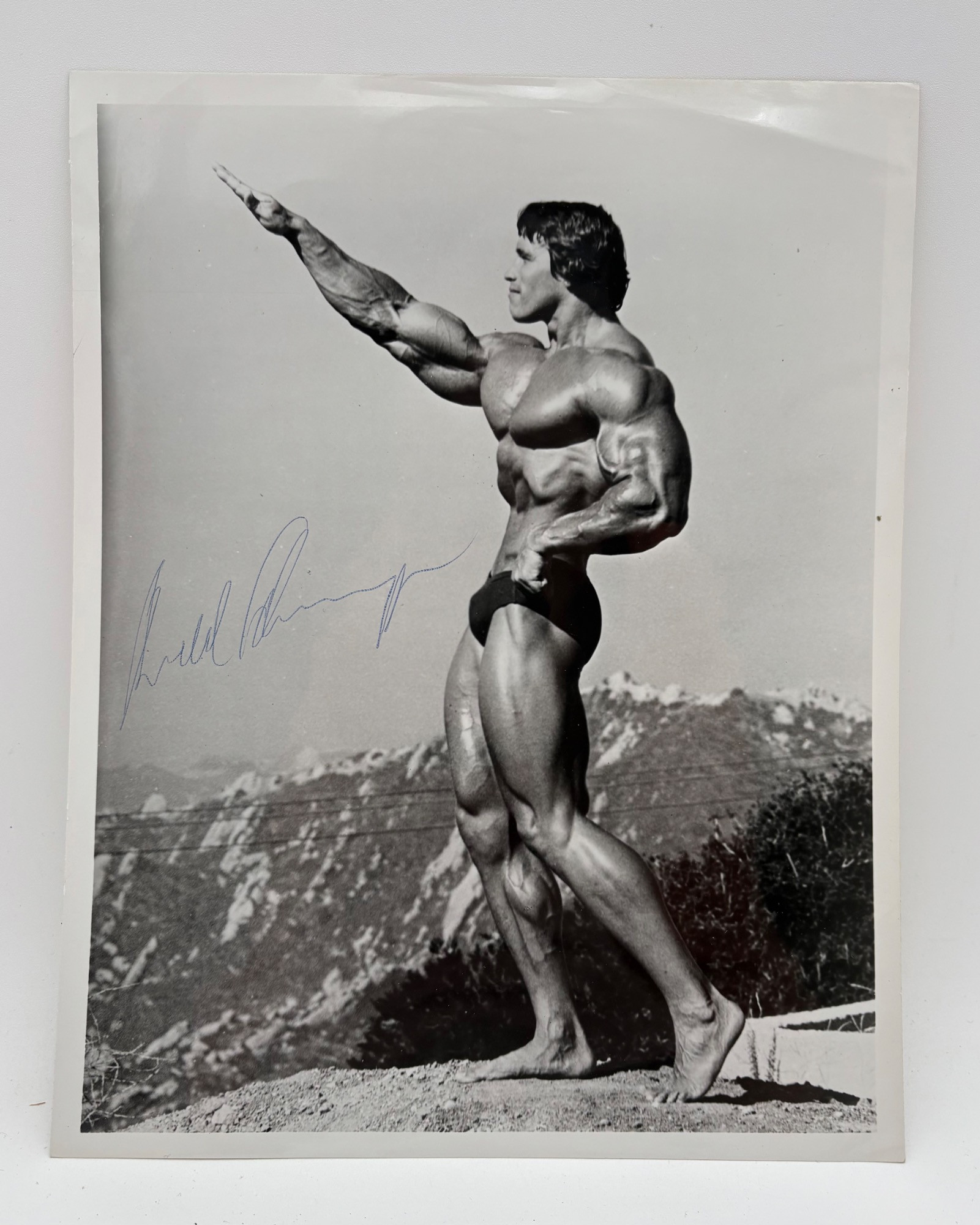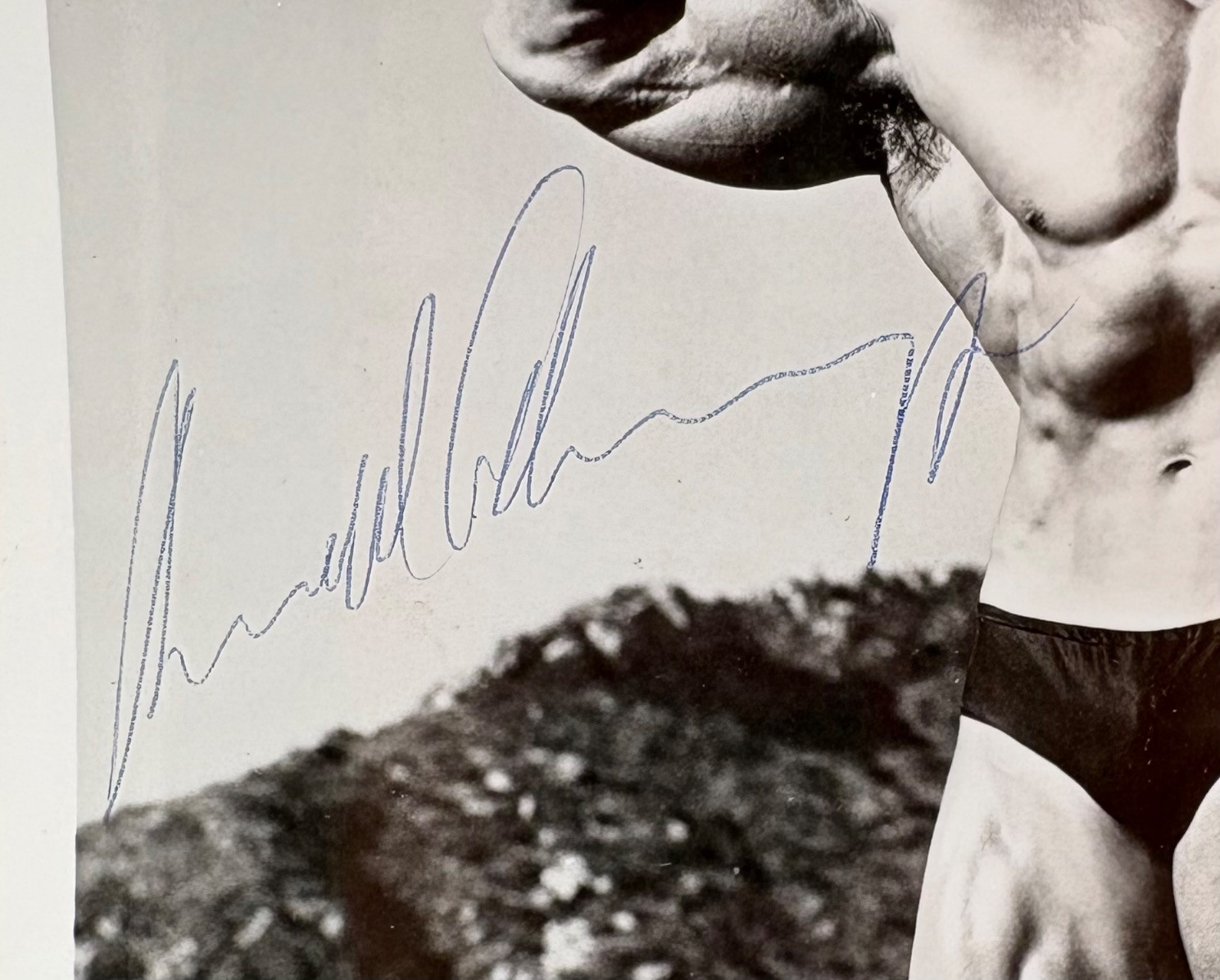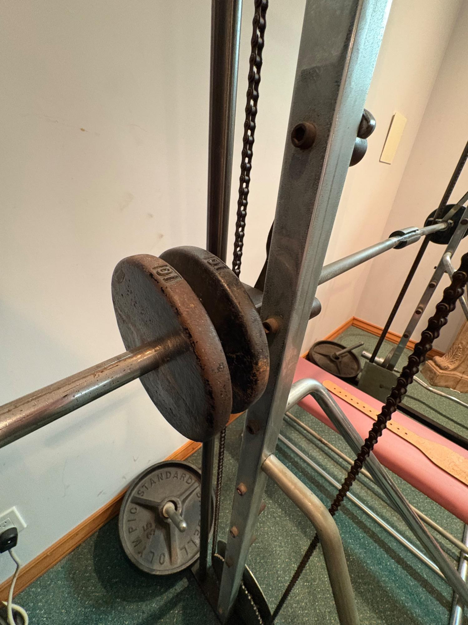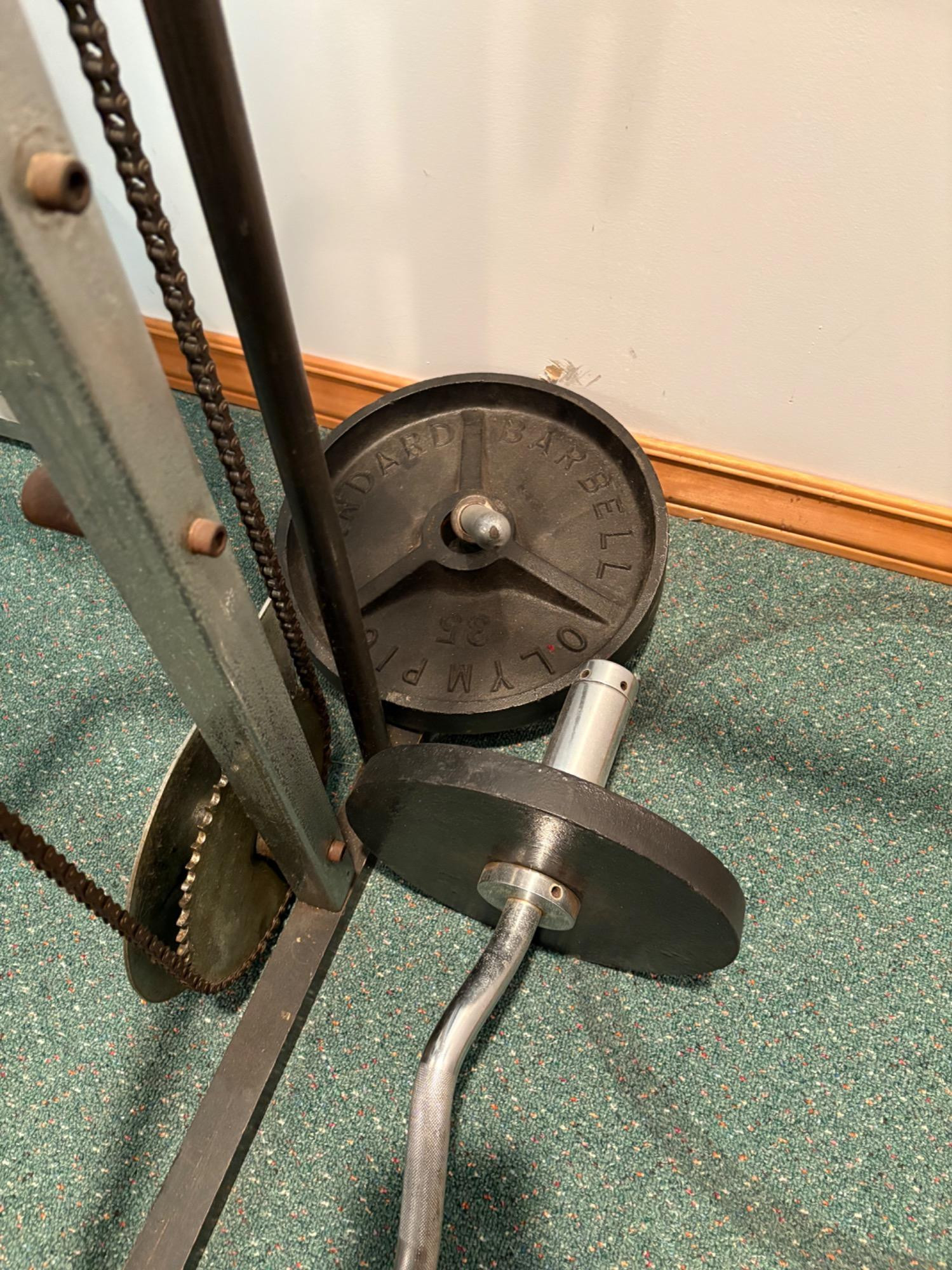 Free weight set with two benches. Pulley-equipped lift bar and multiple weights. Weights are in various denominations from hand weights to 35lbs. What you see in the pictures is what you get. Also included is a size "small" leather weight belt. BONUS - Ephemera from Arnold Schwarzenegger’s guest appearance at the 1976 Mr. Northwest Physique Championships. Includes a wall poster (water stained & a bit bent), programs for the competition (in pretty good shape), and 2 different 8" x 10" black-and-white photos (great condition) signed in blue ball point pen by Arnold. Hopefully this is in inspiration for you! Local Pickup Only. Bidding on this lot is an agreement that: (1.) You will have 2 capable, able-bodied persons to lift and load at a minimum. (2.) You will bring a hand truck and/or any other tools needed to remove this item. If these steps are not followed your item will be forfeited and no refund given.
