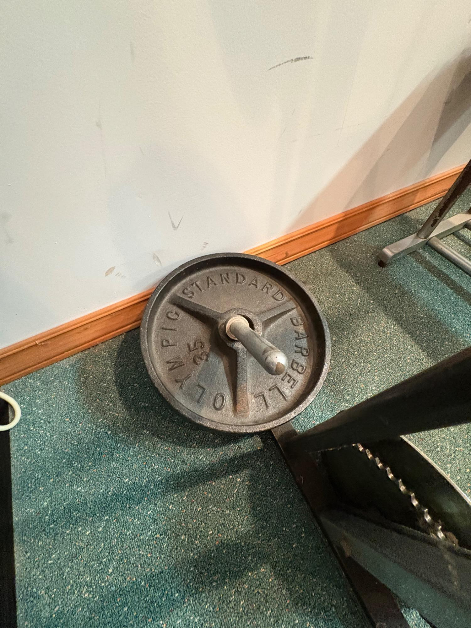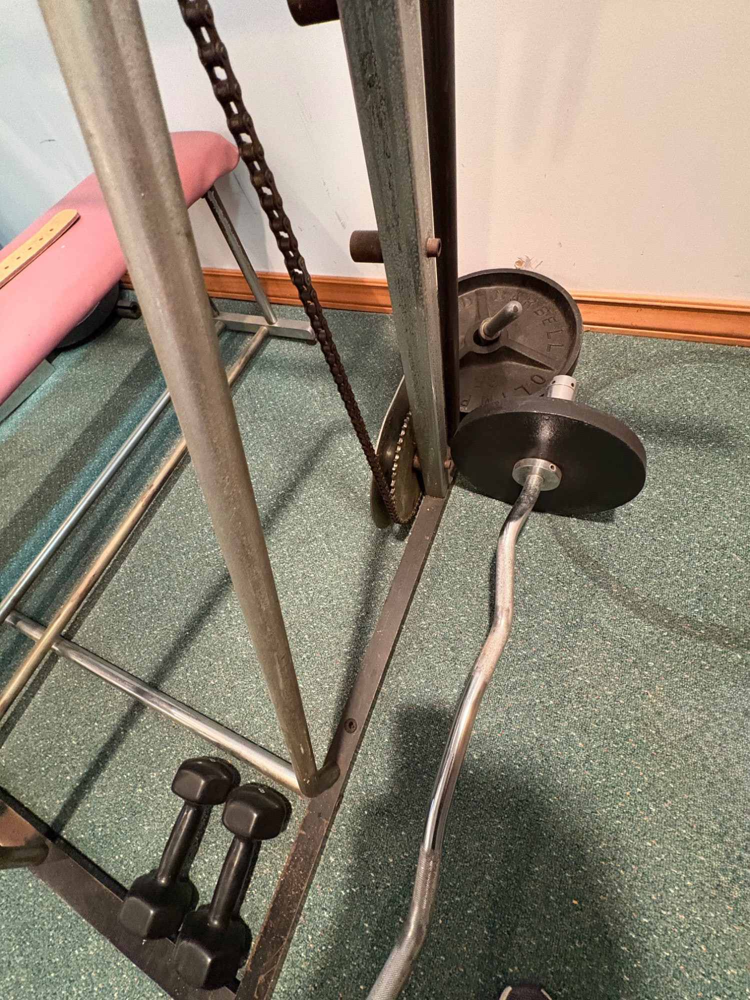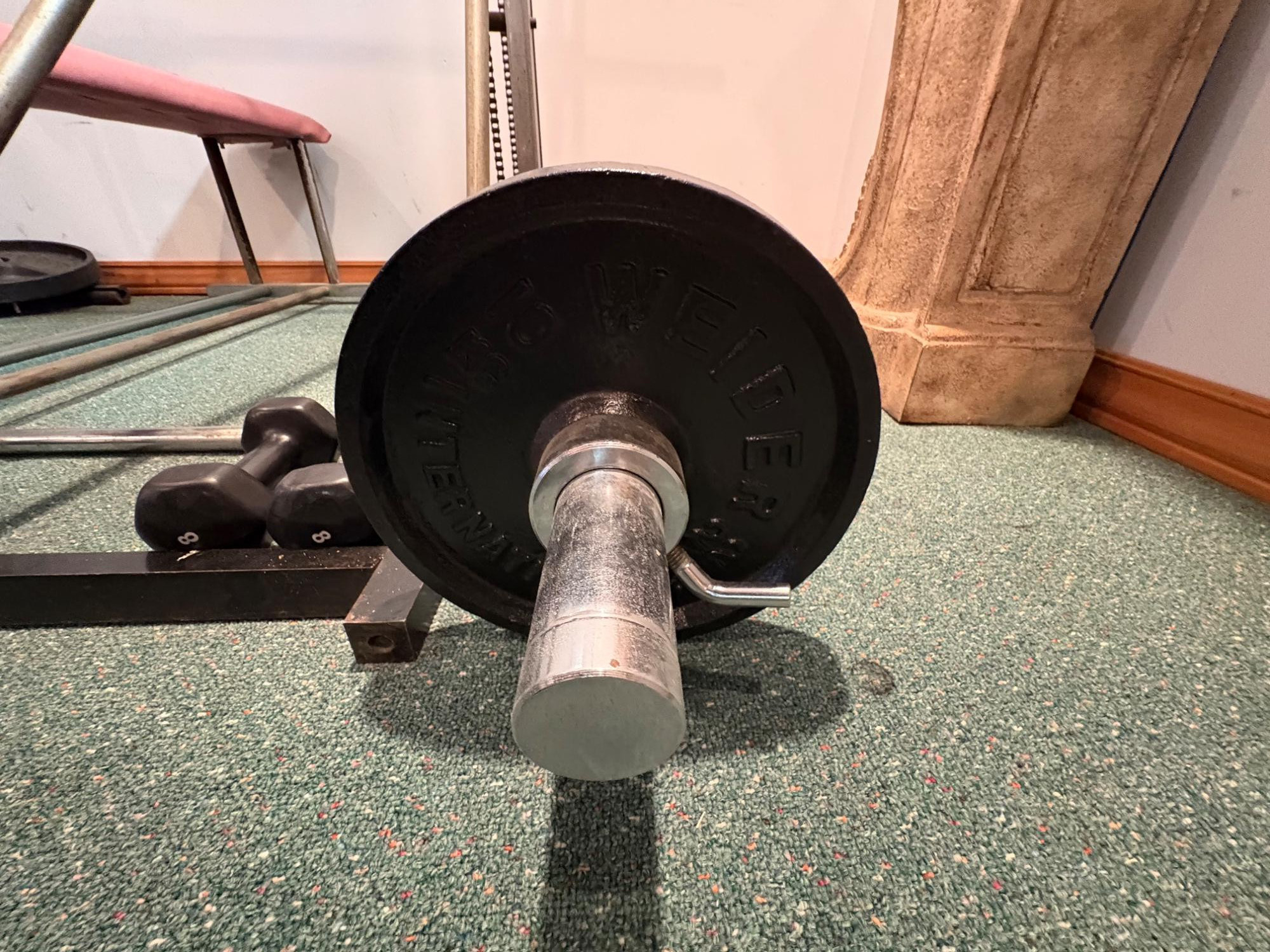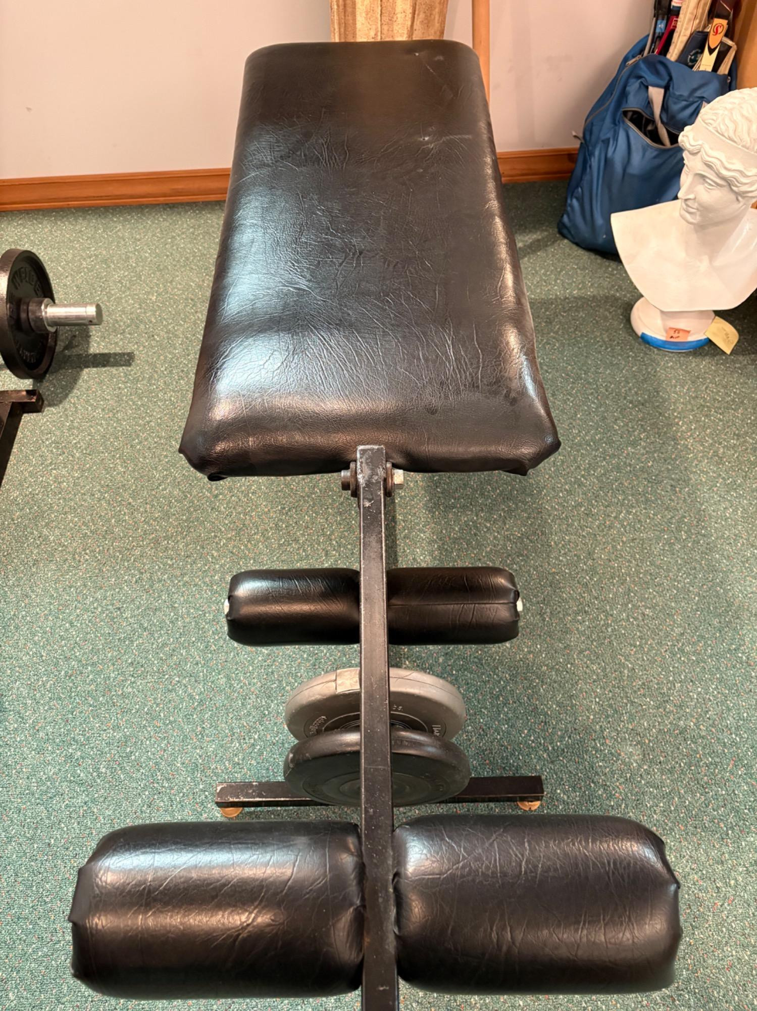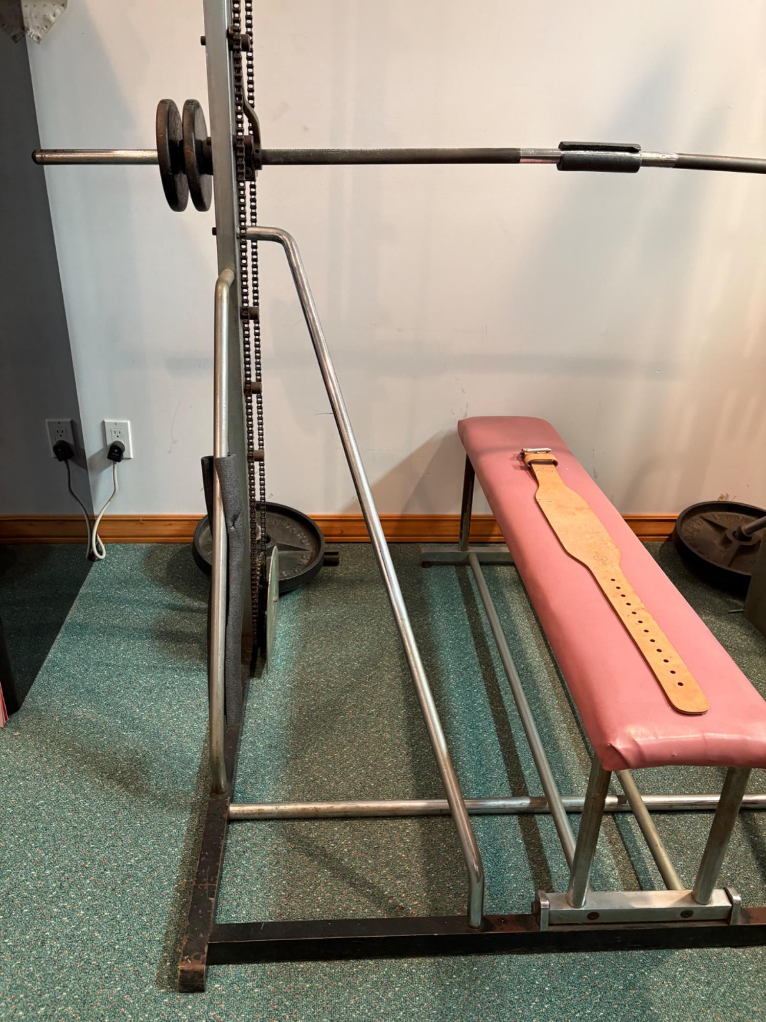 Free weight set with two benches. Pulley-equipped lift bar and multiple weights. Weights are in various denominations from hand weights to 35lbs. What you see in the pictures is what you get. Also included is a size "small" leather weight belt. BONUS - Ephemera from Arnold Schwarzenegger’s guest appearance at the 1976 Mr. Northwest Physique Championships. Includes a wall poster (water stained & a bit bent), programs for the competition (in pretty good shape), and 2 different 8" x 10" black-and-white photos (great condition) signed in blue ball point pen by Arnold. Hopefully this is in inspiration for you! Local Pickup Only. Bidding on this lot is an agreement that: (1.) You will have 2 capable, able-bodied persons to lift and load at a minimum. (2.) You will bring a hand truck and/or any other tools needed to remove this item. If these steps are not followed your item will be forfeited and no refund given.