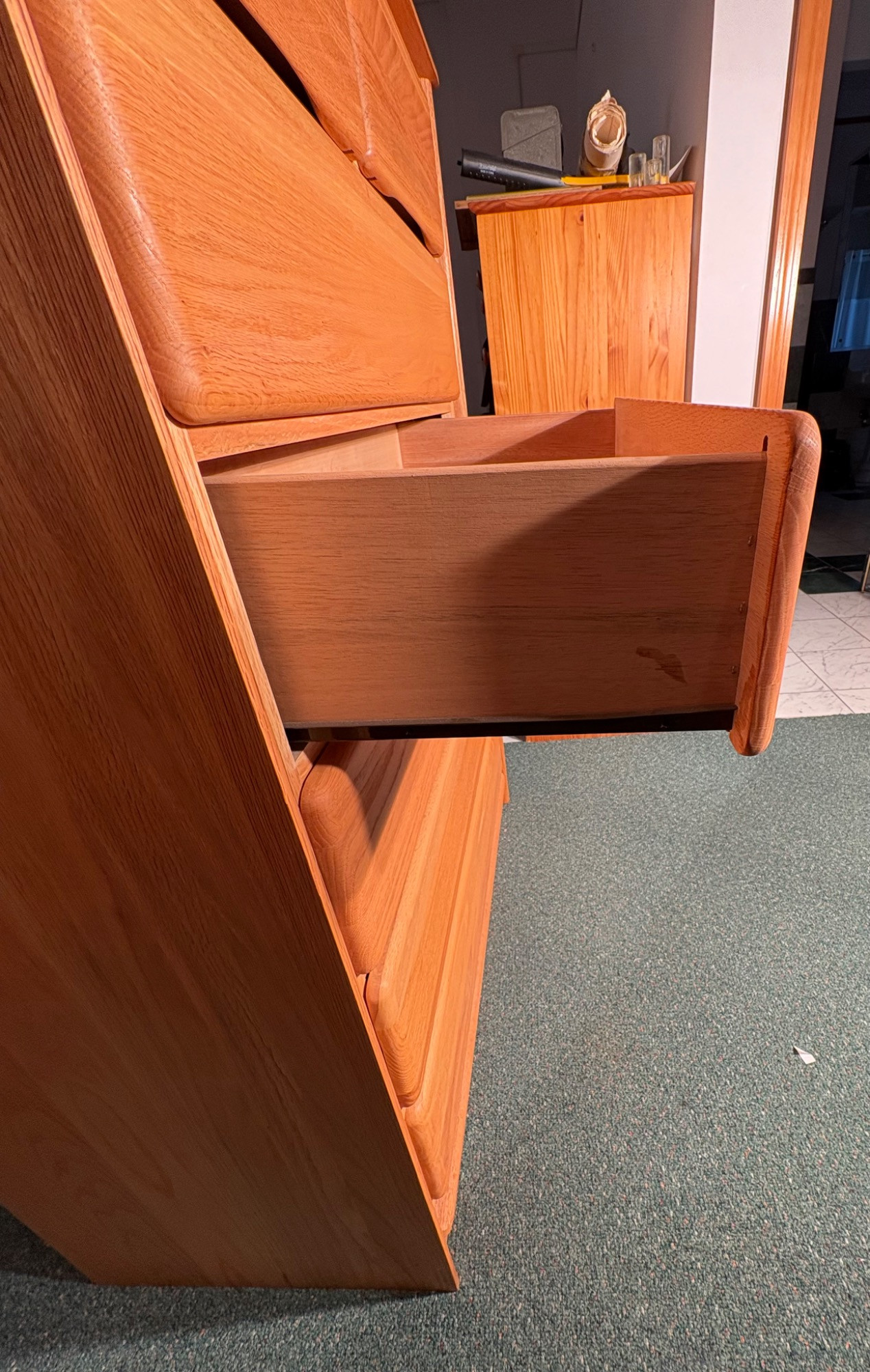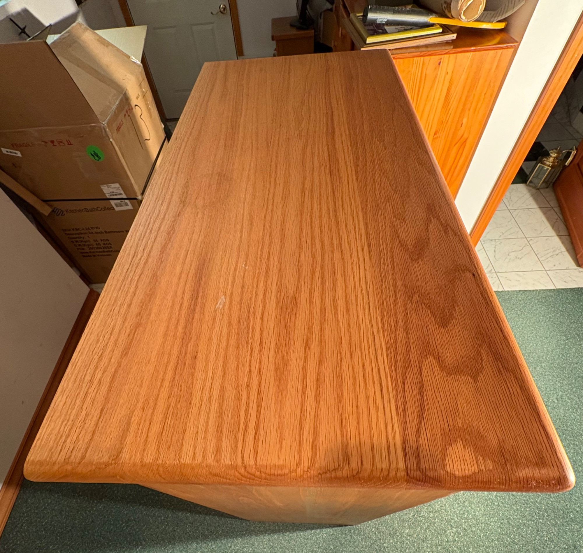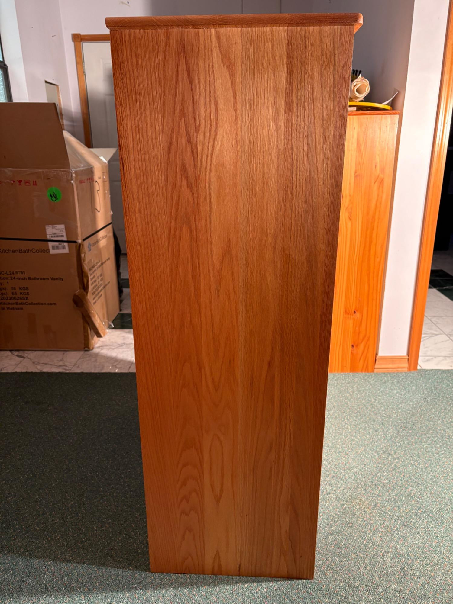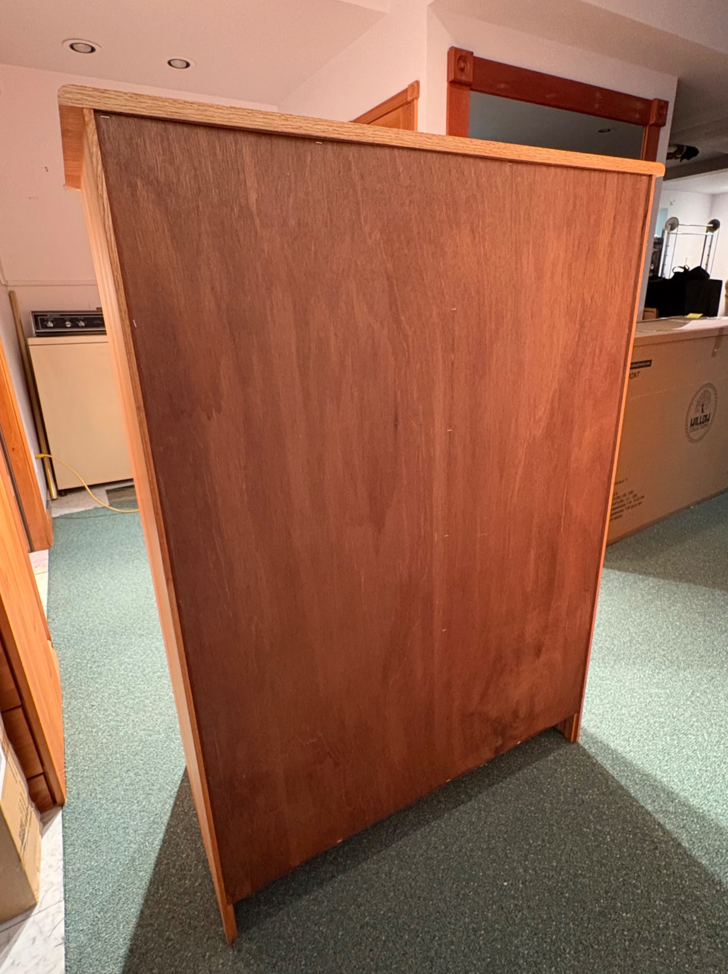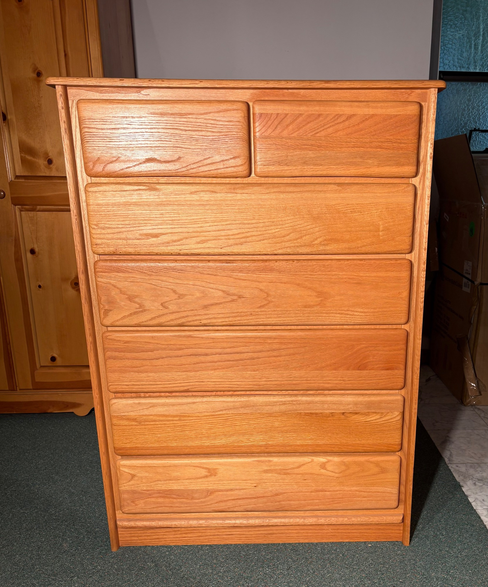 All wood with 7 drawers; 2 smaller ones on top and 5 wide ones. Drawer edges are rounded with cut-out finger pulls at the bottom of drawers. Made in USA. The front and side of the chest are flawless. The top has 2 very minor flaw areas - one appears to be something stuck on which might come off with Goop Off while the other is a light coffee ring stain that might also be able to be removed. Measures 52.5" H x 38" W x 19" D. Matches other chests of drawers in Lots #27 & #59. Local Pickup Only. Bidding on this lot is an agreement that you will bring a hand truck and/or any other tools needed to remove this item. If these steps are not followed your item will be forfeited and no refund given.