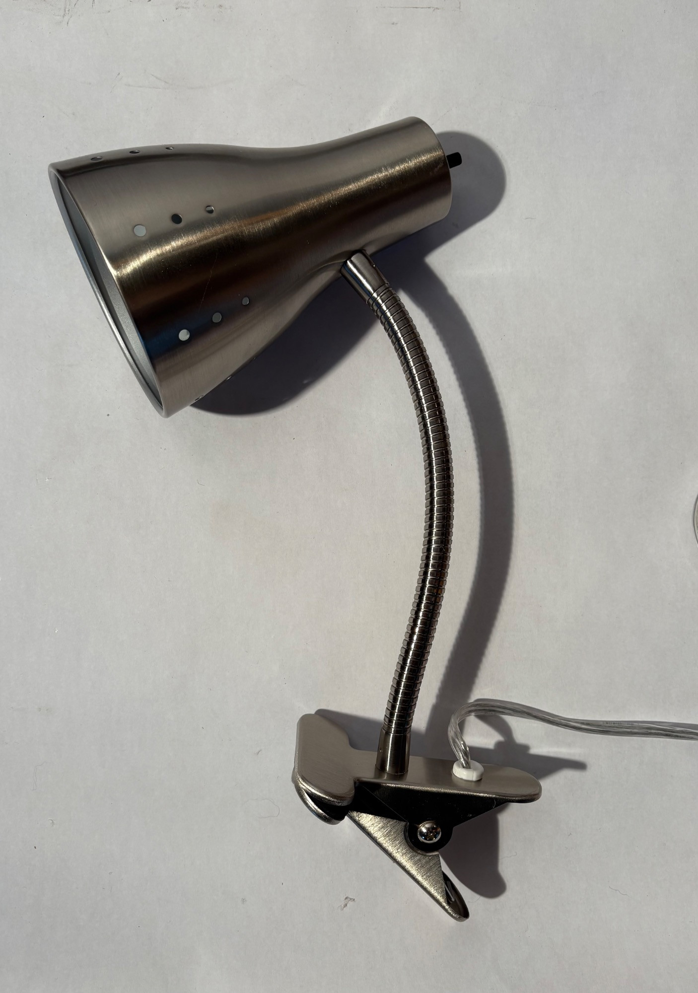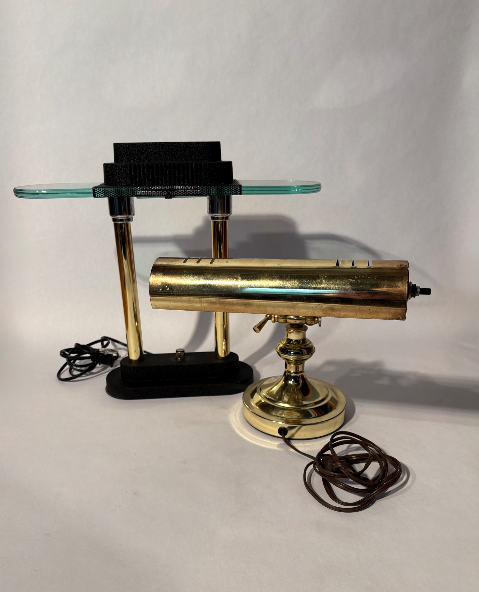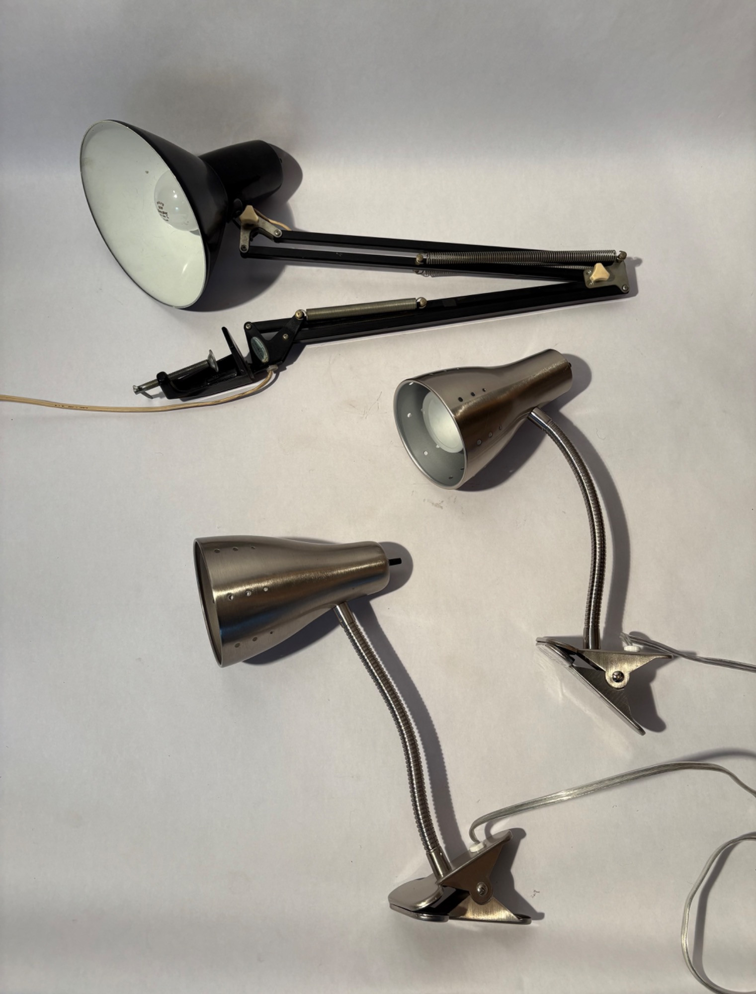 5 contemporary-style table/portable lamps. All are working. - Black & gold halogen column lamp with dimmer dial. - Gold traditional desk lamp with adjustable swivel. - Black screw-on adjustable table-edge work lamp. - 2 silver perforated MCM-style clip-on lights. For size comparison, the halogen light measures approx. 16" H.