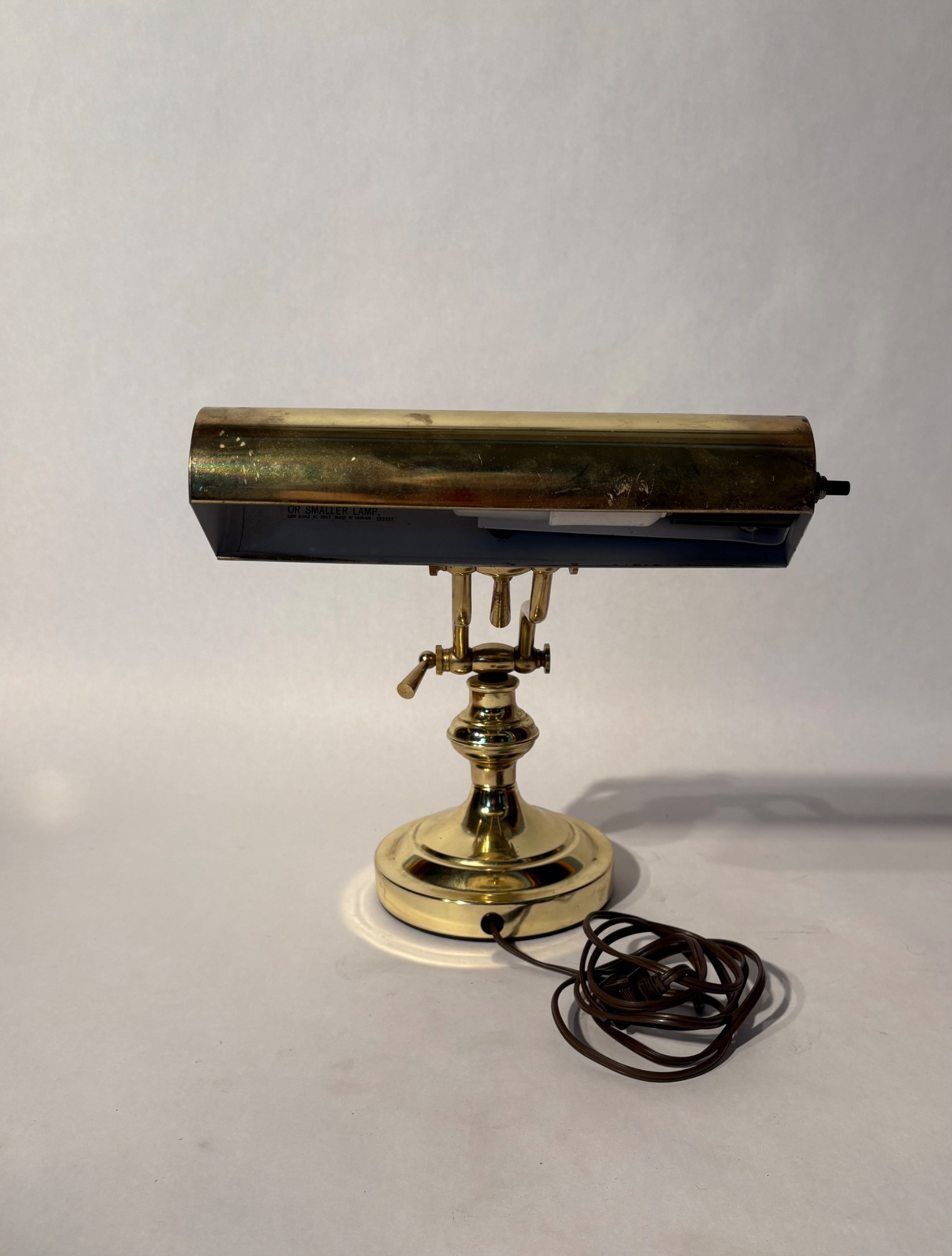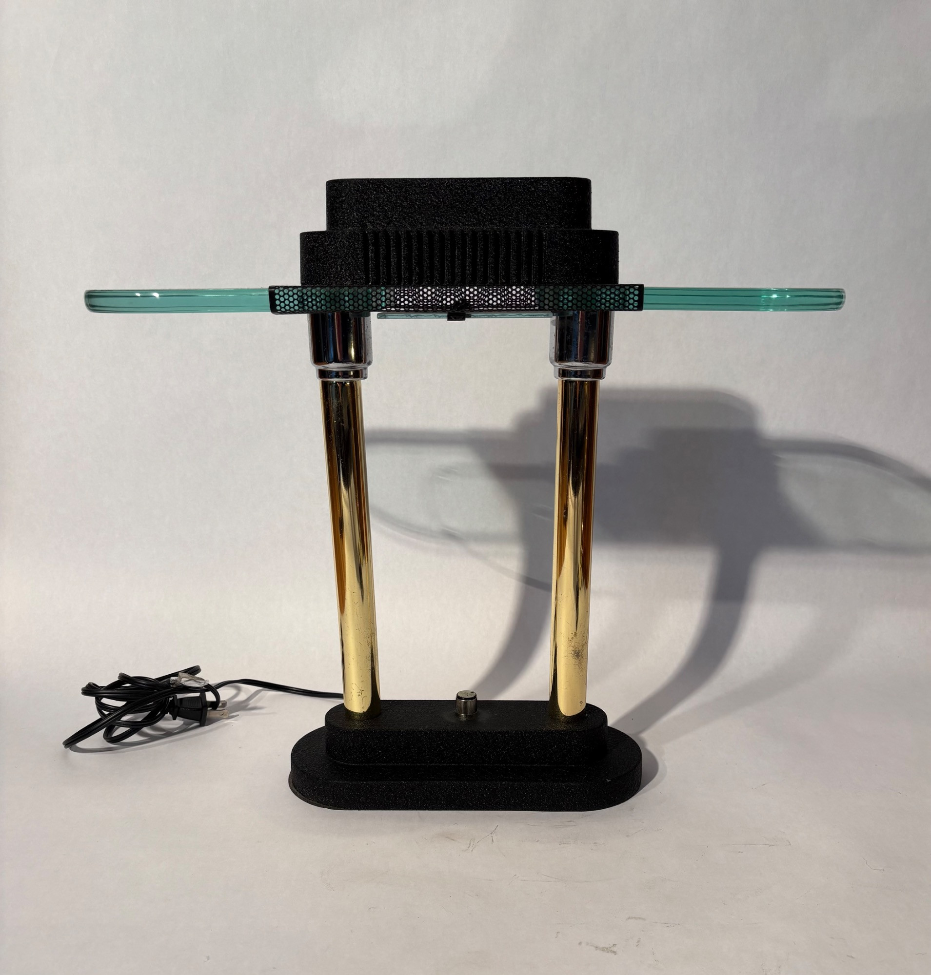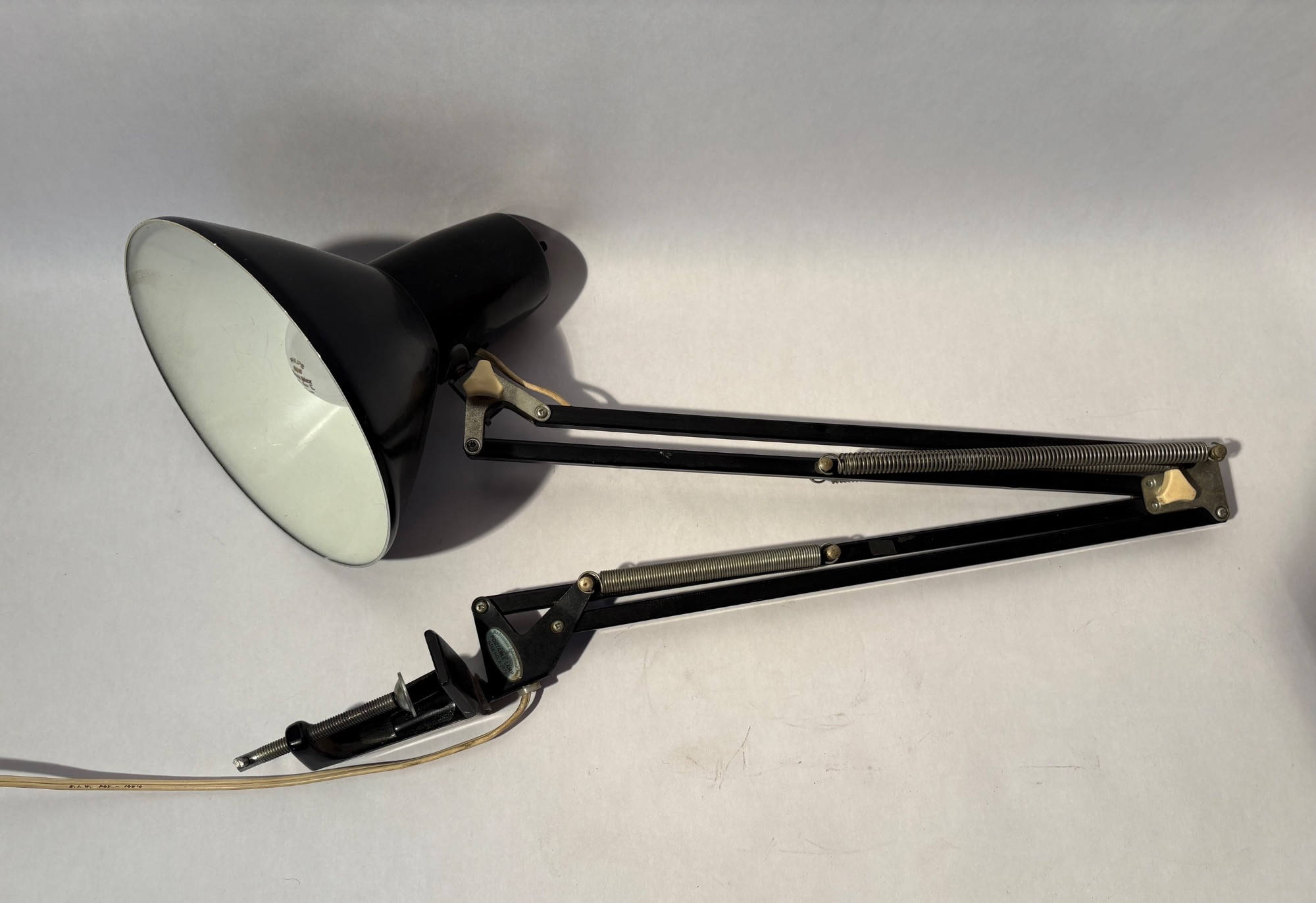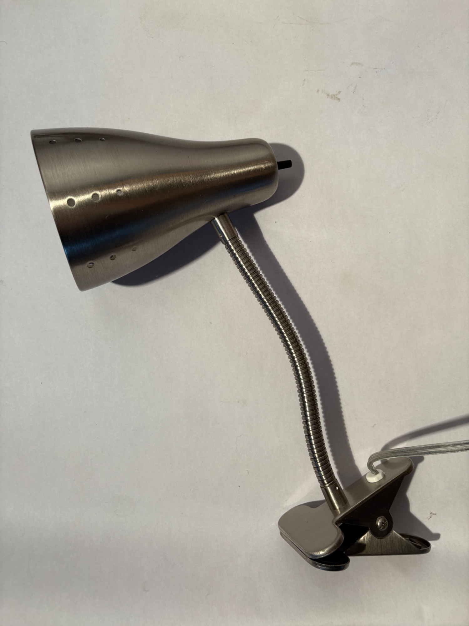 5 contemporary-style table/portable lamps. All are working. - Black & gold halogen column lamp with dimmer dial. - Gold traditional desk lamp with adjustable swivel. - Black screw-on adjustable table-edge work lamp. - 2 silver perforated MCM-style clip-on lights. For size comparison, the halogen light measures approx. 16" H.