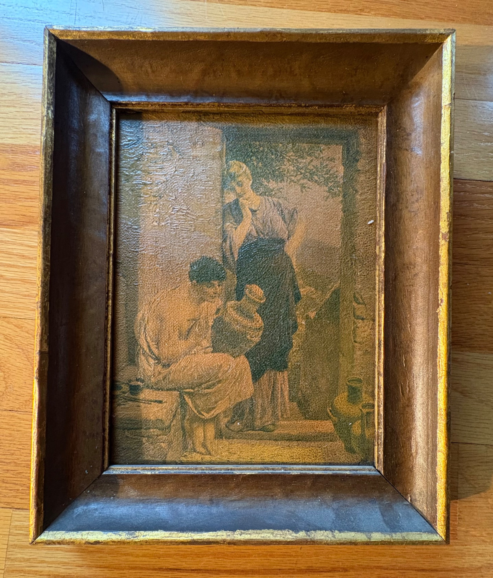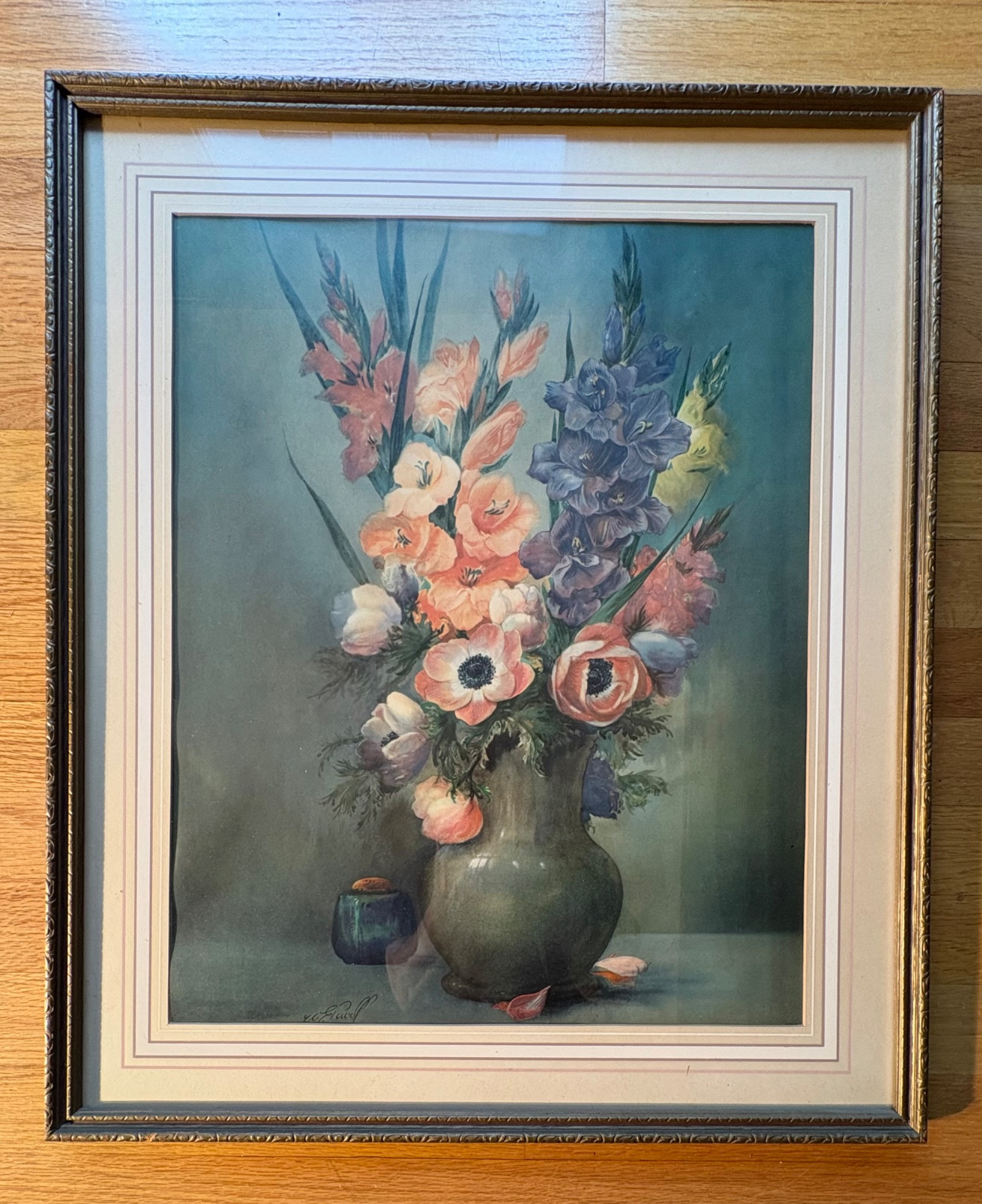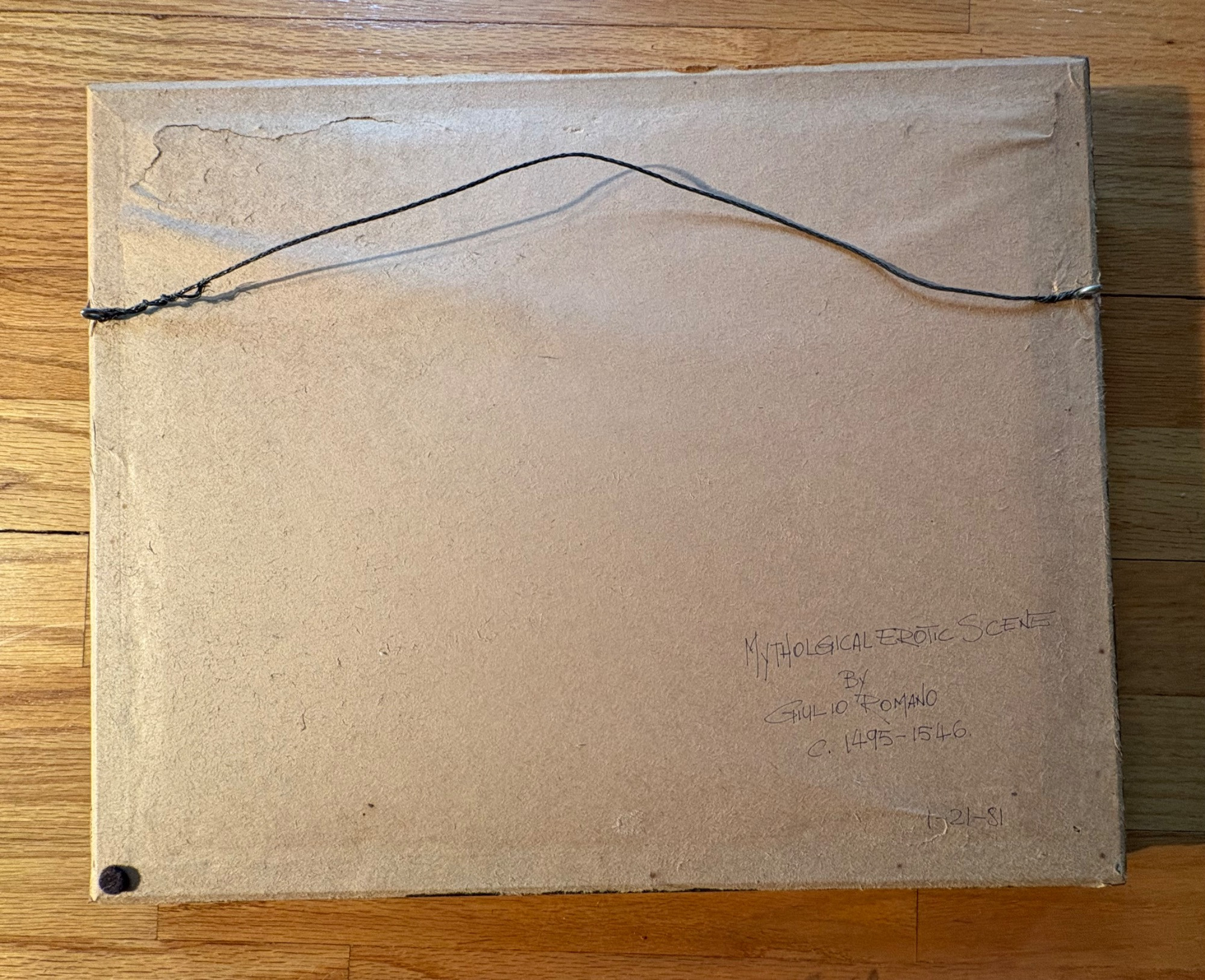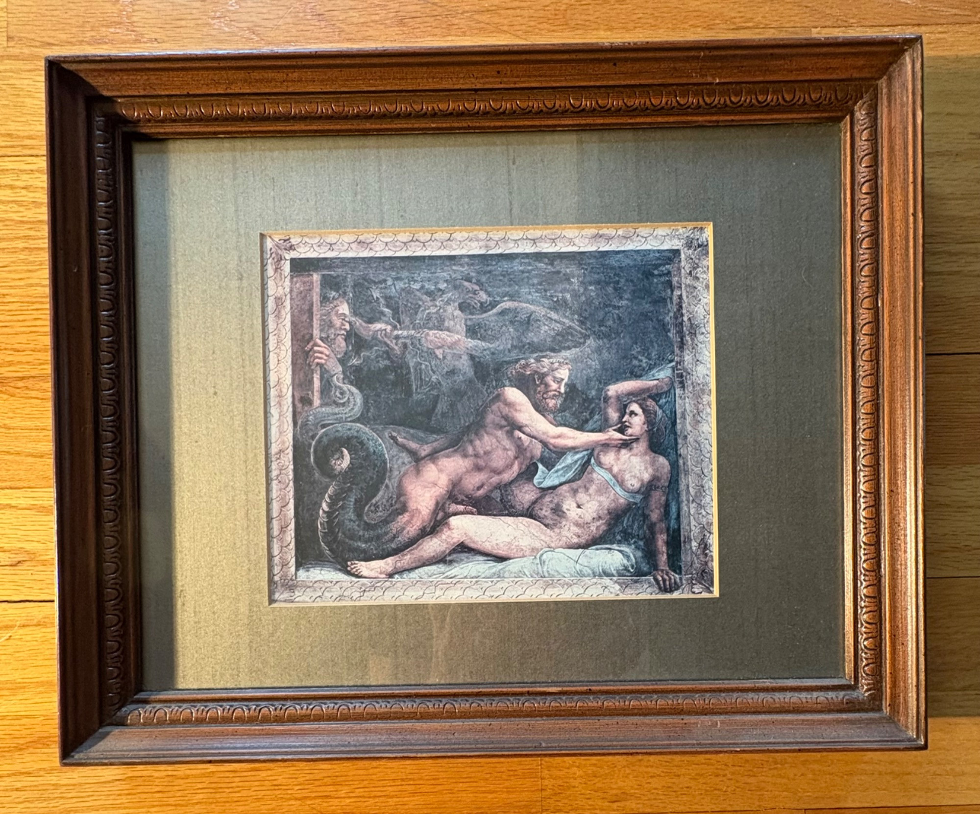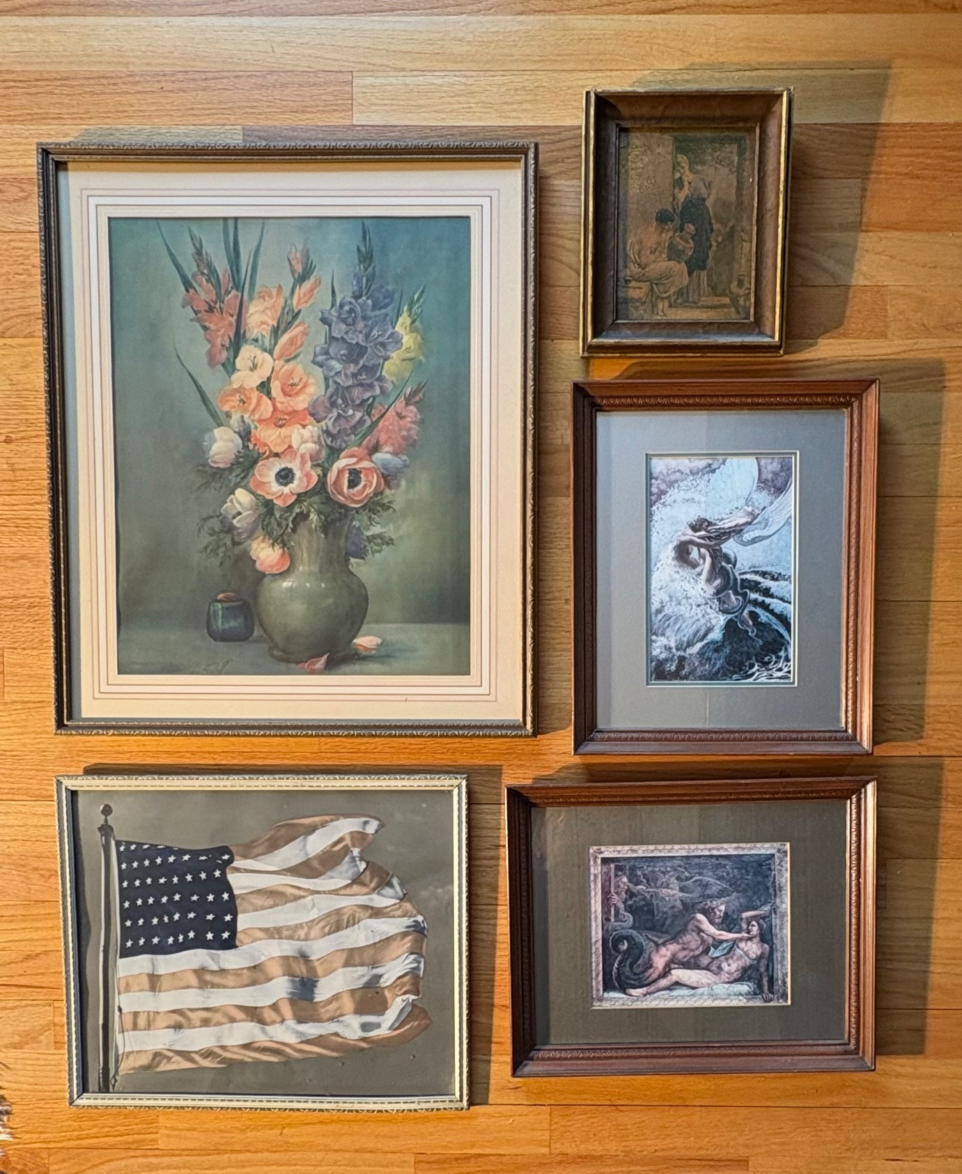 5 vintage art pieces all framed with varying mats and themes. Note that all are vintage reproduction prints rather than reproduction paintings with exception of the last piece - it is a very old reproduction painting on canvas. Floral still life measures 25" H x 21" W. Vintage flag print (48 stars) measures 15" H x 18" W. Carlos Schwab water scene print measures 15.75" H x 12.75" W Julio Romano mythological scene measures 12.75" H x 15.75" W. Unknown artist reproduction painting on canvas measures 10.5" H x 8.5" W. This one is quite old and shows its age; reverse confirms age. All are in OK vintage shape, but really need a good cleaning.