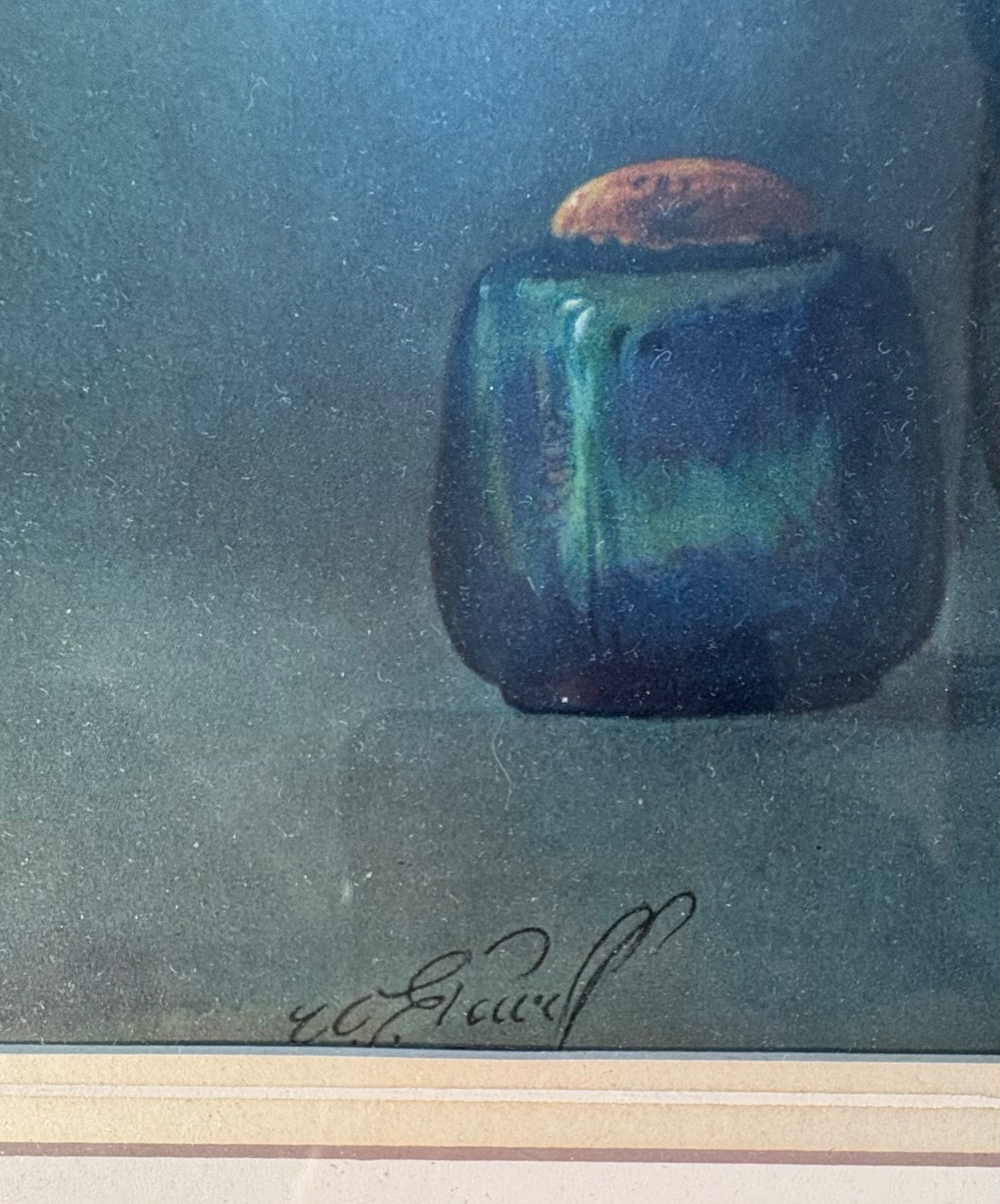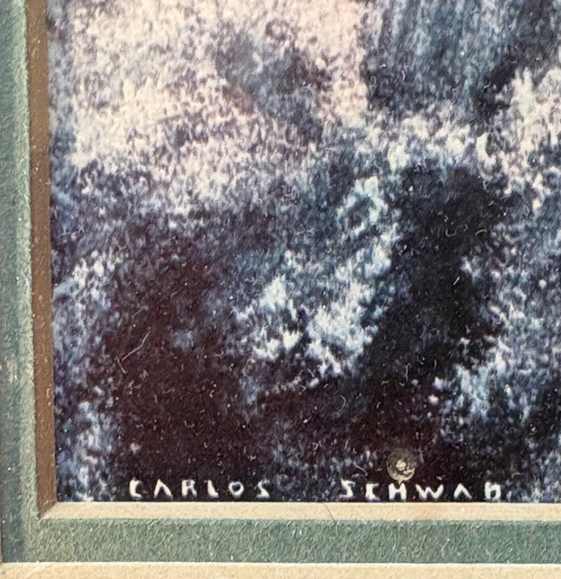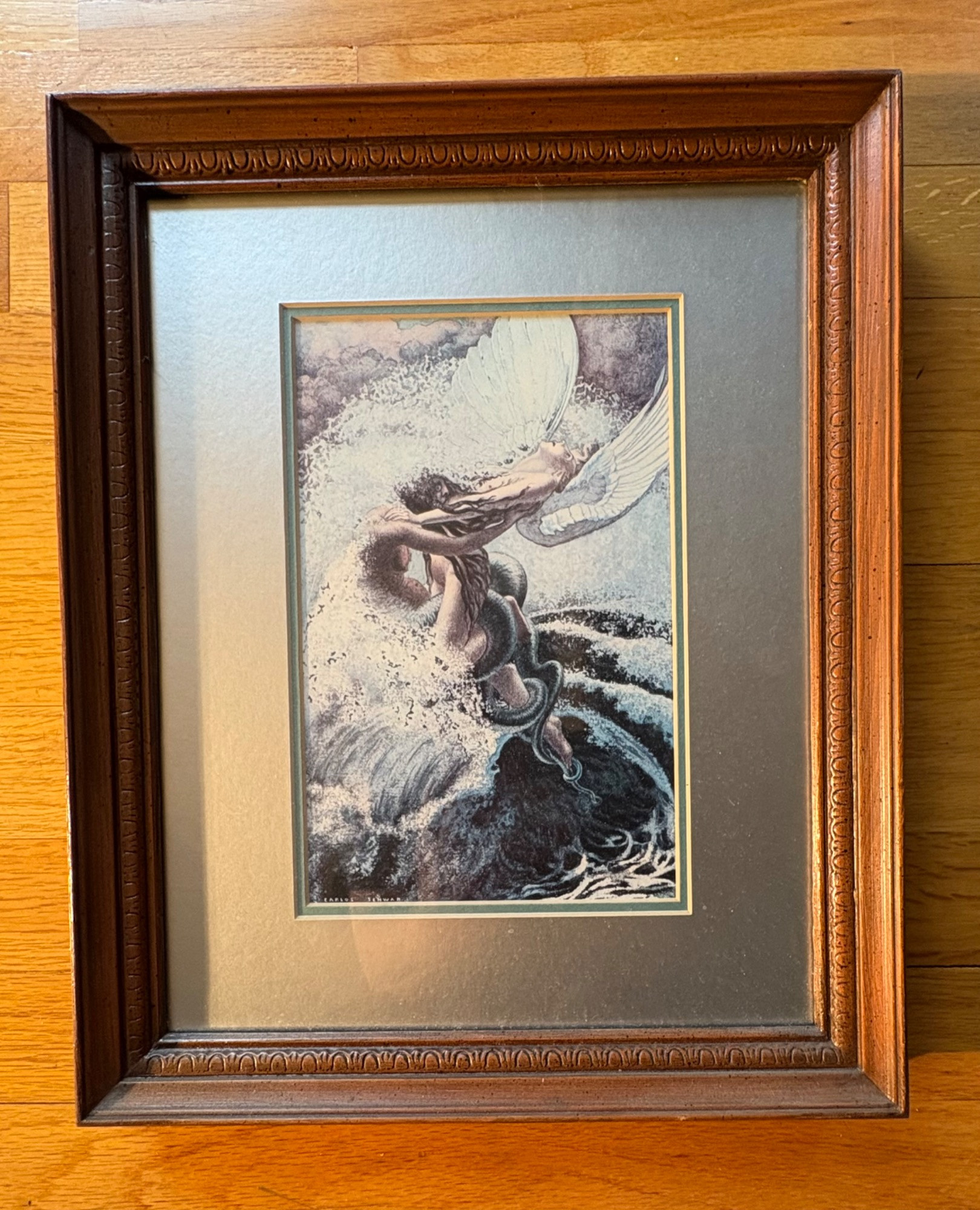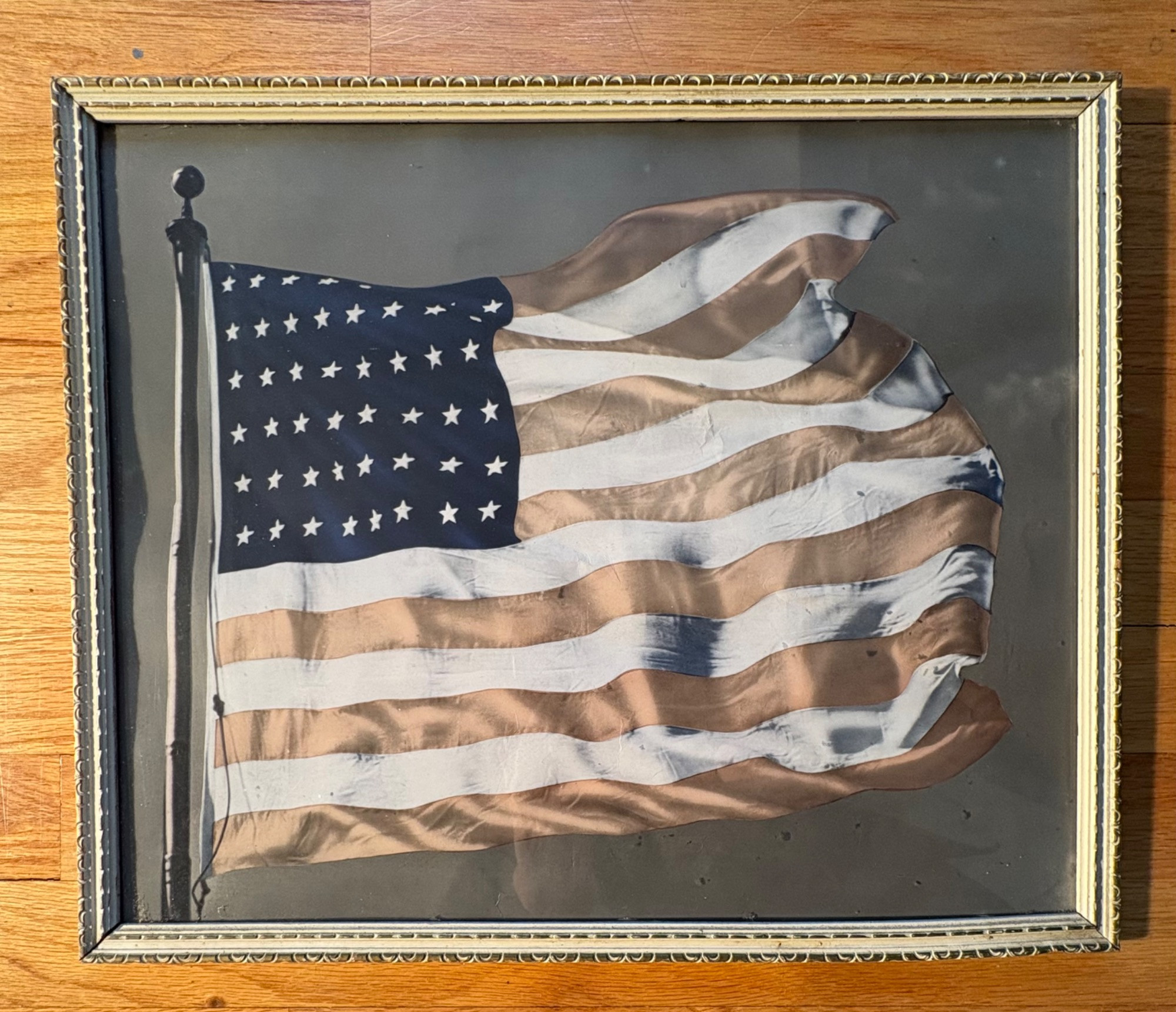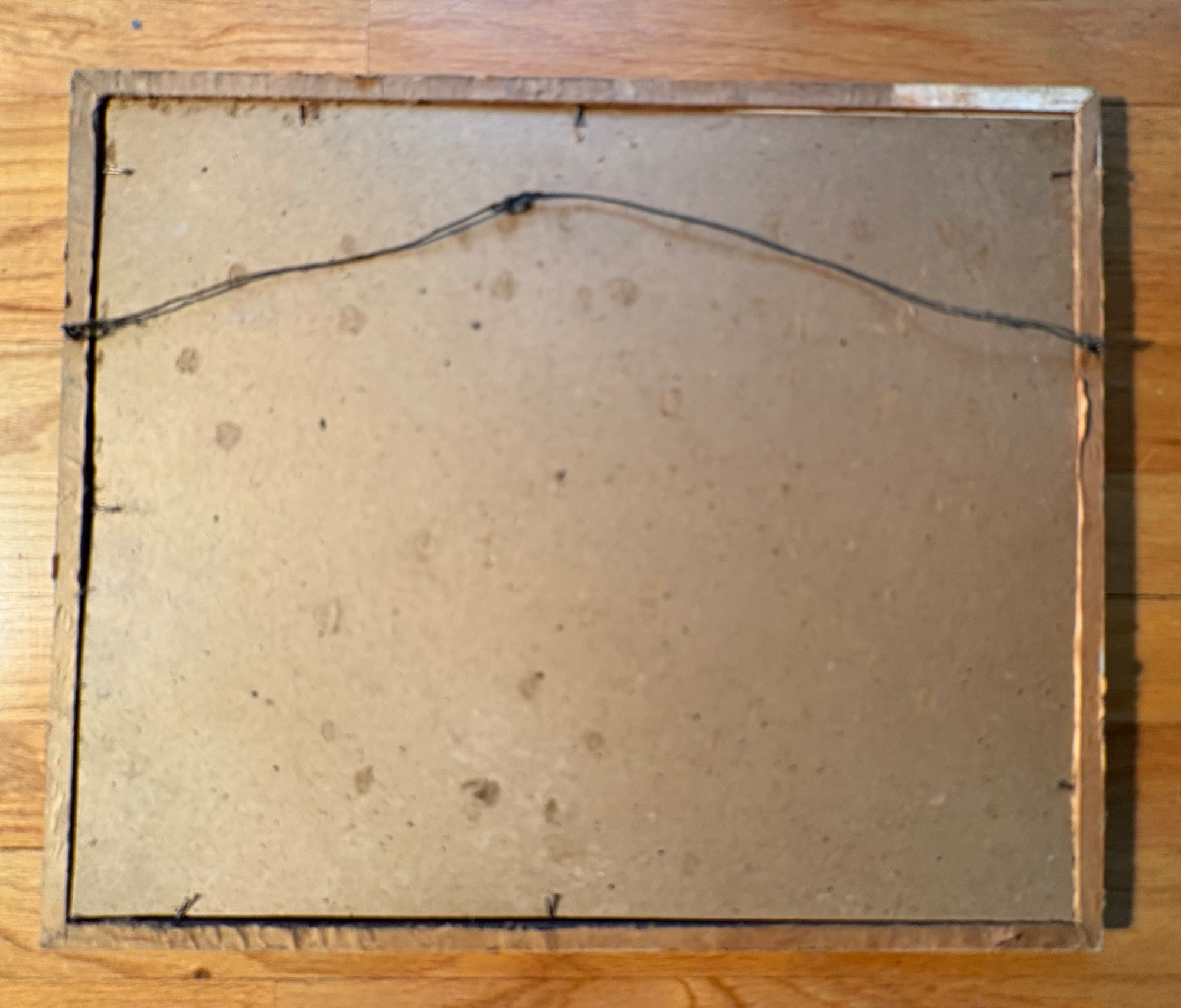 5 vintage art pieces all framed with varying mats and themes. Note that all are vintage reproduction prints rather than reproduction paintings with exception of the last piece - it is a very old reproduction painting on canvas. Floral still life measures 25" H x 21" W. Vintage flag print (48 stars) measures 15" H x 18" W. Carlos Schwab water scene print measures 15.75" H x 12.75" W Julio Romano mythological scene measures 12.75" H x 15.75" W. Unknown artist reproduction painting on canvas measures 10.5" H x 8.5" W. This one is quite old and shows its age; reverse confirms age. All are in OK vintage shape, but really need a good cleaning.