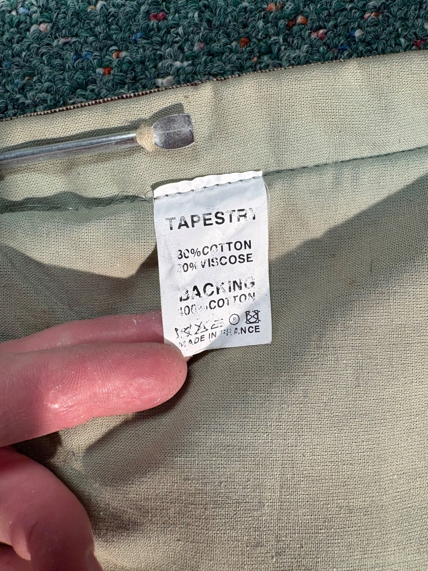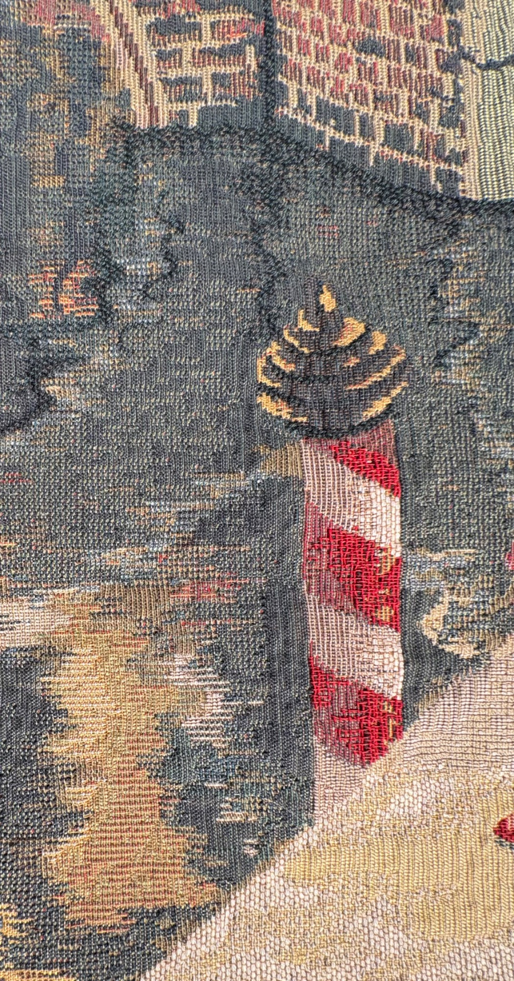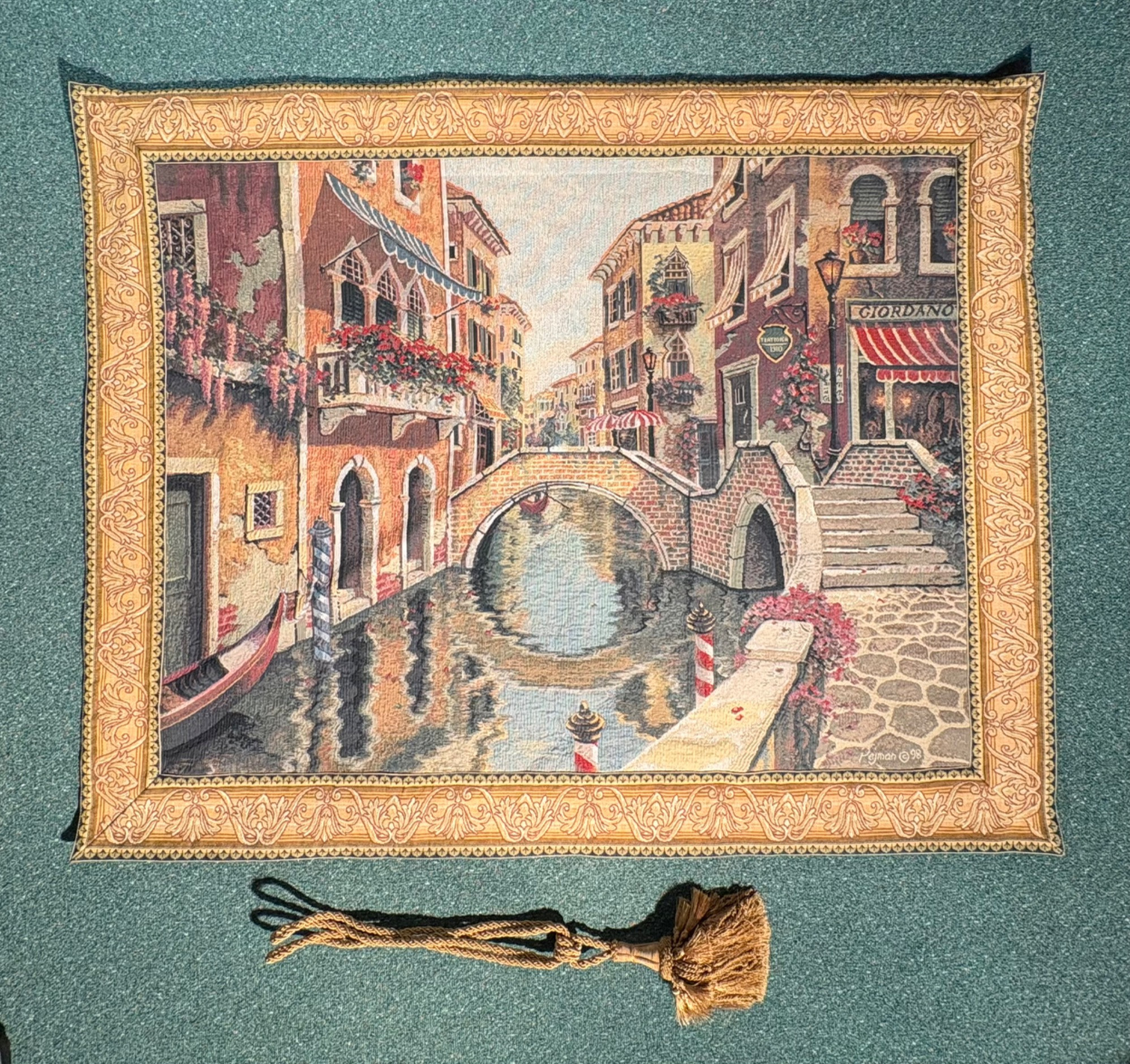 Vintage tapestry of a canal in Venice. It is quite large - about 4' high by 4.5' wide. Nice tight weave & fully lined. Made in France. Large gold tassel included, but no rod. The rod pocket at the back needs a quick whipstitch at both ends. Note: All tapestries listed in this auction are in good condition, but all would benefit from a good wash.