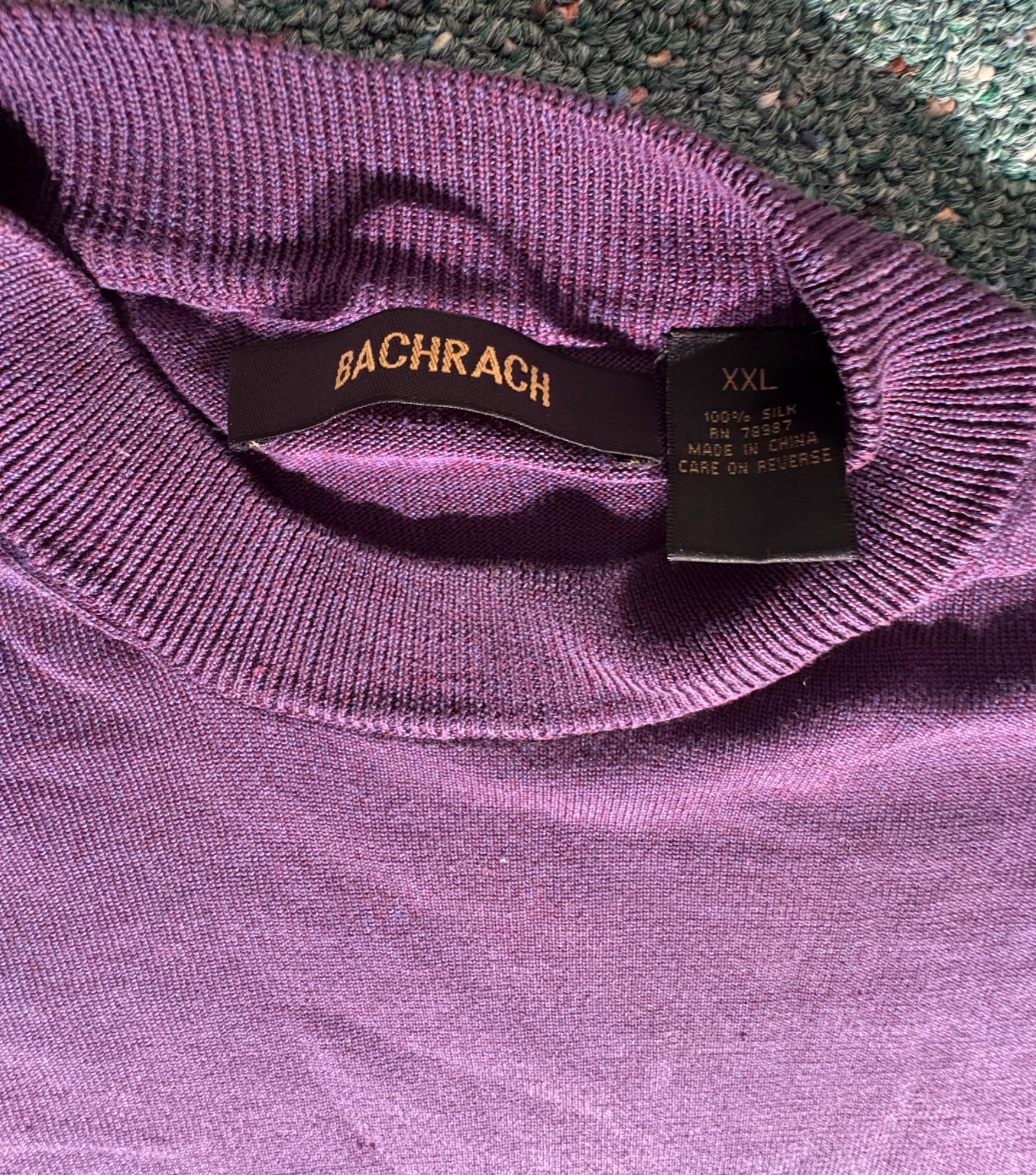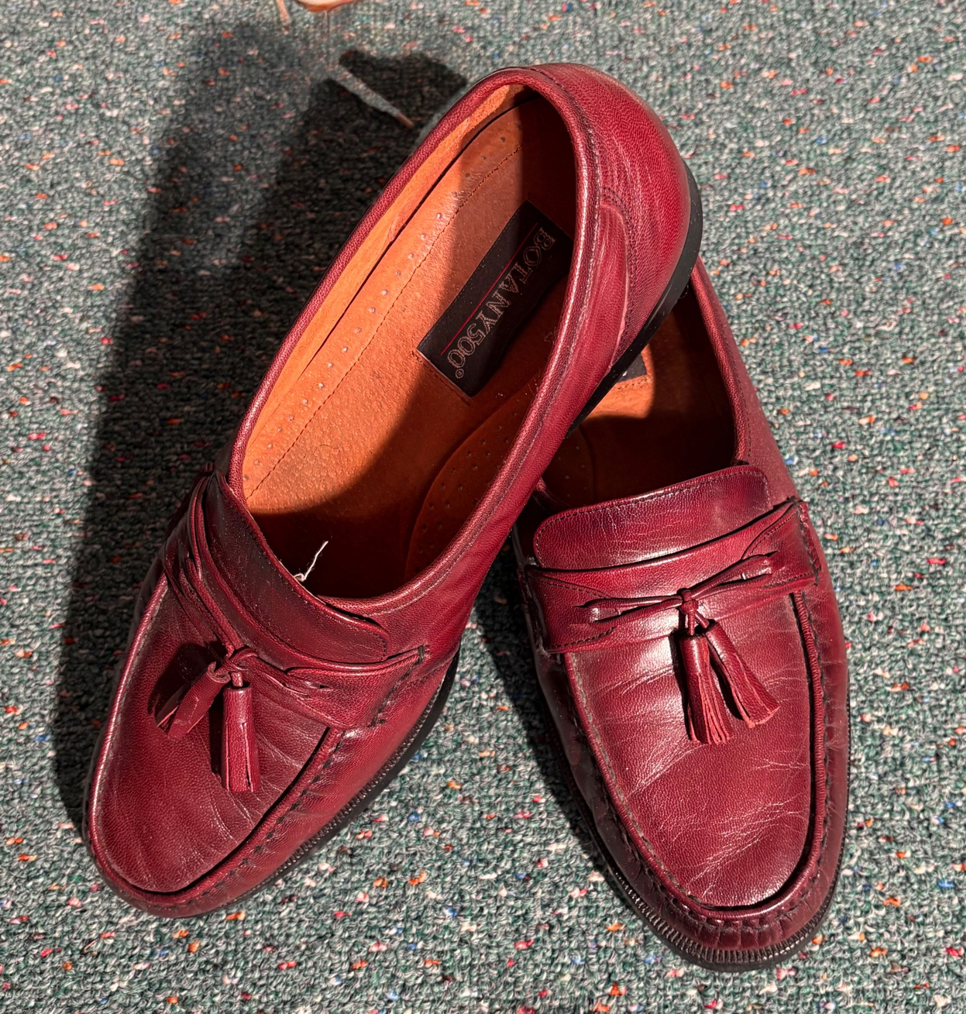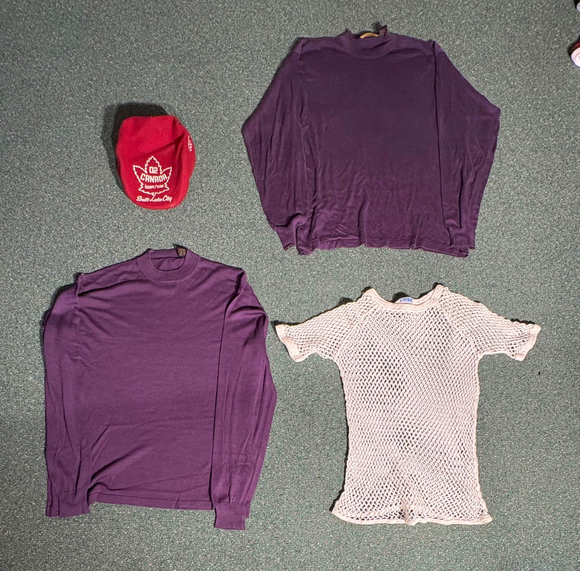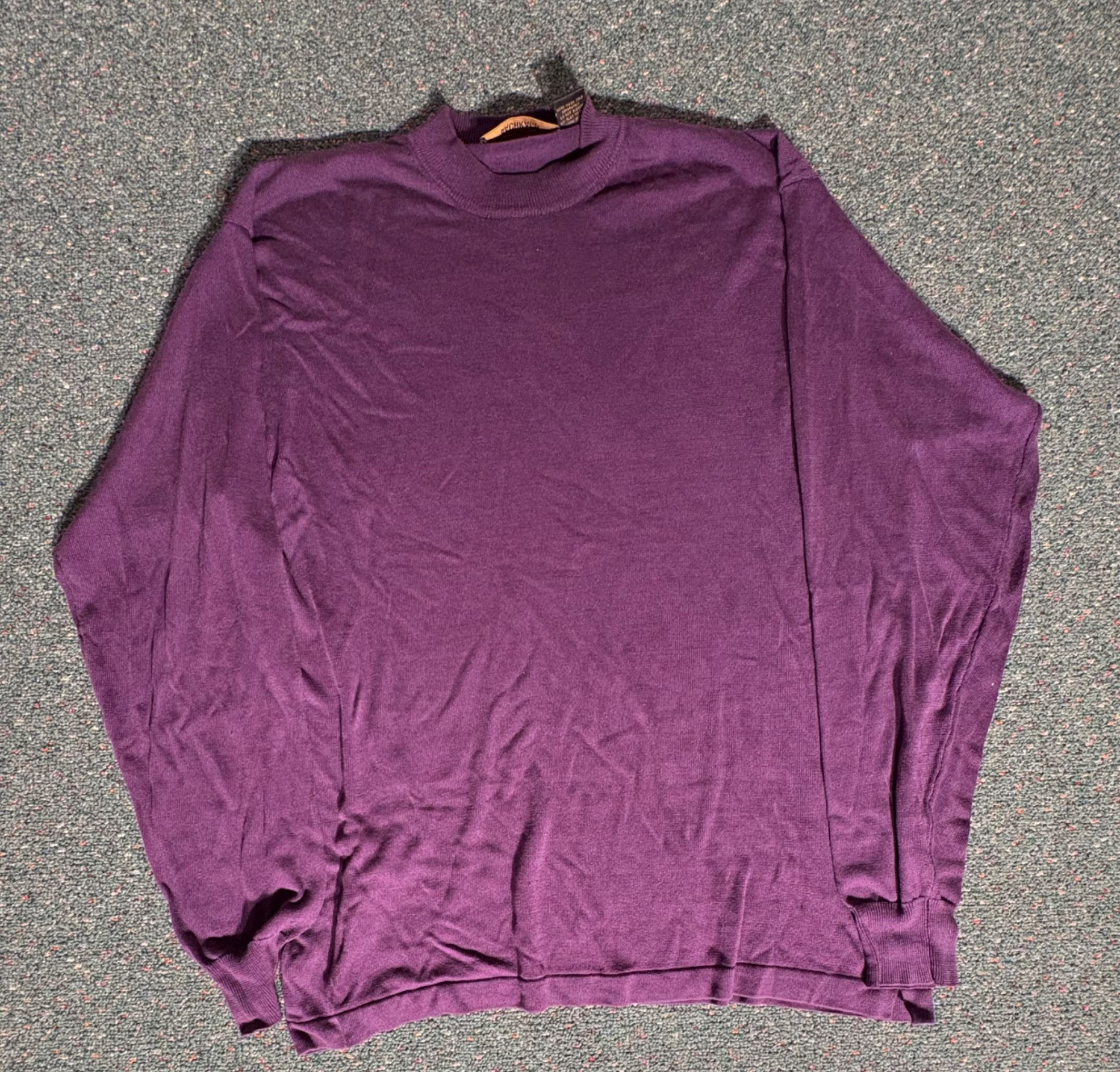 Eight pairs of shoes: 1 pair of Royal Imperial fForsheim wingtips - size 10.5 E 4 pairs of Botany 500 loafers - all size 10.5 W 2 pairs of "novelty" shoes (white & sandals) of much lesser quality - not in great shape - maybe great for a New Wave or Hippie costume. Clothing; 2 purple Bachrach 100% silk lightweight sweaters. Size XL 1 "muscle man" stretchy fishnet net top from Nordic Net (very vintage but in good shape) 1 red wool Roots brand newsboy hat celebrating the 2002 Salt Lake City Olympics. These were super popular and hard to get at the time. In good shape - size XL. Two purple Bachrach 100% silk lightweight sweaters. Size XL. 1 Irish fisherman's sweater from Cannava, Ireland. 100% hand-knitted wool. Needs a good wash as there is some dirt/soiling around the collar and on one cuff. 4 scarves of differing fabrics, design, and size We think our client wore some of these while on his Harley!