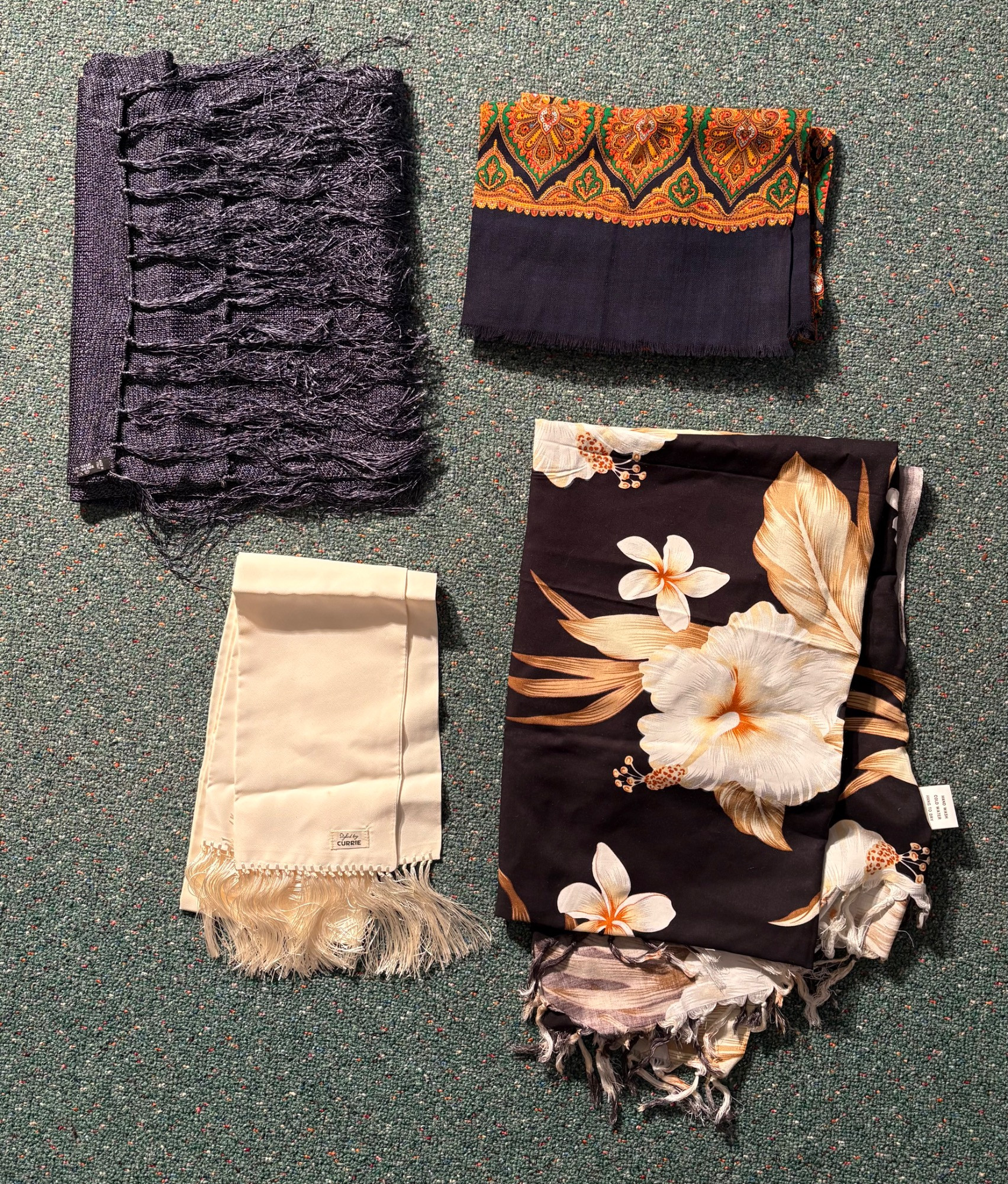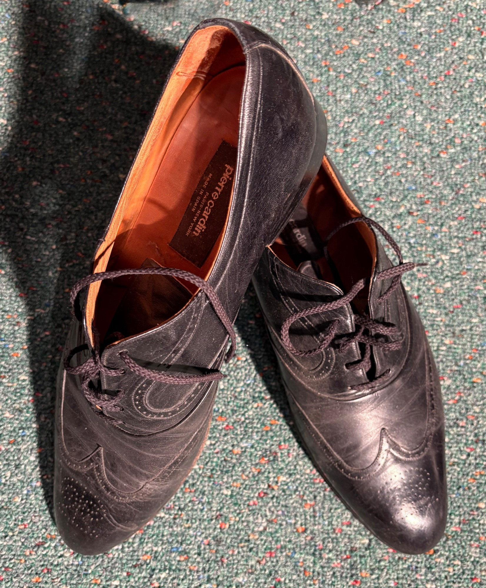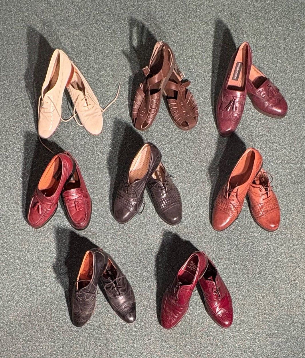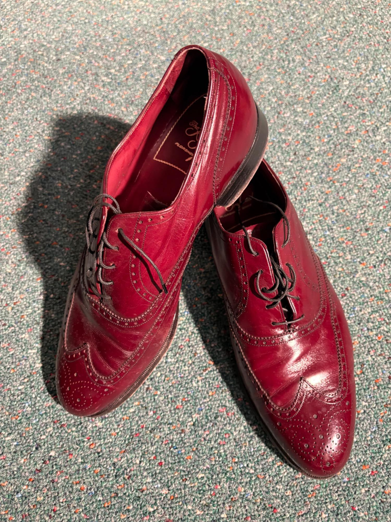 Eight pairs of shoes: 1 pair of Royal Imperial fForsheim wingtips - size 10.5 E 4 pairs of Botany 500 loafers - all size 10.5 W 2 pairs of "novelty" shoes (white & sandals) of much lesser quality - not in great shape - maybe great for a New Wave or Hippie costume. Clothing; 2 purple Bachrach 100% silk lightweight sweaters. Size XL 1 "muscle man" stretchy fishnet net top from Nordic Net (very vintage but in good shape) 1 red wool Roots brand newsboy hat celebrating the 2002 Salt Lake City Olympics. These were super popular and hard to get at the time. In good shape - size XL. Two purple Bachrach 100% silk lightweight sweaters. Size XL. 1 Irish fisherman's sweater from Cannava, Ireland. 100% hand-knitted wool. Needs a good wash as there is some dirt/soiling around the collar and on one cuff. 4 scarves of differing fabrics, design, and size We think our client wore some of these while on his Harley!