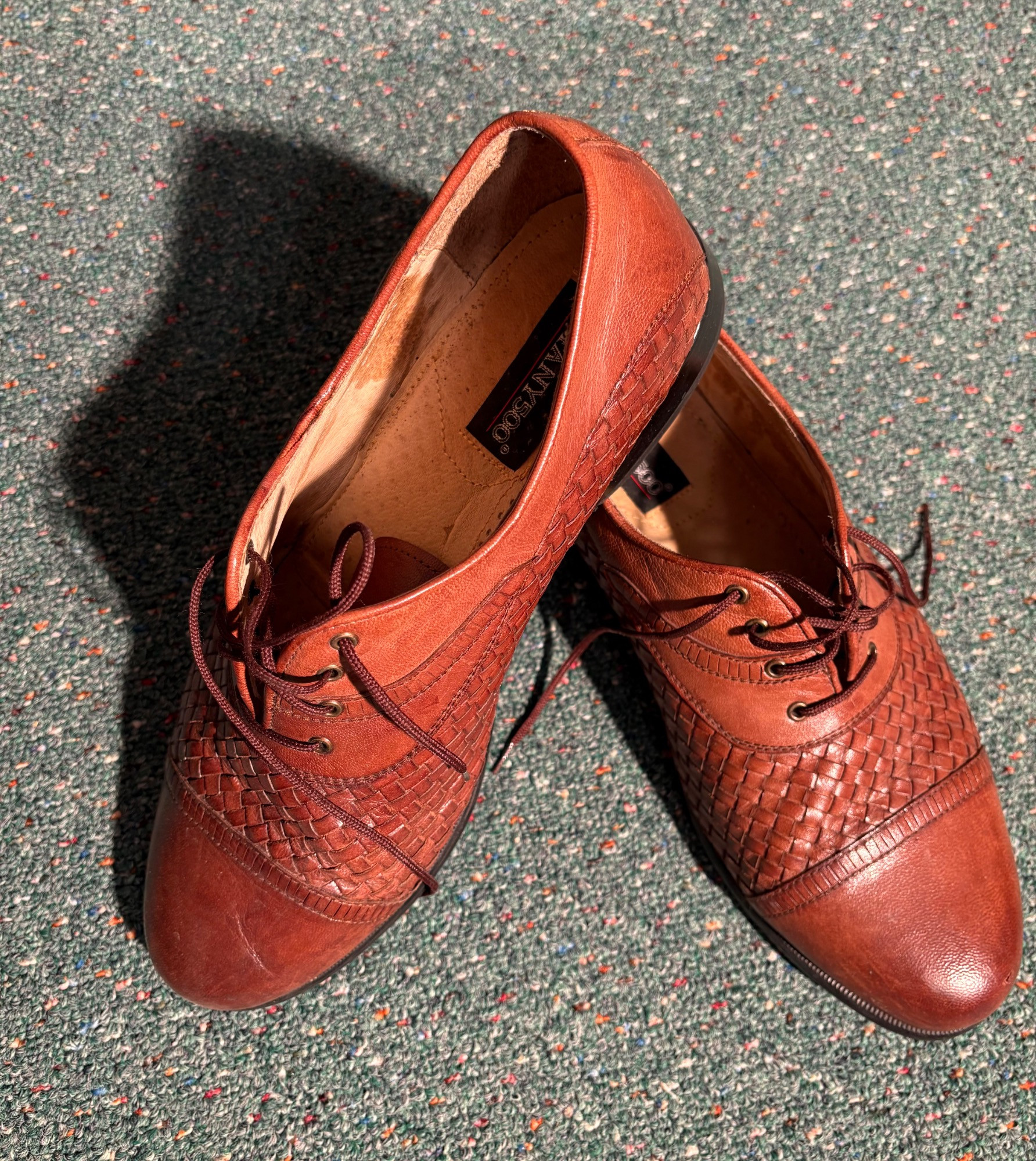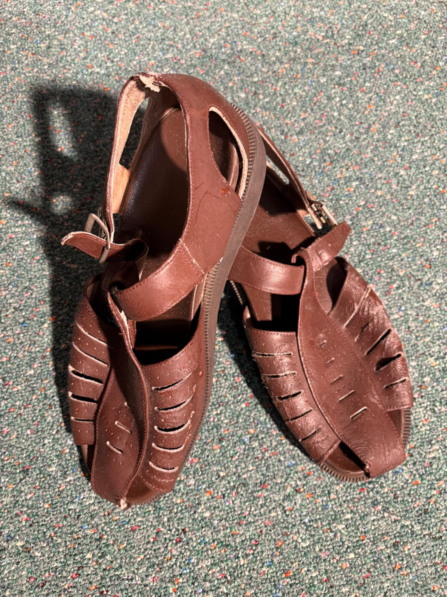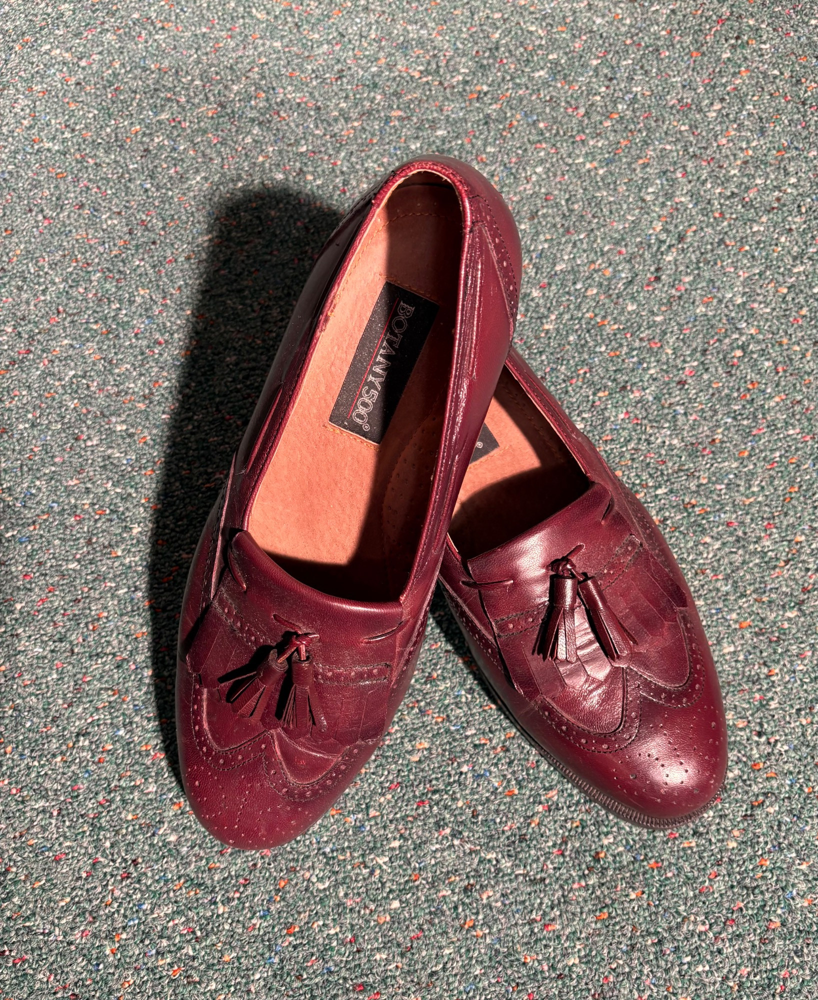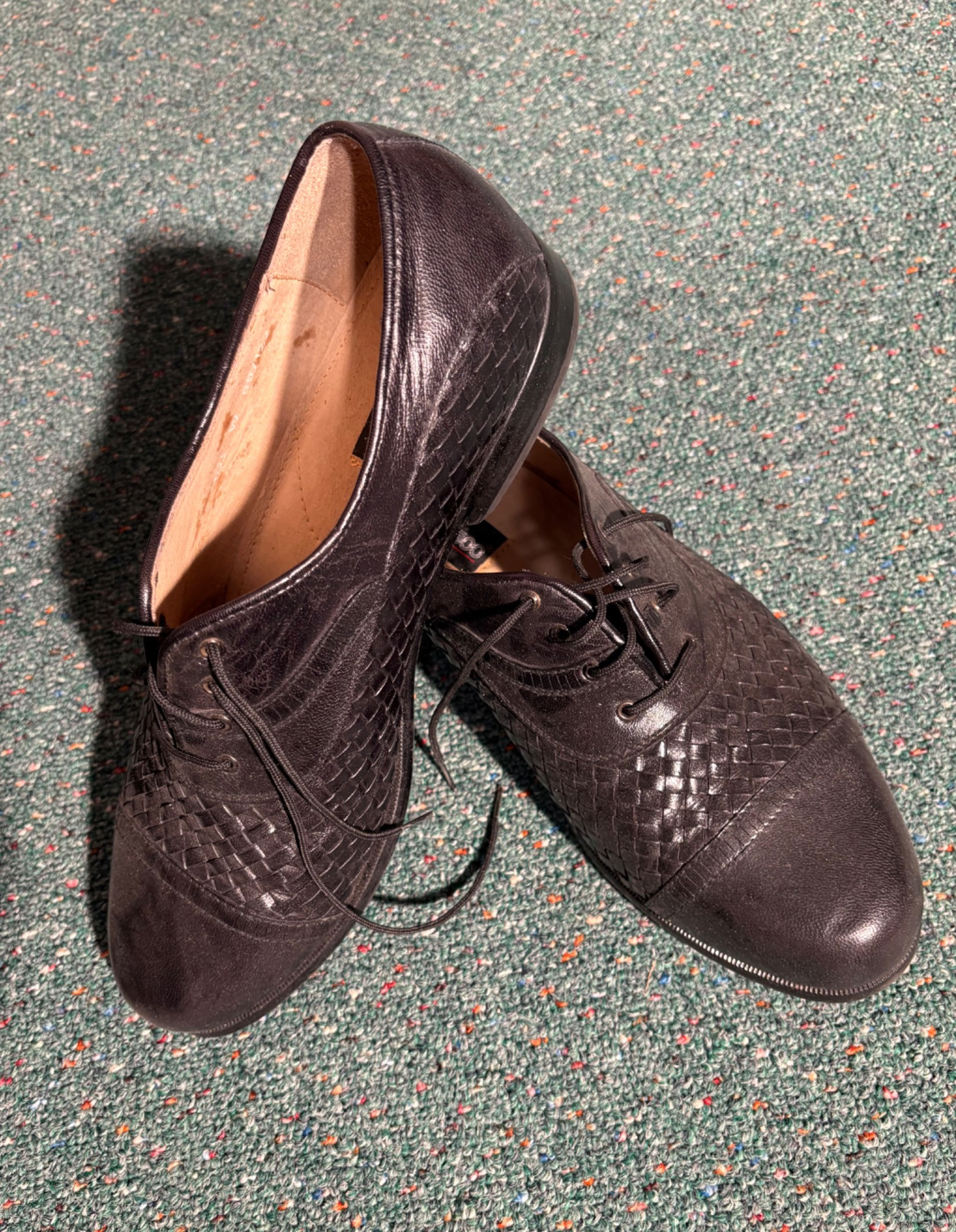 Eight pairs of shoes: 1 pair of Royal Imperial fForsheim wingtips - size 10.5 E 4 pairs of Botany 500 loafers - all size 10.5 W 2 pairs of "novelty" shoes (white & sandals) of much lesser quality - not in great shape - maybe great for a New Wave or Hippie costume. Clothing; 2 purple Bachrach 100% silk lightweight sweaters. Size XL 1 "muscle man" stretchy fishnet net top from Nordic Net (very vintage but in good shape) 1 red wool Roots brand newsboy hat celebrating the 2002 Salt Lake City Olympics. These were super popular and hard to get at the time. In good shape - size XL. Two purple Bachrach 100% silk lightweight sweaters. Size XL. 1 Irish fisherman's sweater from Cannava, Ireland. 100% hand-knitted wool. Needs a good wash as there is some dirt/soiling around the collar and on one cuff. 4 scarves of differing fabrics, design, and size We think our client wore some of these while on his Harley!