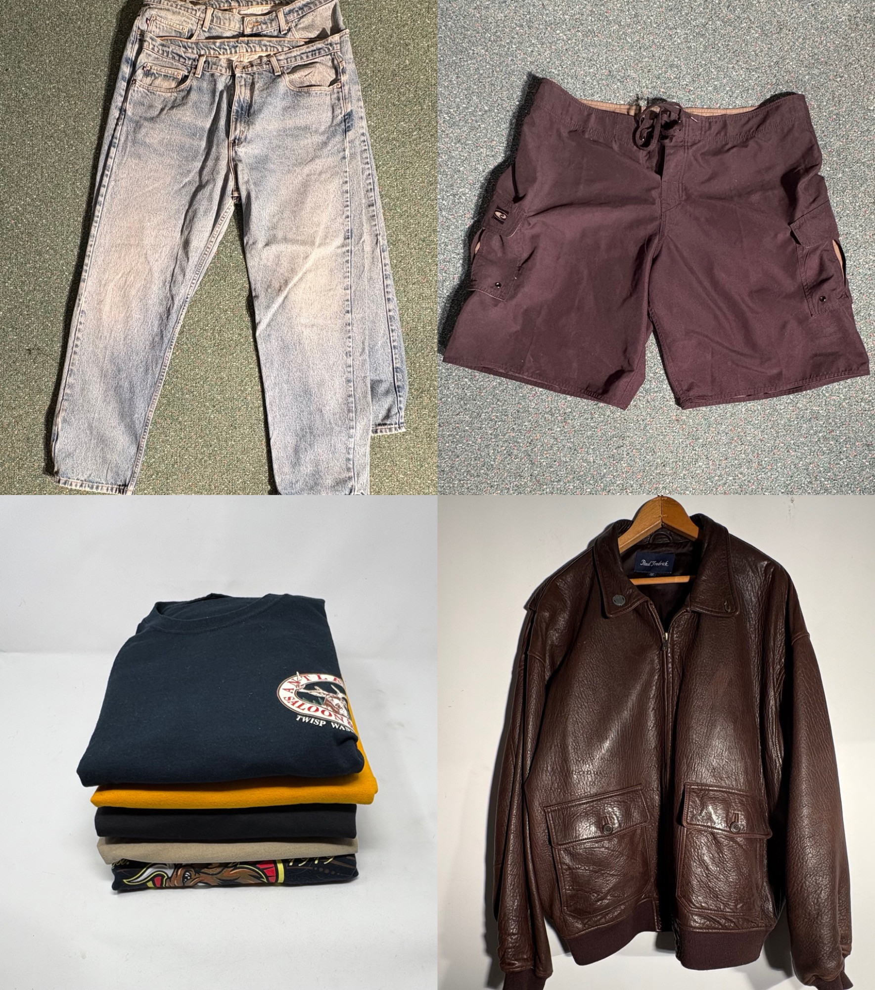Two pairs of Ralph Lauren jeans - both appear to be the same design and cut. They are size 38 x 32. Pair of Hawaiian brand jam shorts/surf shorts. Size tag has been removed, but they are definitely an XL. Five t-shirts from various places. All in good condition with no egregious stains noted. All are XL or larger. Paul Frederick buttery soft leather jacket. Has elasticated waist and cuffs, zipper front, patch pockets with button closures, and side slide pockets. In really nice condition overall with a little pilling on the knitted areas (sweater shaver will make short work of the pills) and a bit of wear showing on the back neckline - see last photo. Pit to pit measures approximately 29" with expansion plackets down back to expand when arms are raised/moved forward.