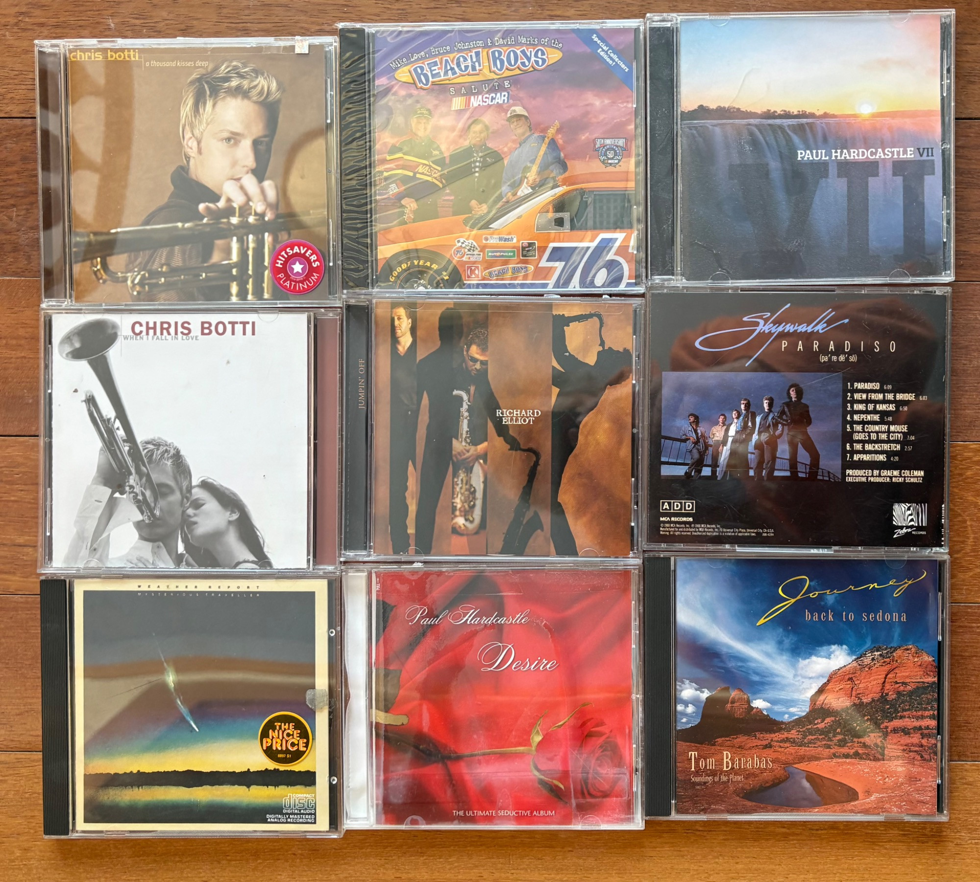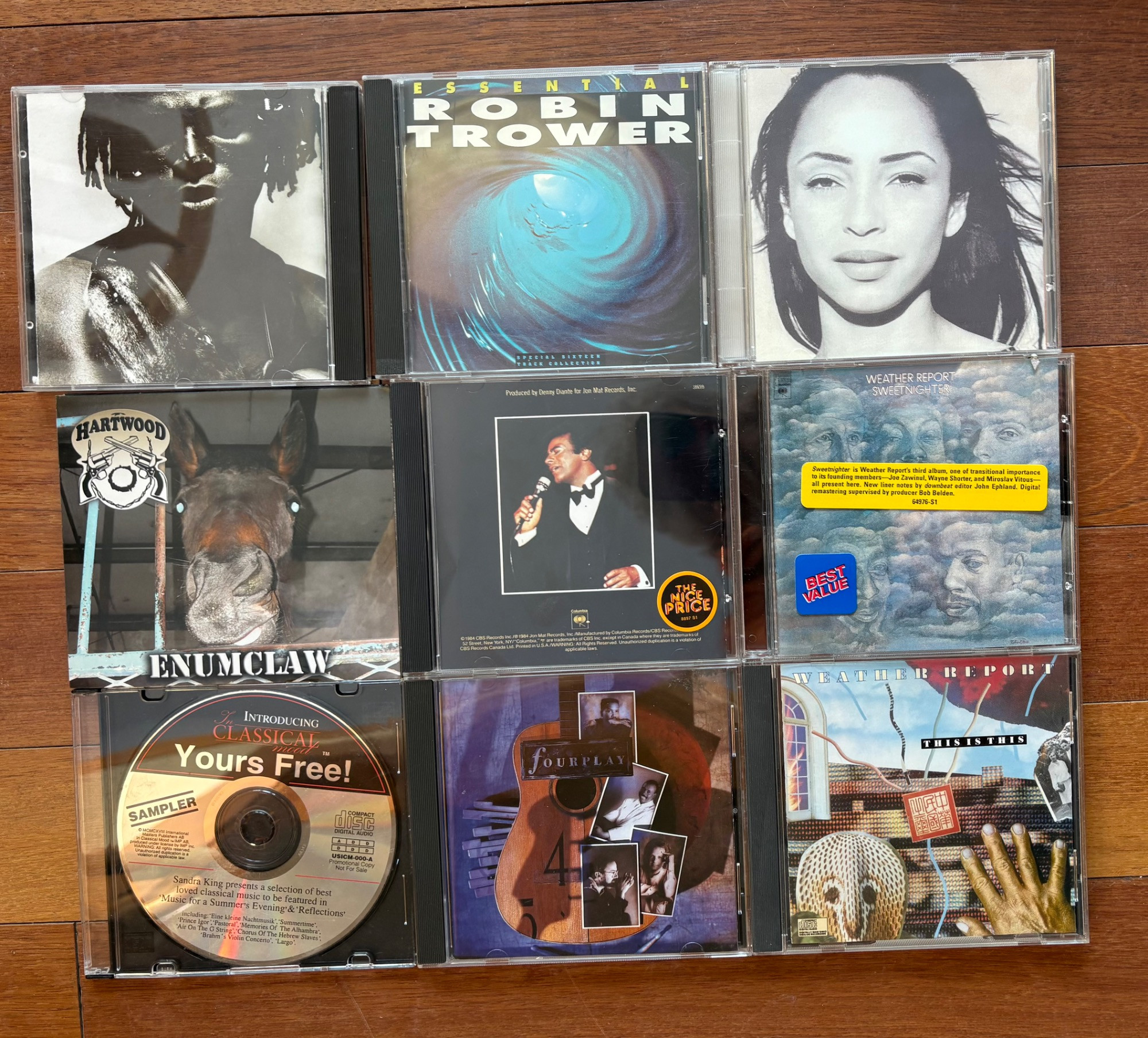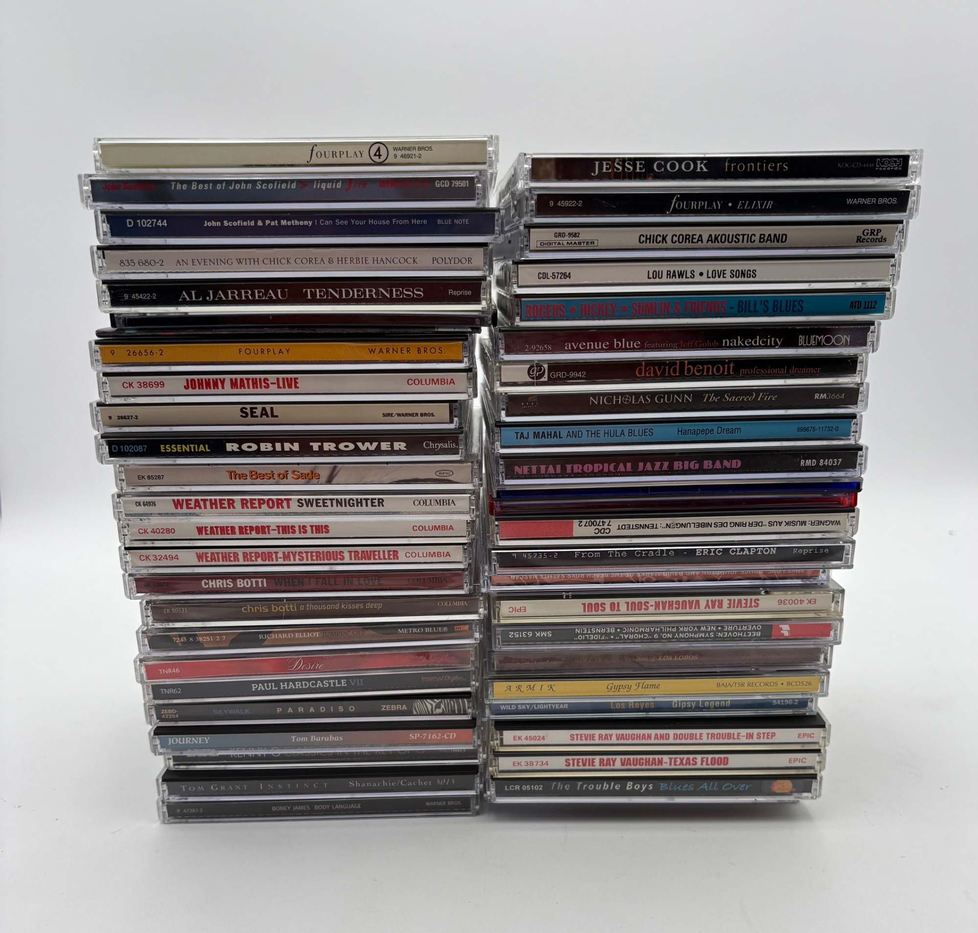 Group of CDs consisting mostly of contemporary jazz/blues/easy listening with a few odd rock/classical folks thrown in. Artists cover a wide range from Al Jarreau, Kenny G, Chris Botti, Weather Report, Stevie Ray Vaughn, Fourplay, Eric Clapton, Sarah Vaughn, Lou Rawls, and Chick Corea to Taj Mahal and others.