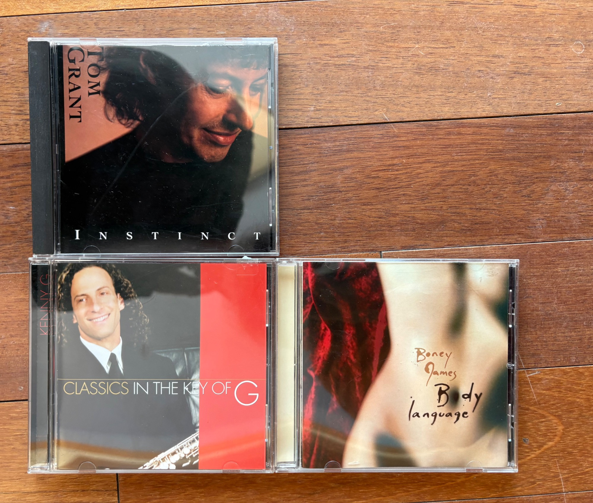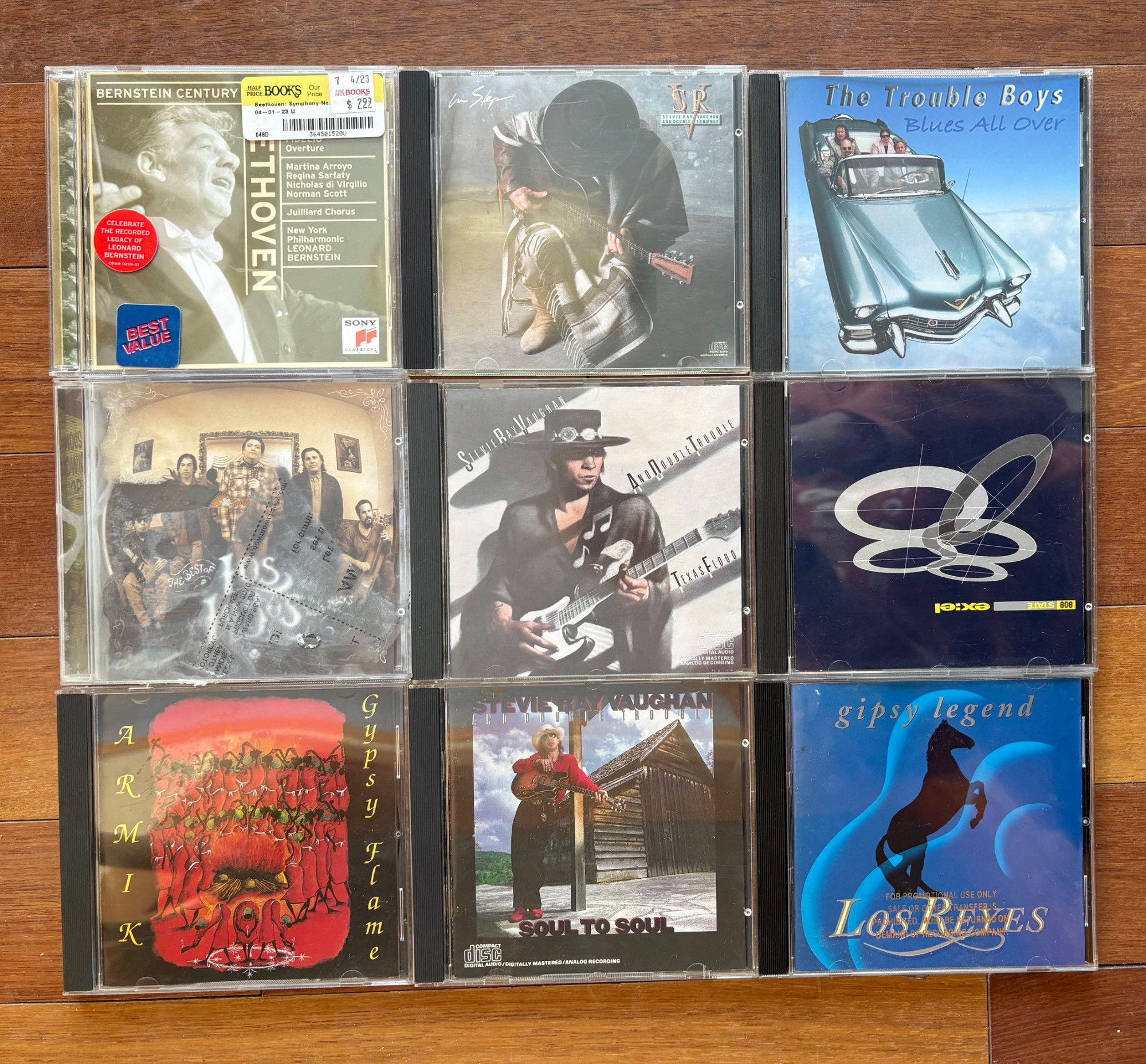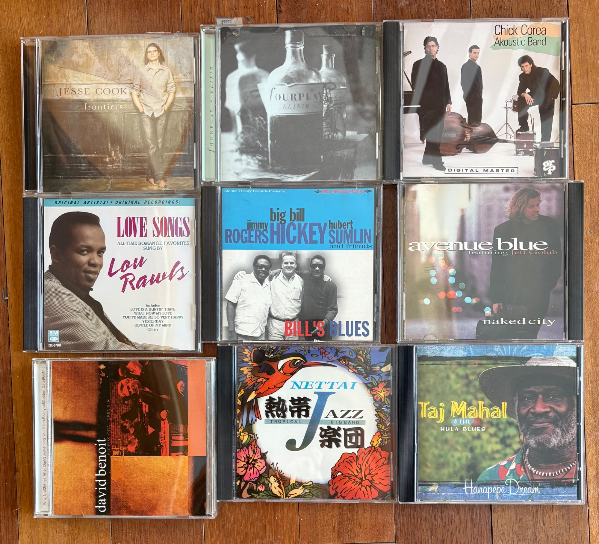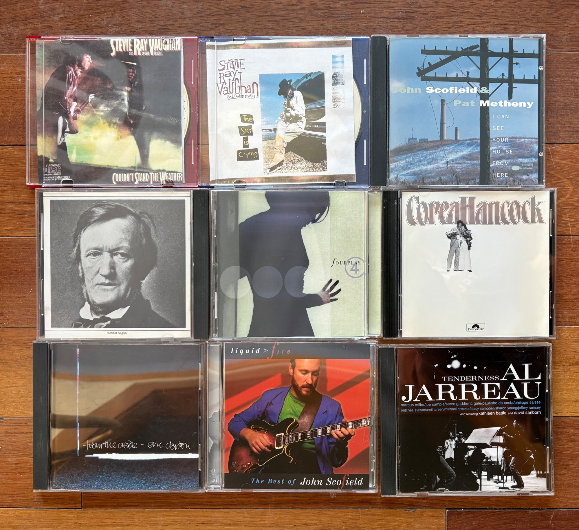 Group of CDs consisting mostly of contemporary jazz/blues/easy listening with a few odd rock/classical folks thrown in. Artists cover a wide range from Al Jarreau, Kenny G, Chris Botti, Weather Report, Stevie Ray Vaughn, Fourplay, Eric Clapton, Sarah Vaughn, Lou Rawls, and Chick Corea to Taj Mahal and others.