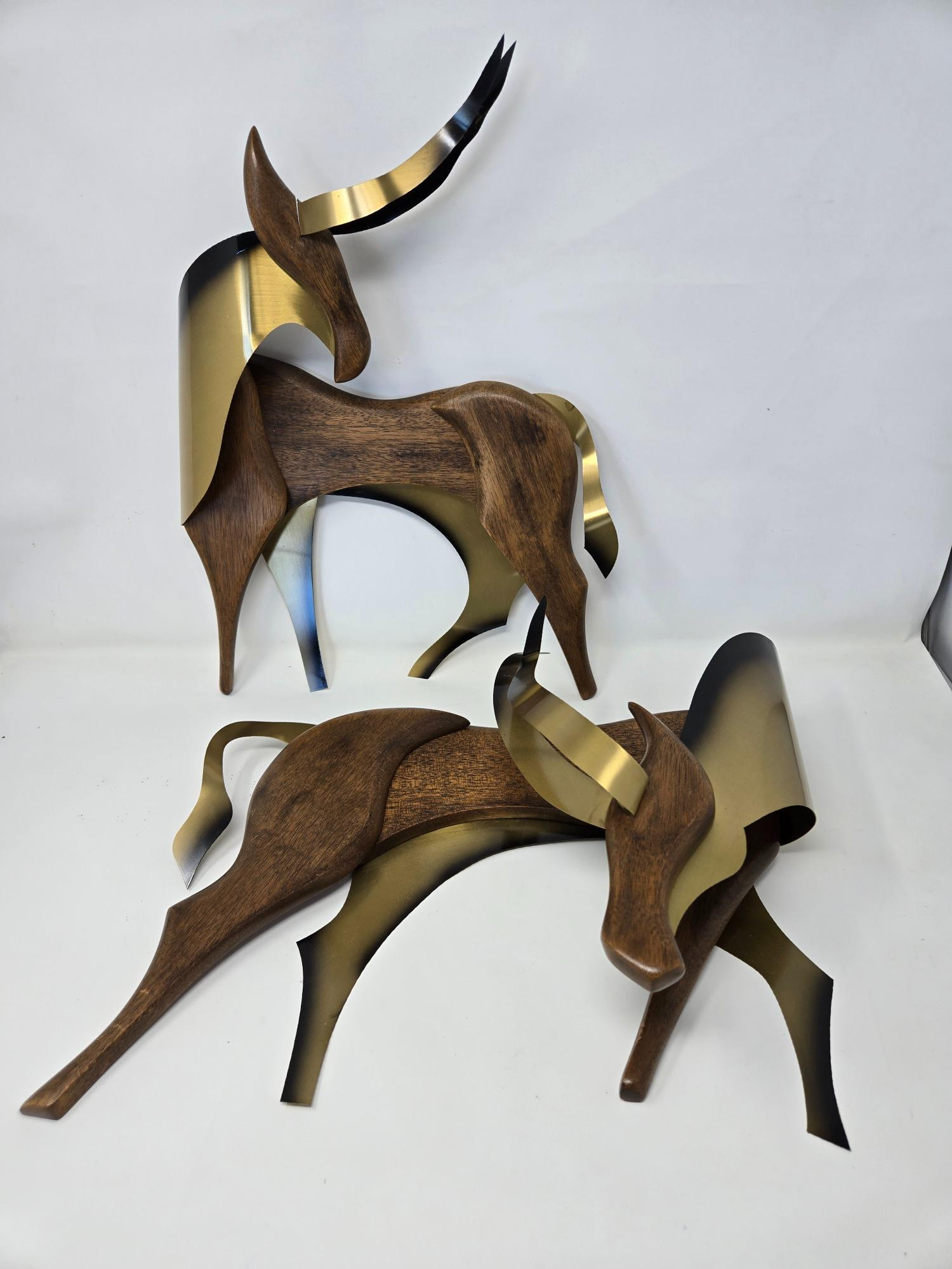 sculpture. It is made of wood and metal. It is a mid-century modern piece. The sculpture is designed to be hung on a wall. It is likely from the 1960s or 1970s. The style is reminiscent of Curtis Jere. It is a decorative art piece. The sculpture depicts a stylized horse. Similar pieces are considered collectible.