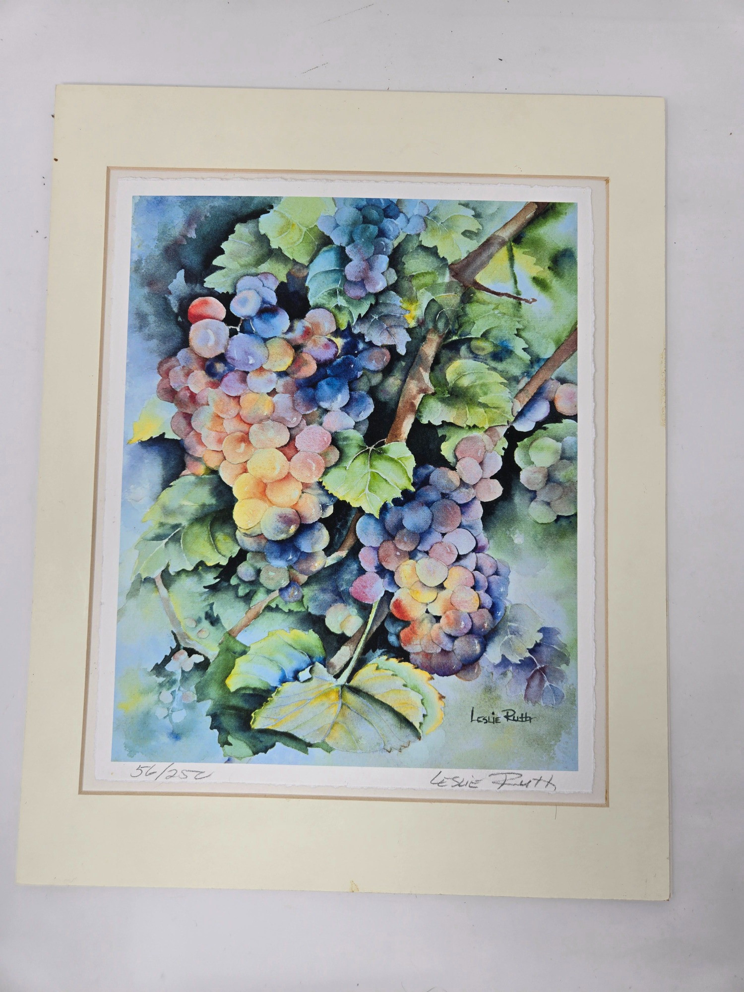This is a limited edition watercolor print, numbered 56/250, by artist Leslie Ruth. The painting depicts a bunch of grapes in rich shades of purple, blue, yellow, and pink, capturing ripeness and the play of light. Details: Medium: Watercolor print Style: Still life, emphasizing abundance and vitality Technique: Soft, blended effect with flowing colors for depth and texture Framing: Matted with a light-colored border to enhance the artwork Size: 12” x 10 ½”