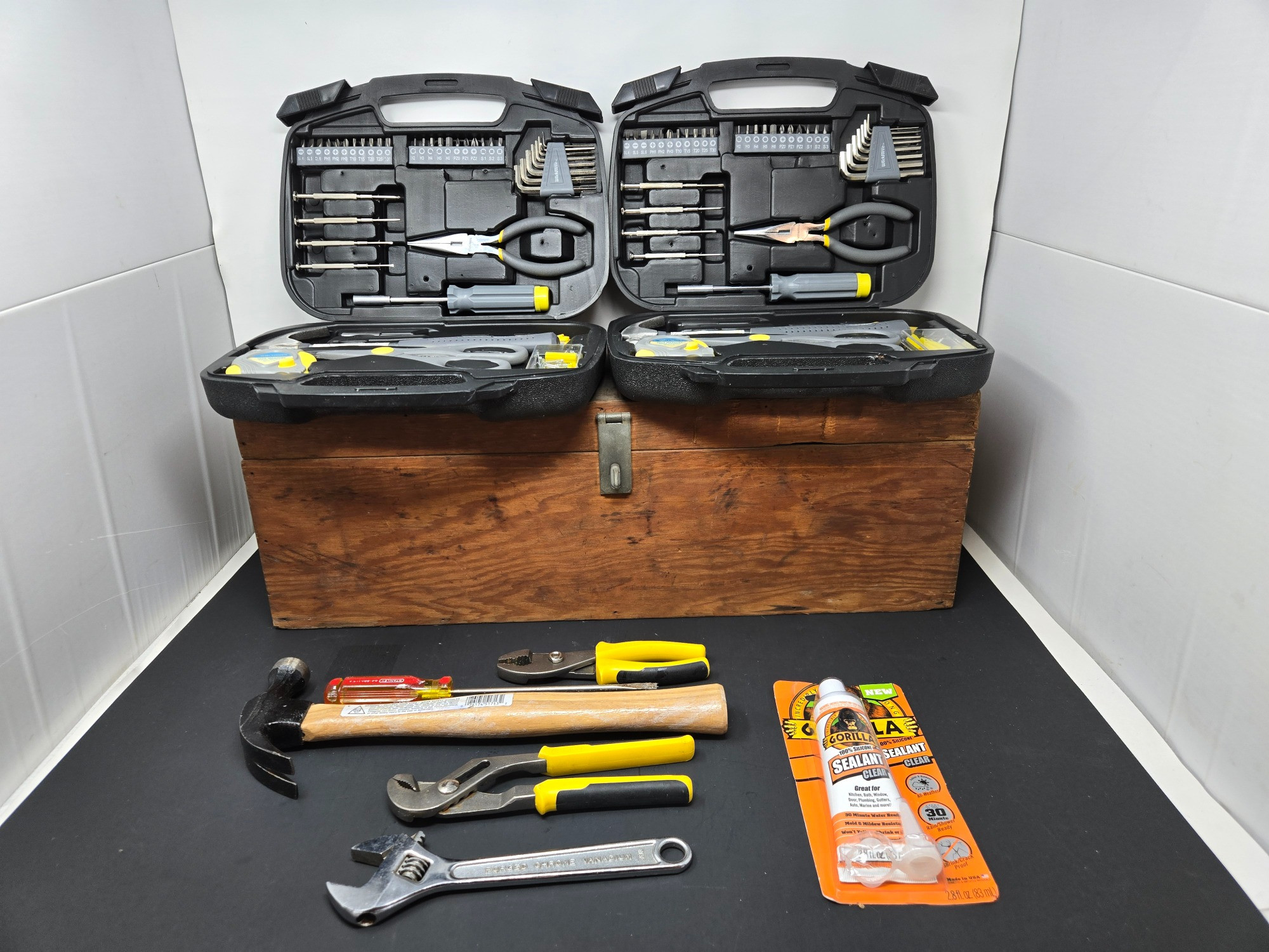 A versatile homemade chest paired with two Workforce 42-Piece Household Tool Kits and additional hand tools—perfect for home repairs and DIY projects. Workforce 42-Piece Household Tool Kits Include: Hammer Tape measure Scissors Screwdrivers Pliers Hex key set Fasteners Utility knife Other assorted essential tools Additional Hand Tools Included: Hammer – Ideal for driving nails and fasteners Screwdriver – For tightening and loosening screws Slip Joint Pliers – Provides a strong grip for various tasks Groove Joint Pliers – Adjustable for different sizes Adjustable Wrench – Versatile for turning nuts and bolts