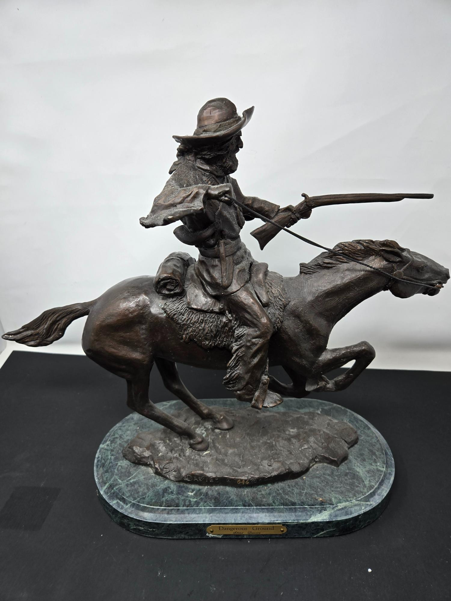 A striking bronze sculpture by Steve Davies titled "Dangerous Ground." This dynamic piece depicts a mountaineer with a rifle, riding a galloping horse. Signed and numbered at the base, possibly 379/17,500 It features a rich brown patina and is elegantly mounted on a green marble plinth.