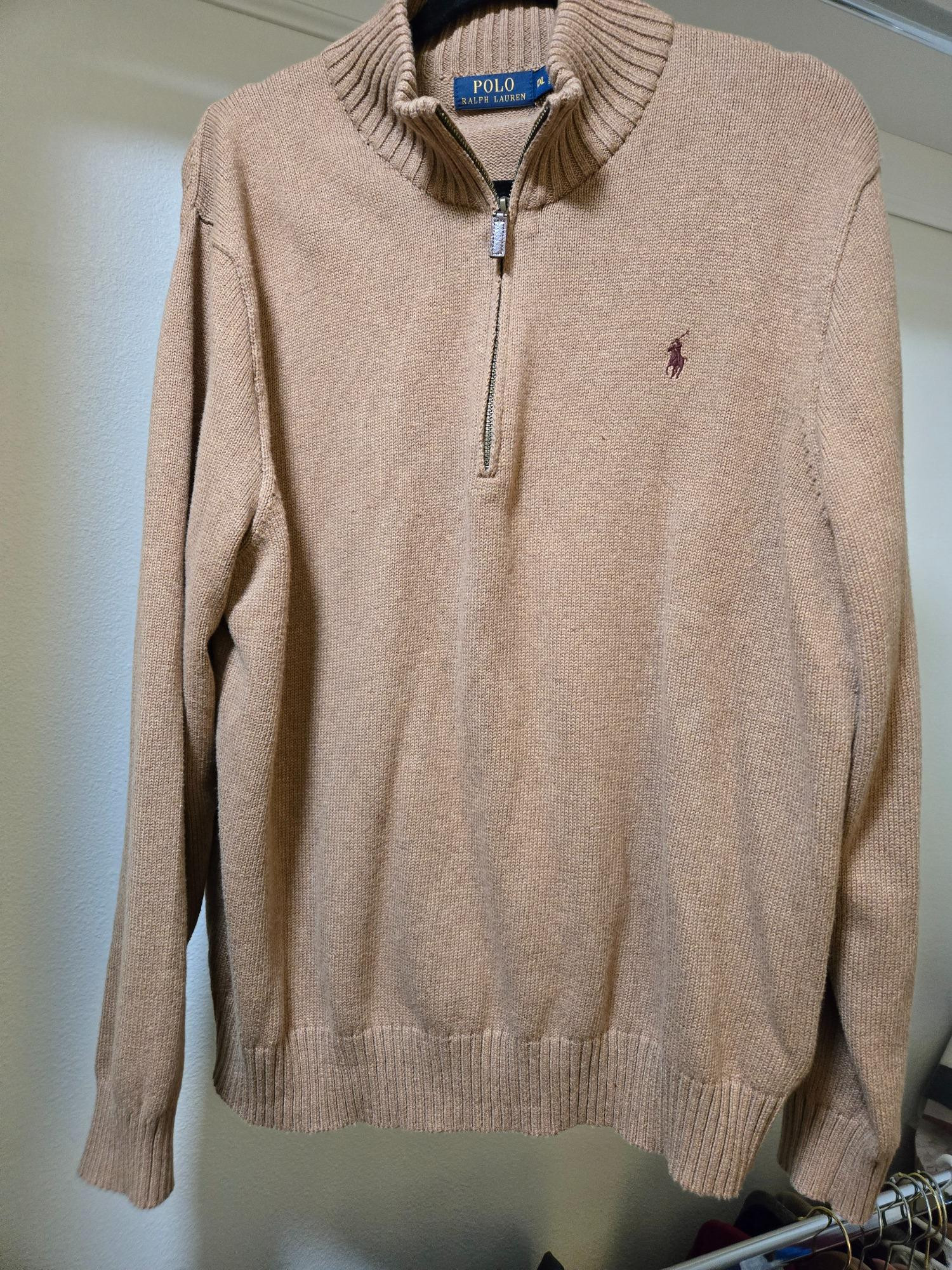 Classic tan Polo Ralph Lauren sweater with a quarter-zip design. Made from a soft knit blend, featuring ribbed cuffs, hem, and collar with the signature embroidered Polo pony on the chest. Details: Size: XXL Color: Tan Material: Knit blend Condition: Excellent pre-owned, minimal wear (see photos).
