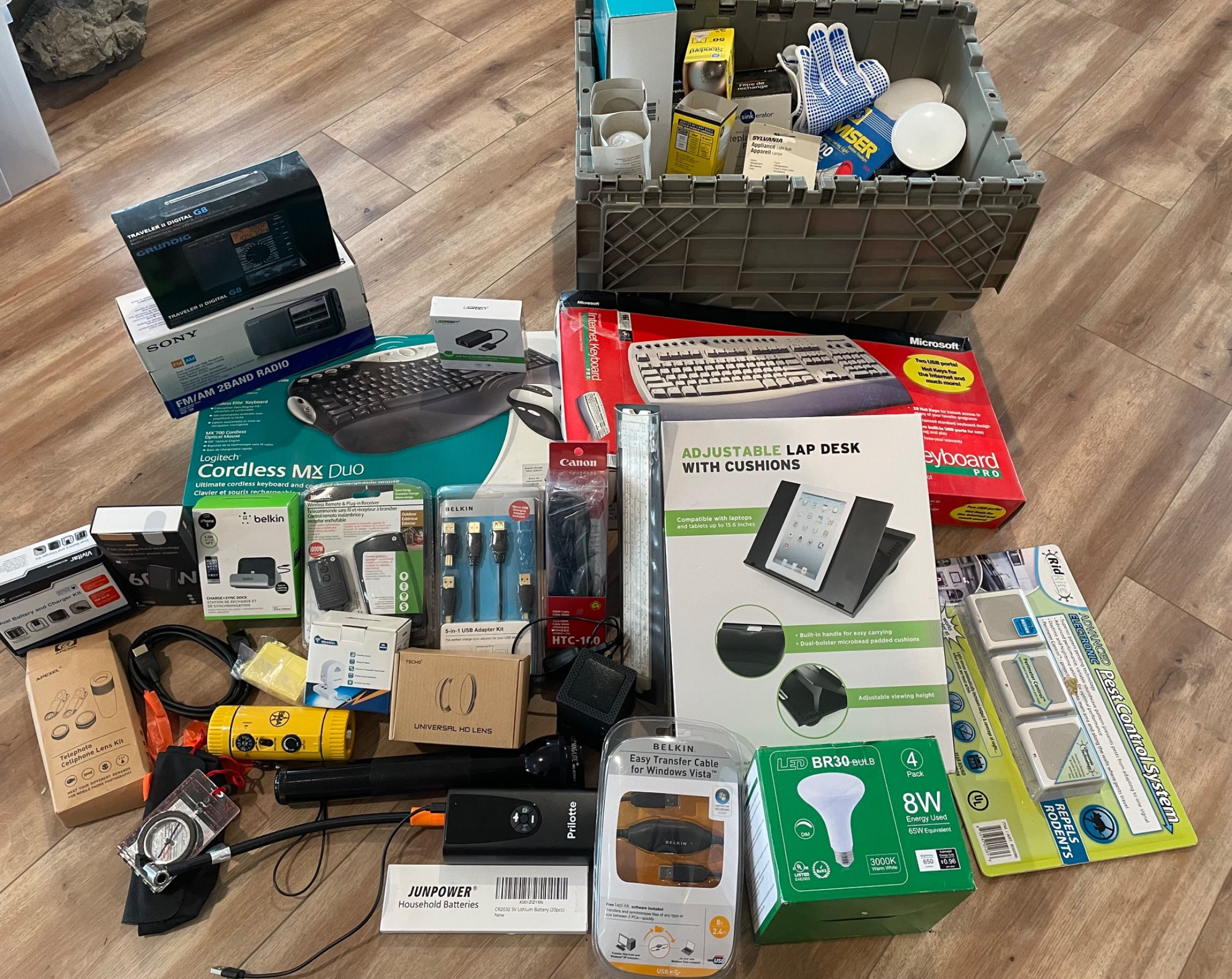 A diverse collection of electronics and accessories, including cell phone camera equipment, radios, computer peripherals, and household tech items. The lot includes a mix of new, used, and open-box items, making it perfect for resellers, tech enthusiasts, or DIY tinkerers. Included Items: Universal HD camera lenses with clip-on attachment LED BR30 light bulbs (4-pack) Belkin 5-in-1 USB adapter kit & Easy Transfer cable for Windows Vista Wireless remote plug-in receiver Belkin charge + sync dock Power banks & battery chargers (various brands) Logitech Cordless MX Duo (keyboard & mouse set) HDMI cables, USB cables, and adapters Various radios, flashlights, and small electronic accessories Condition: Some packaging shows wear. Please refer to photos for exact condition.