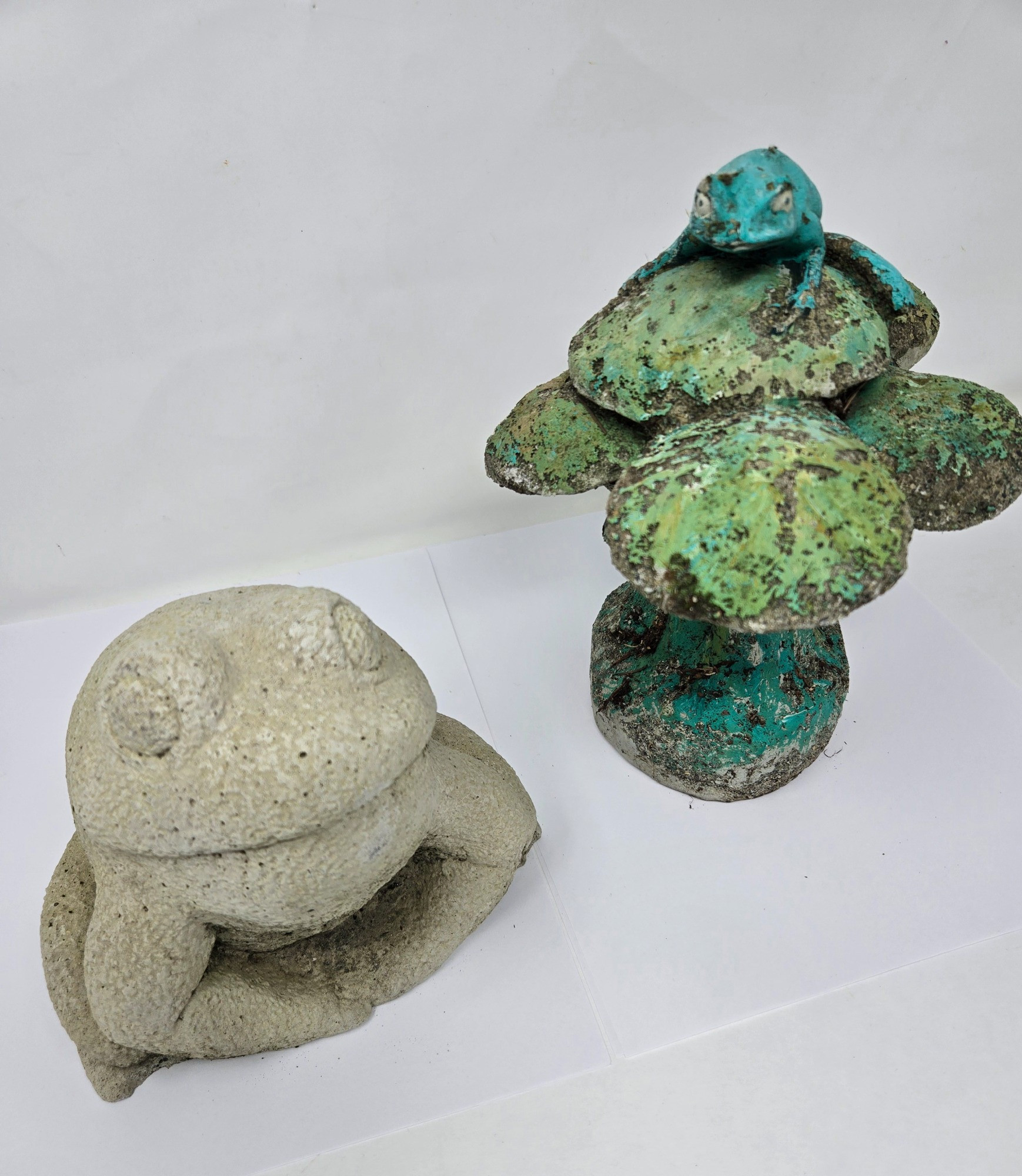 A charming set of vintage frog garden sculptures, perfect for outdoor décor or collectors of unique amphibian-themed art. The first sculpture is a sandstone frog with a textured surface, sitting in a relaxed pose. The second piece features a patina-finished metal frog perched atop a cluster of green, mushroom-like formations, giving it a whimsical, weathered look. Condition: These sculptures show signs of aging, including natural patina, mossy discoloration, and surface wear, adding to their rustic charm.
