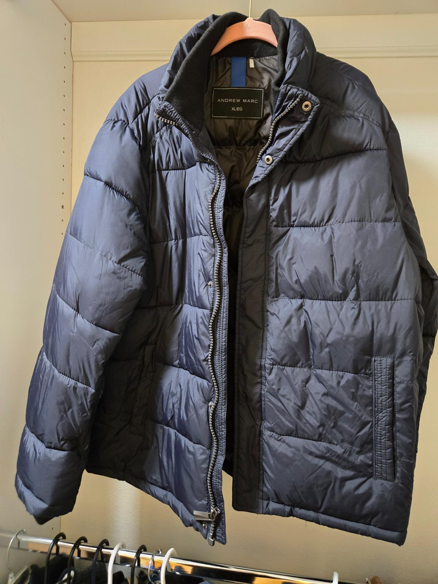 Stay warm in style with this Andrew Marc puffer jacket, size XL. Designed for ultimate comfort, it features a 100% nylon shell, polyester lining and fill, and a quilted design for insulation. The deep navy blue color adds a sleek touch, while the interior features stylish blue trim accents. Condition: Gently used, no major flaws. Please review photos for details.
