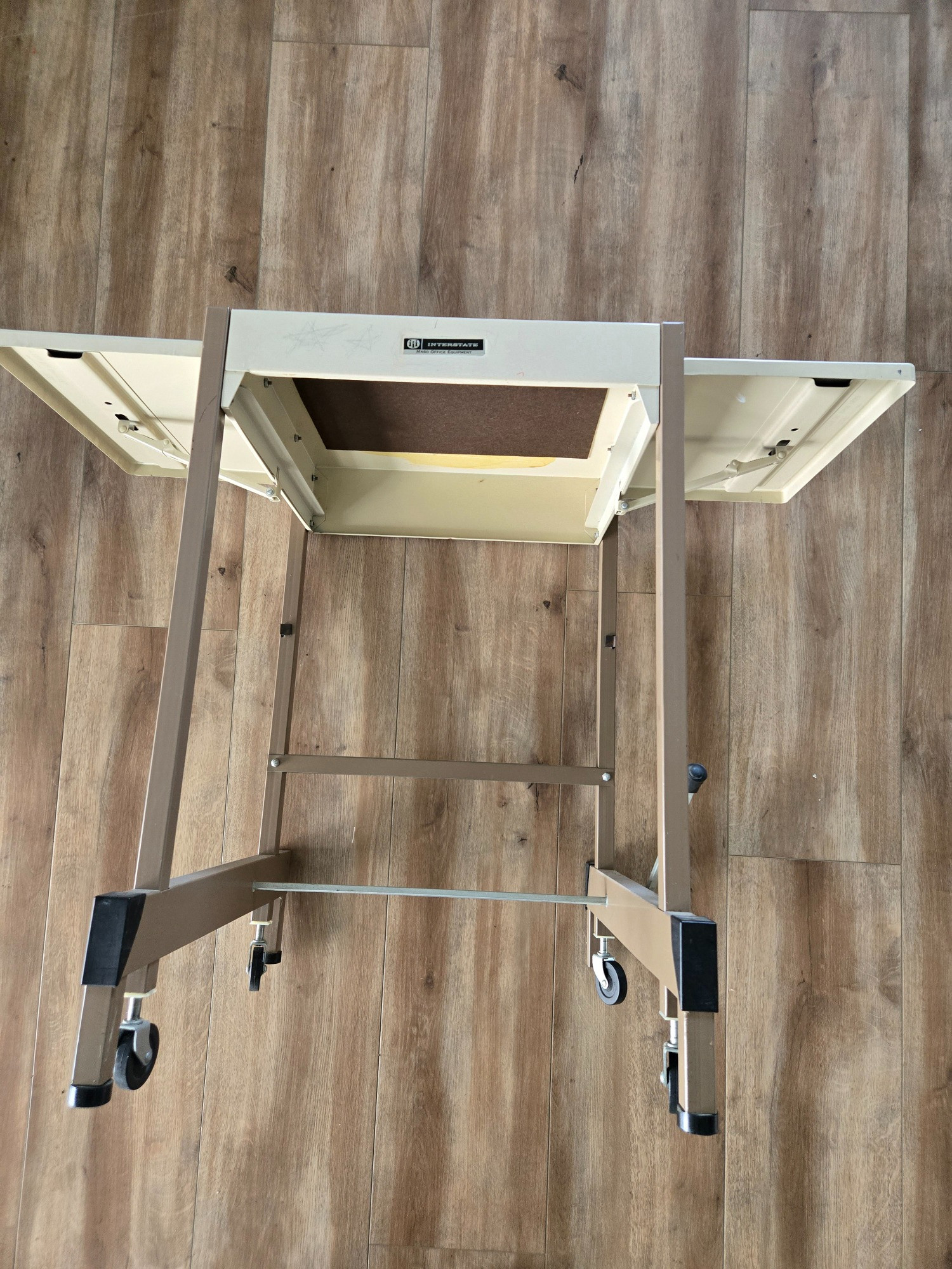 This vintage Interstate Mass Office Equipment rolling desk stand is a sturdy and functional piece, perfect for office, workshop, or home use. I Features: Metal construction with a durable beige finish Expandable side panels for added workspace Condition: The desk stand shows signs of wear, including minor scratches and scuffs consistent with age and use.