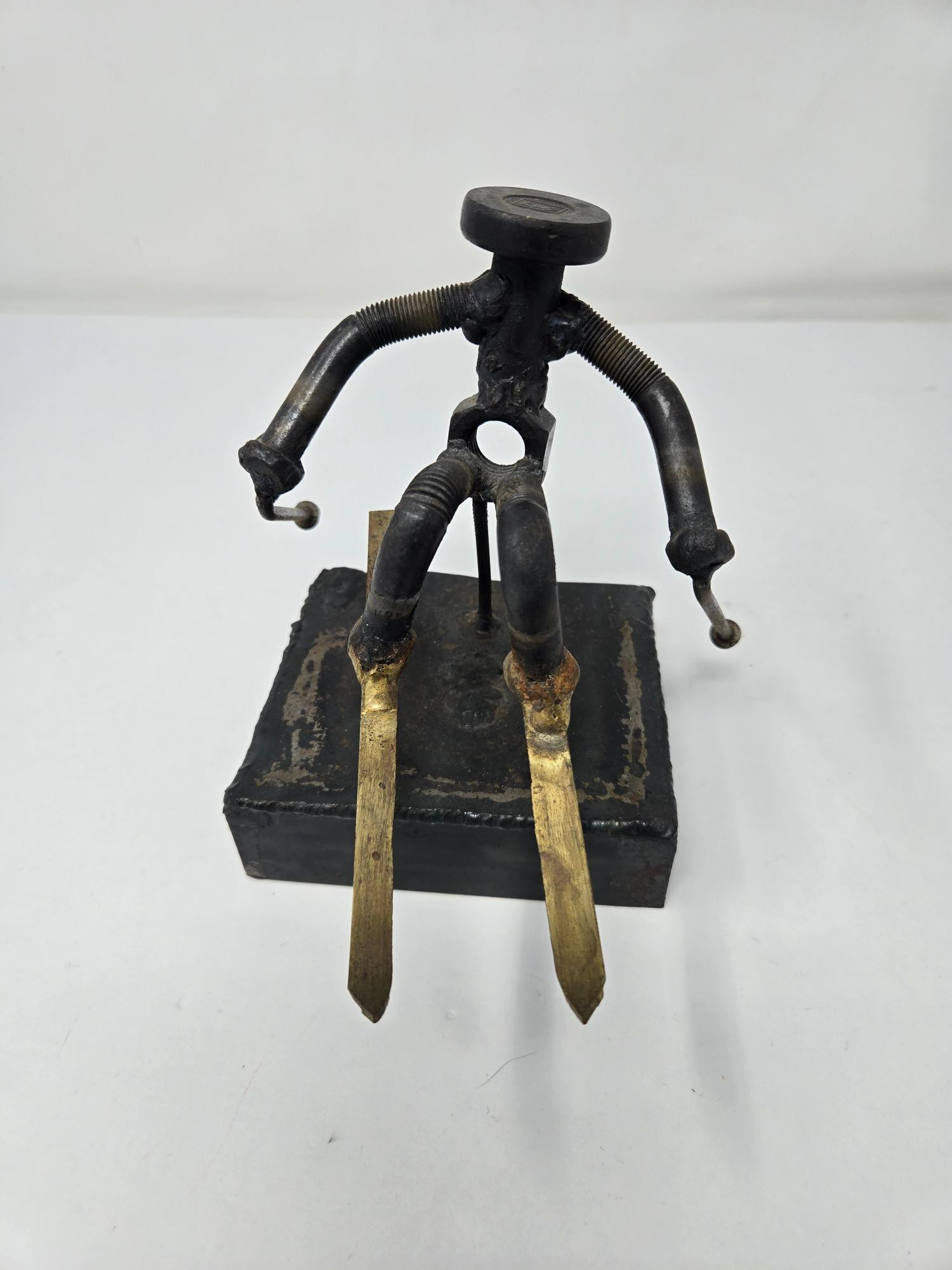 Metal Sculpture of a Skier Constructed from scrap metal pieces, including pipes, bolts,