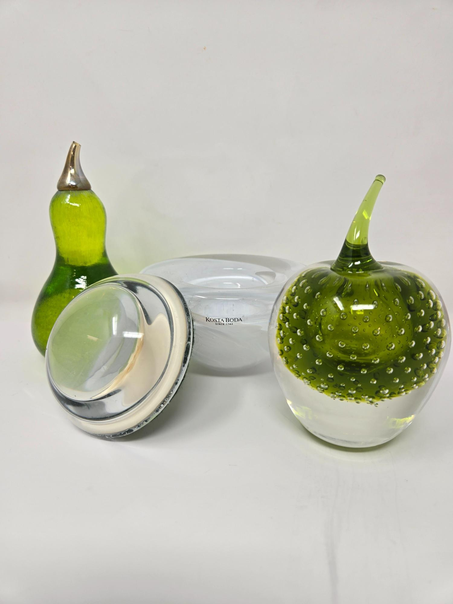 Green Apple Paper Weight, Flower 'Anlong' Paper Weight, and Kosta Boda "Atoll" votive or candle holder,