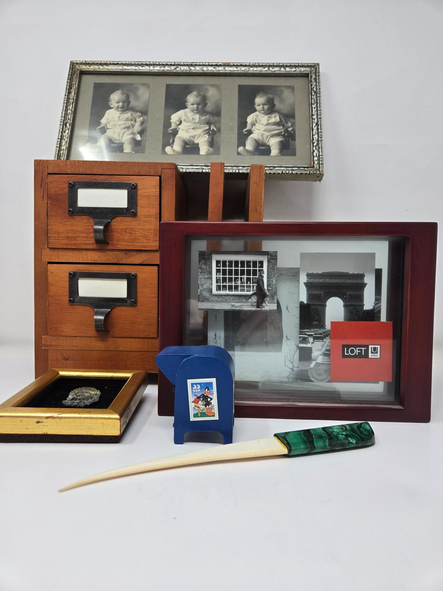 Lot # 125 - Office Essentials, Antique Frame, Stamp Dispenser, Mail Organizer..