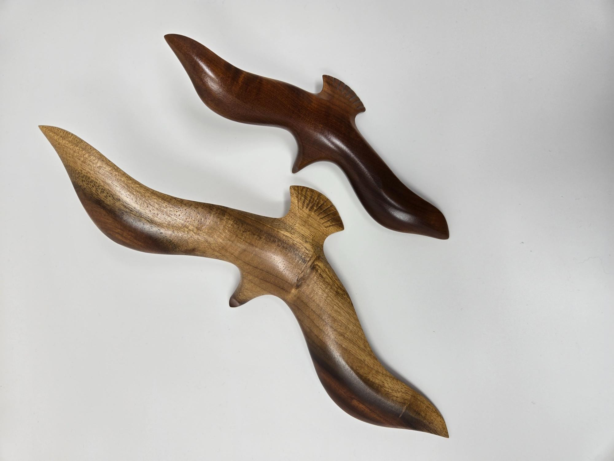 This listing features two vintage, mid-century modern seagull sculptures crafted from Myrtlewood, a hardwood known for its rich grain patterns. Larger Wall Sculpture: Material: Myrtlewood Design: Mid-century modern with clean lines and a stylized seagull in flight Artist: Possibly by Ernie Besler or another artist from the same era Mounting: Includes a metal bracket on the back for wall display Origin: Likely from Oregon, where myrtlewood is commonly found Era: Vintage, dating back to the mid-20th century Smaller Hand-Carved Seagull Figurine: Material: Myrtlewood Style: Mid-century modern Subject: Seagull Technique: Hand-carved Likely Origin: Scandinavian Function: Decorative sculpture Both pieces capture the elegance of mid-century design, making them ideal for collectors and coastal-inspired décor enthusiasts.