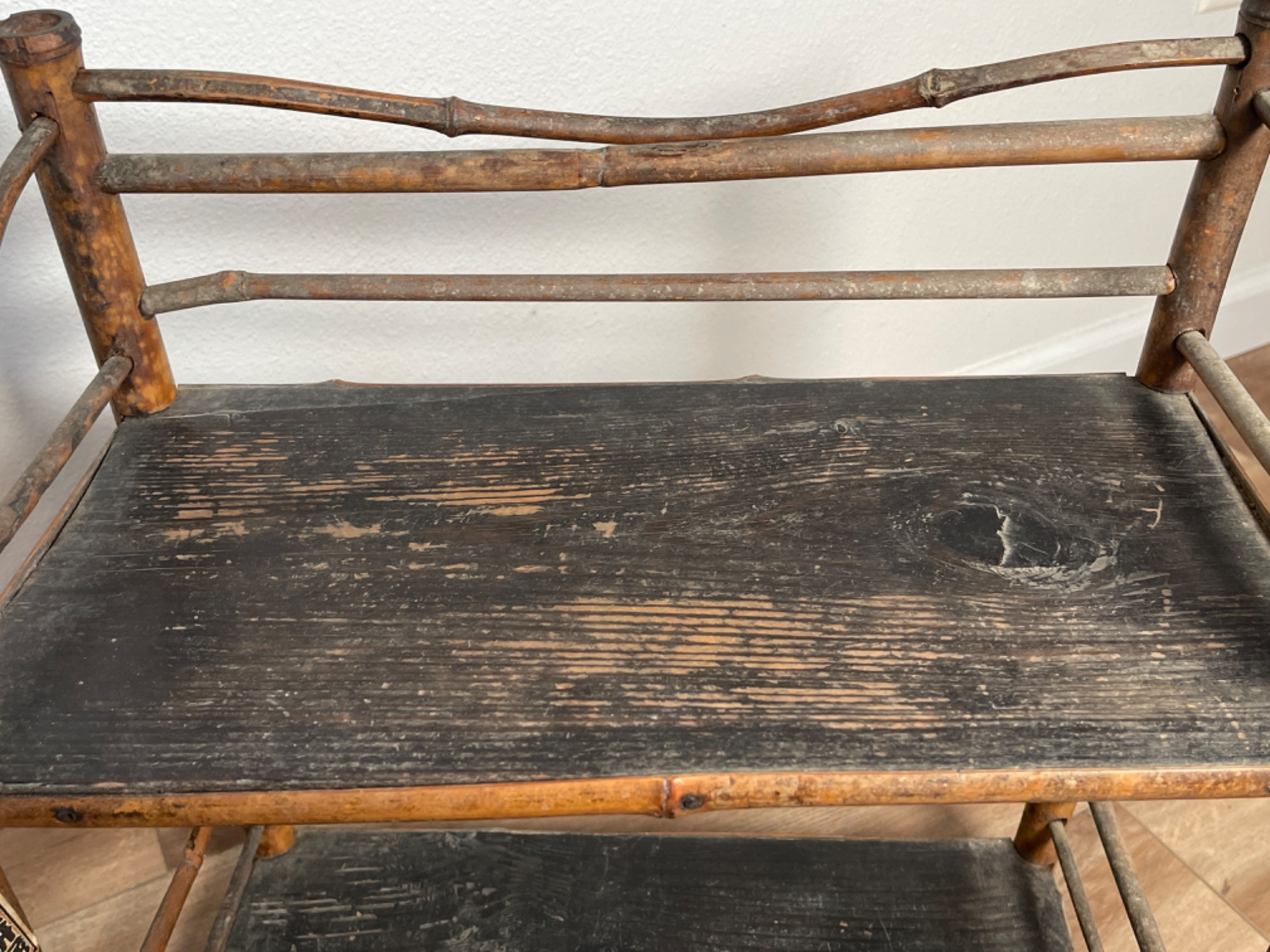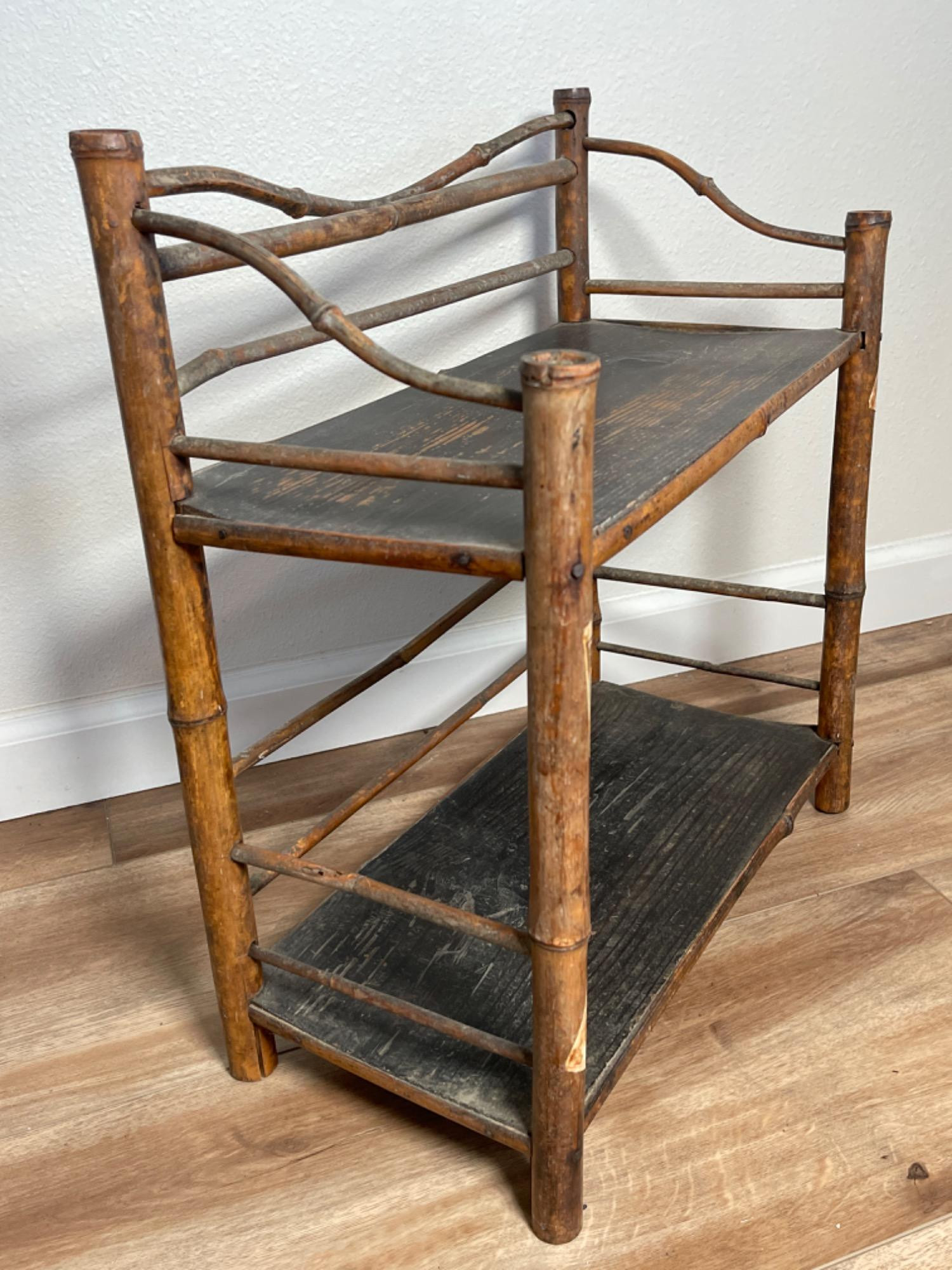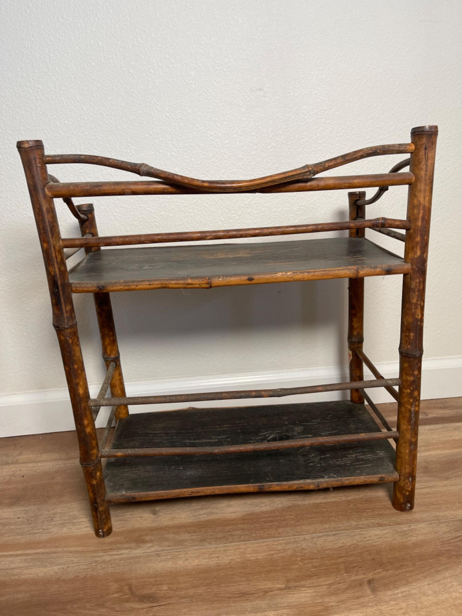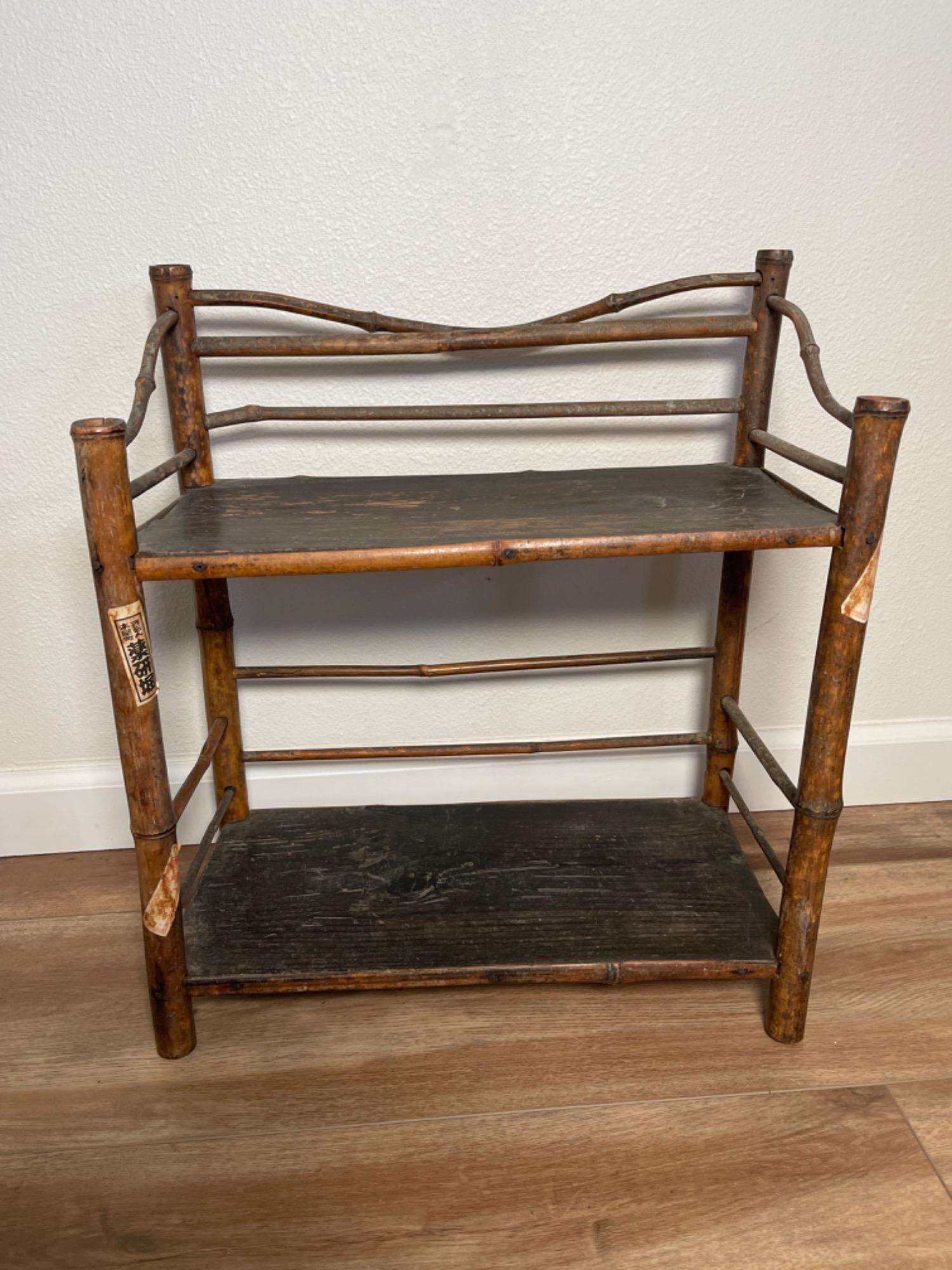 Antique Bamboo Tabletop Shelf – Rustic Charm & Timeless Elegance Add a touch of vintage charm to your space with this antique bamboo tabletop shelf. Crafted with natural bamboo, this petite shelving unit features two dark wooden tiers, supported by an intricately designed bamboo frame. Its organic curves and delicate branch-like details evoke a rustic yet sophisticated aesthetic, making it an ideal accent for any décor style. This piece is fragile and likely needs some reinforcing. Many scratches and scuffs.