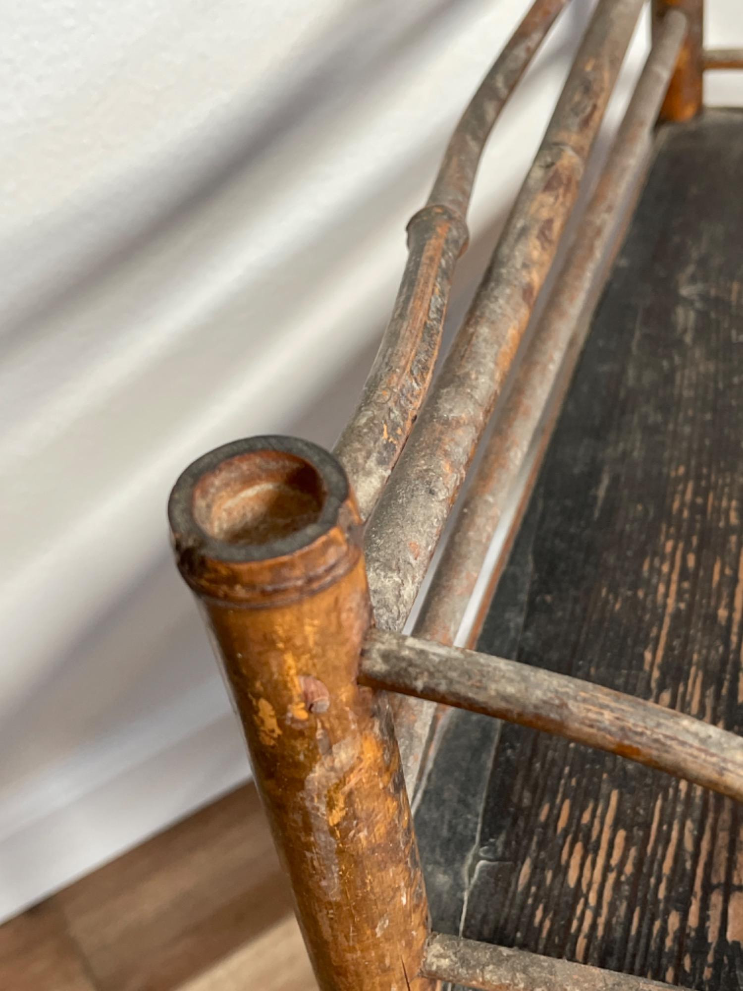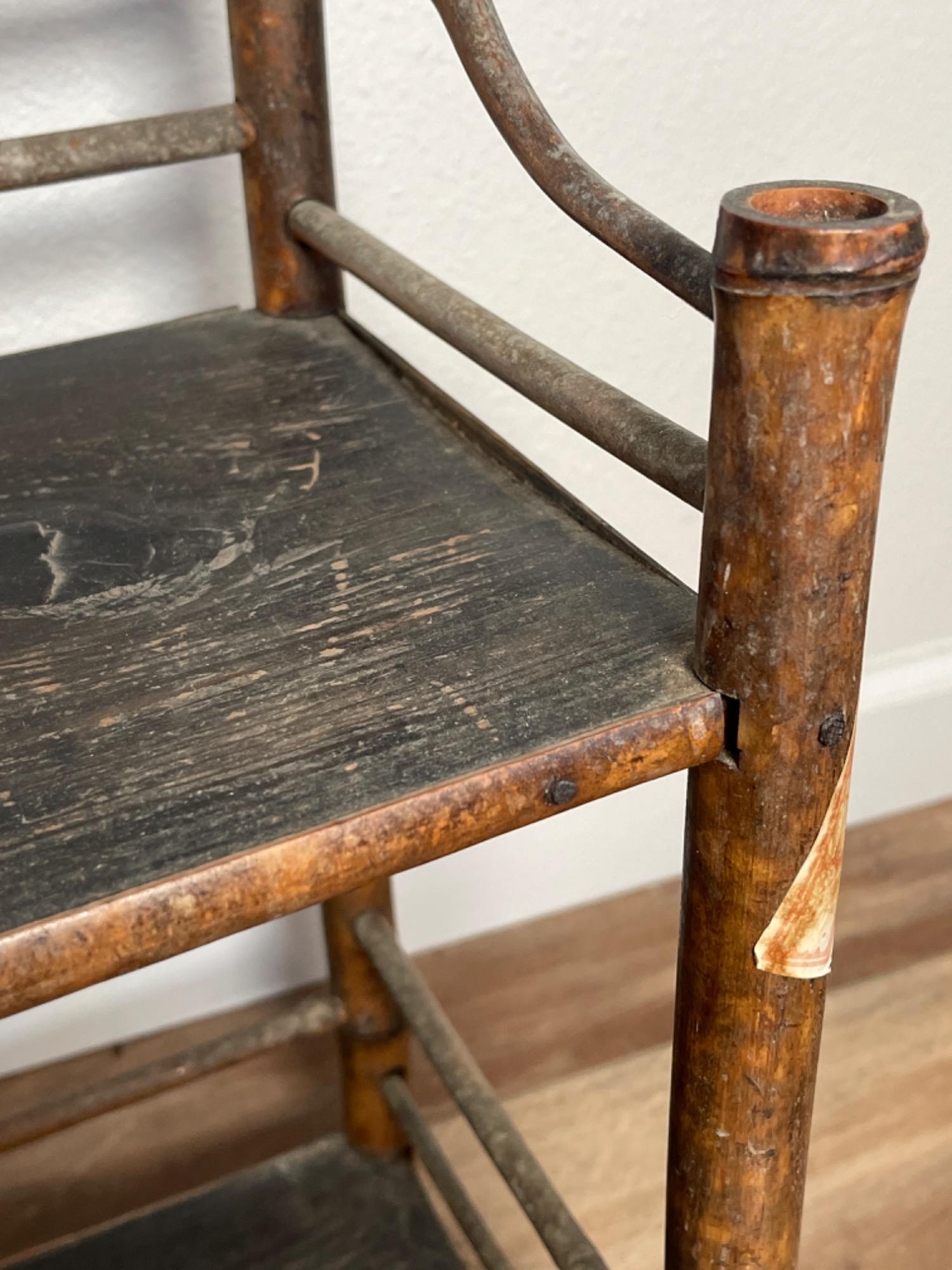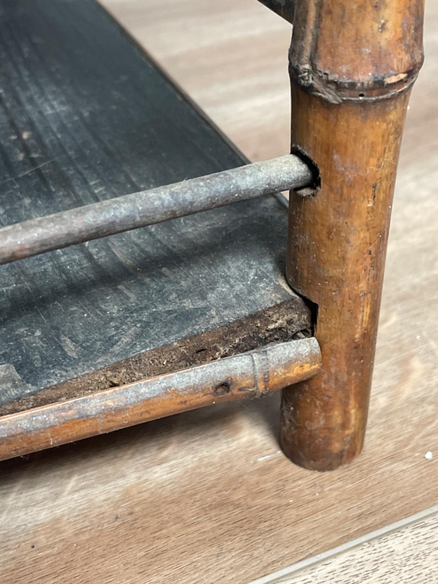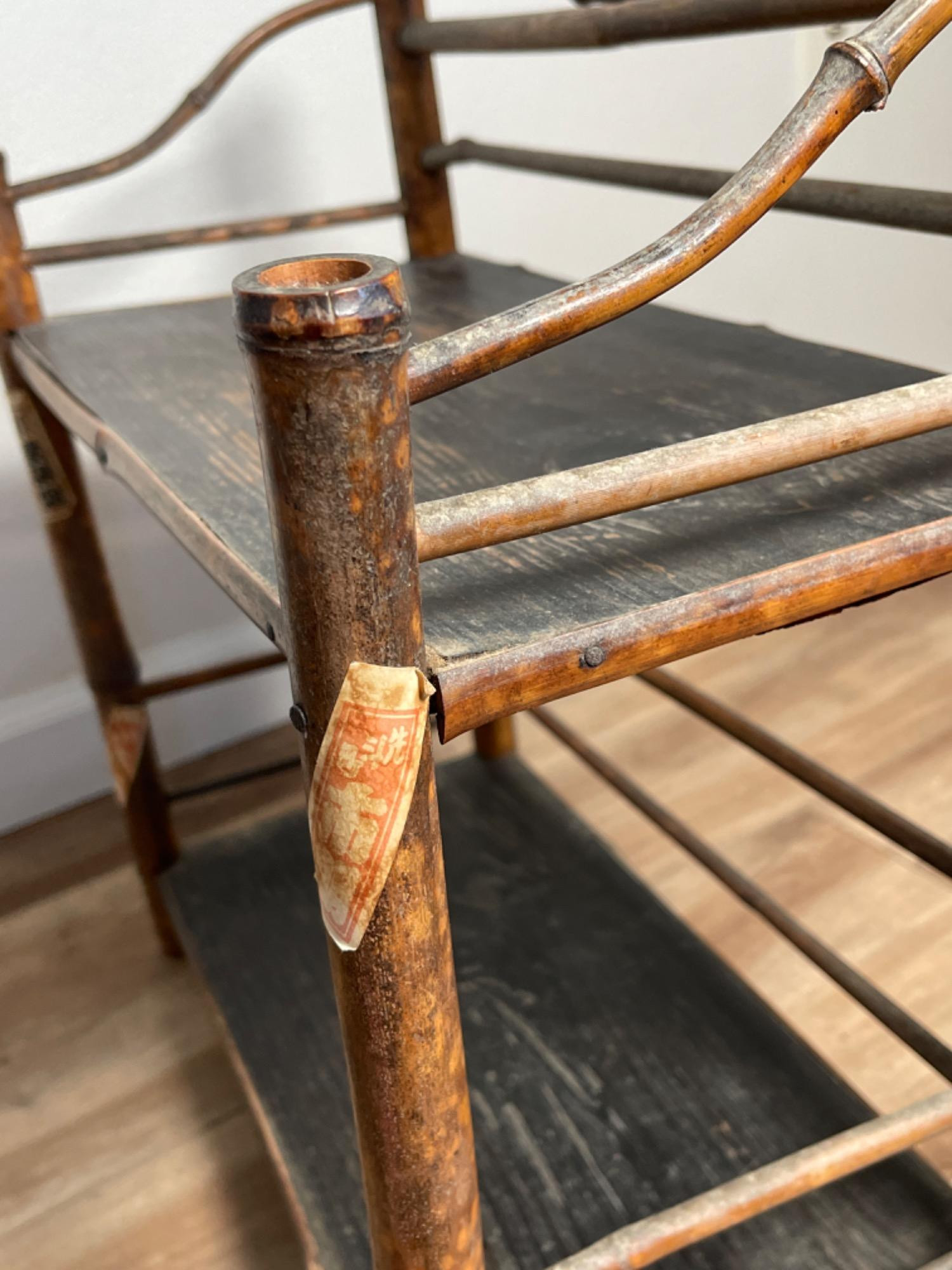 Antique Bamboo Tabletop Shelf – Rustic Charm & Timeless Elegance Add a touch of vintage charm to your space with this antique bamboo tabletop shelf. Crafted with natural bamboo, this petite shelving unit features two dark wooden tiers, supported by an intricately designed bamboo frame. Its organic curves and delicate branch-like details evoke a rustic yet sophisticated aesthetic, making it an ideal accent for any décor style. This piece is fragile and likely needs some reinforcing. Many scratches and scuffs.