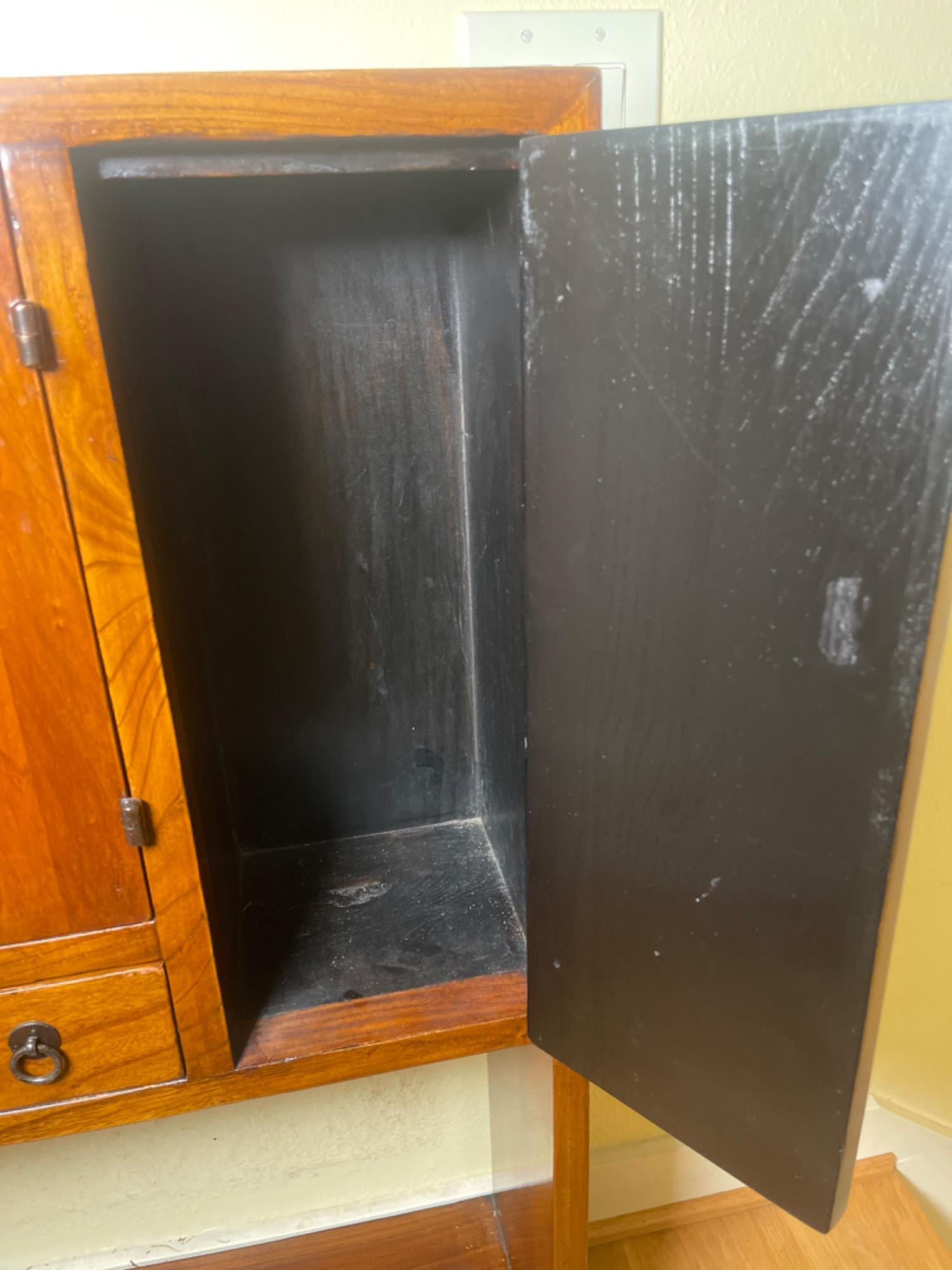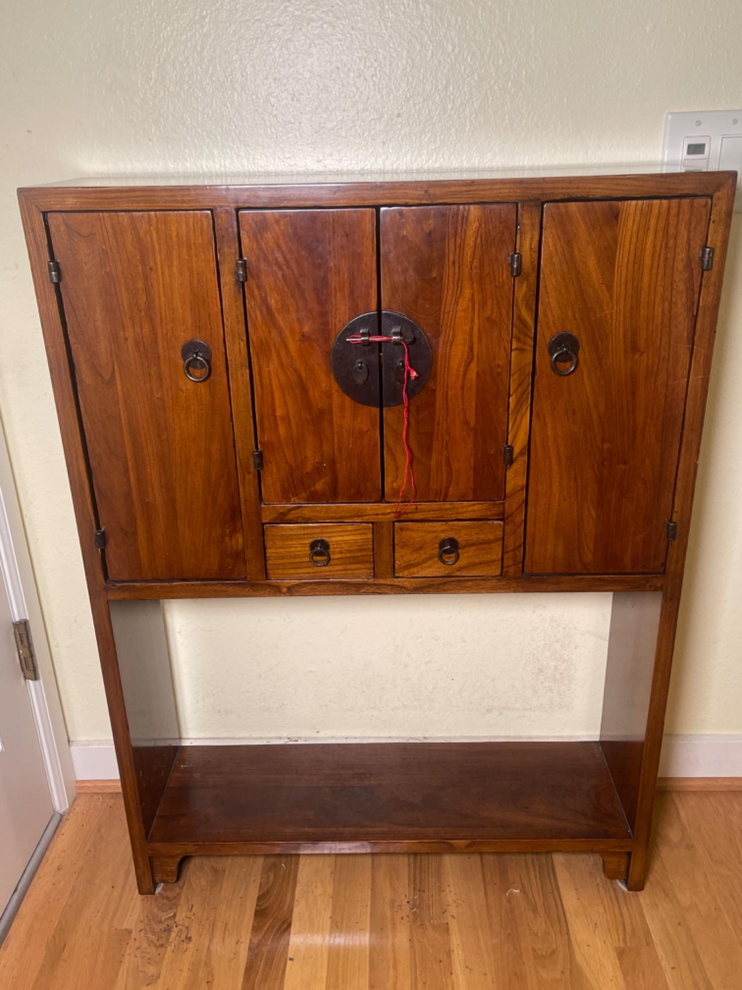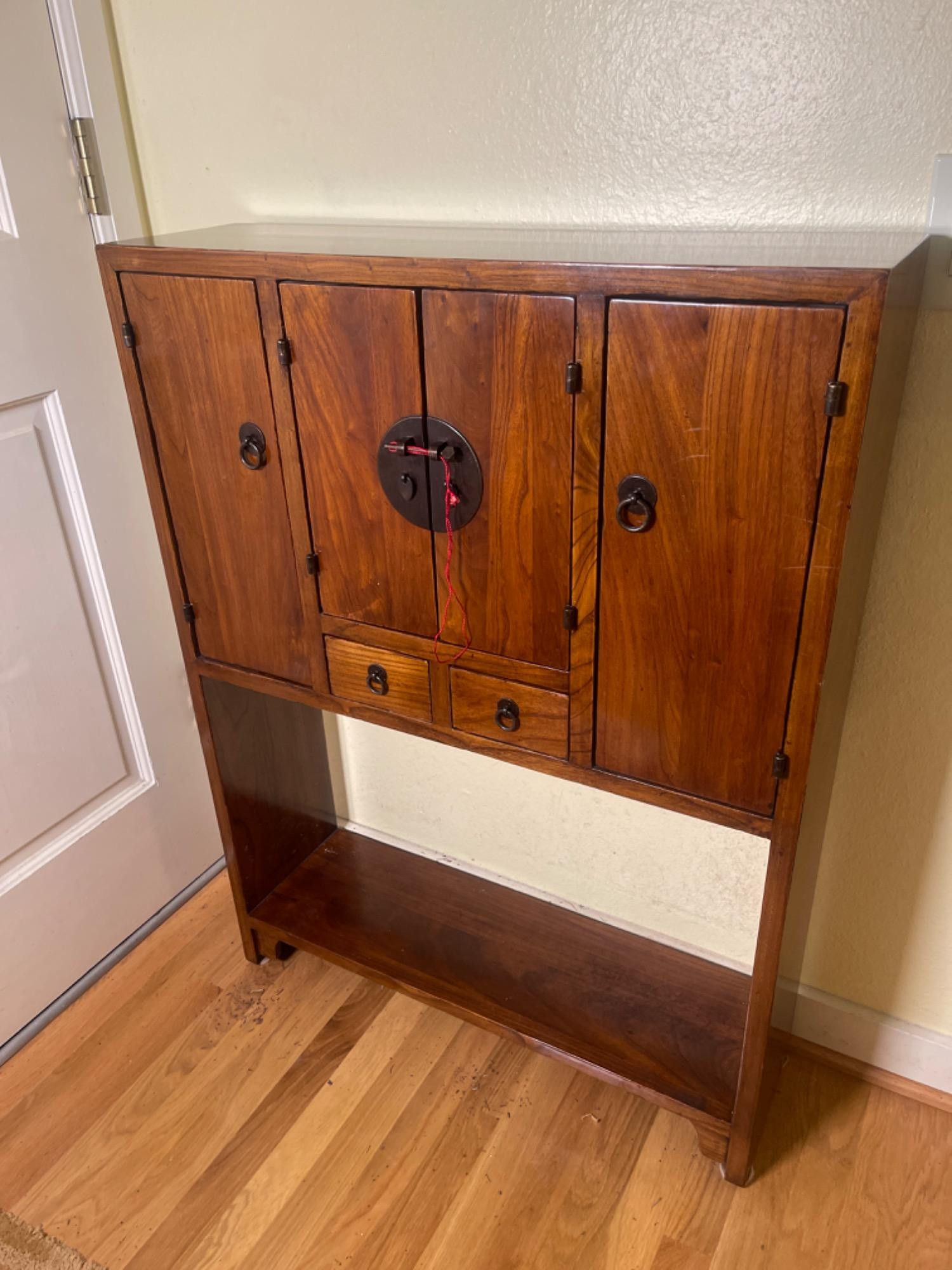 Vintage Tansu Cabinet – Handcrafted Wooden Japanese Style Storage Add a touch of Japanese-inspired craftsmanship to your home with this vintage tansu cabinet, a beautifully designed piece that seamlessly blends functionality with timeless style. This solid wood storage cabinet features a warm natural finish, accented by aged hardware and traditional ring pulls. Condition: Scuffs, scratches and stains are all present from use. Please see photos.