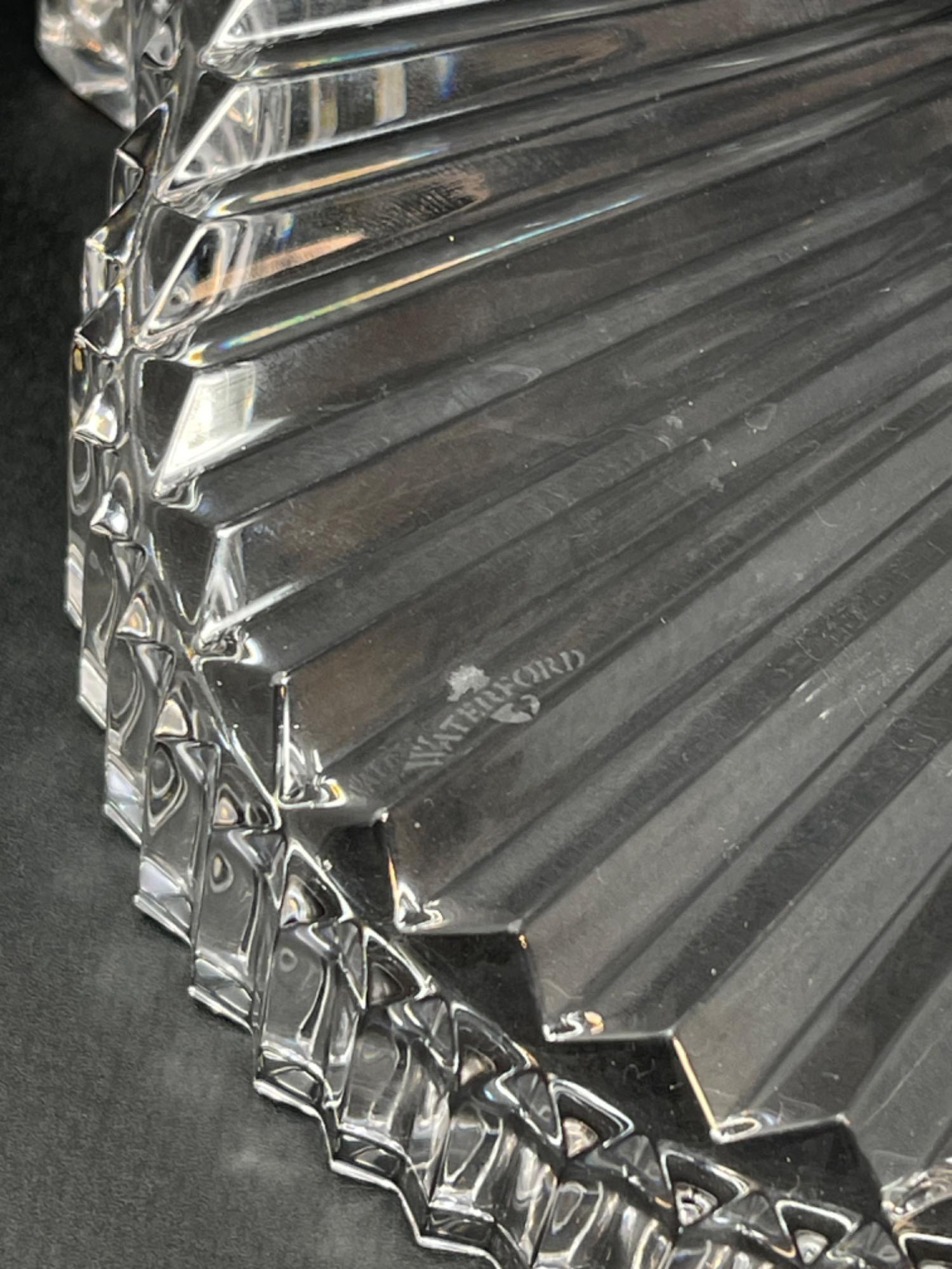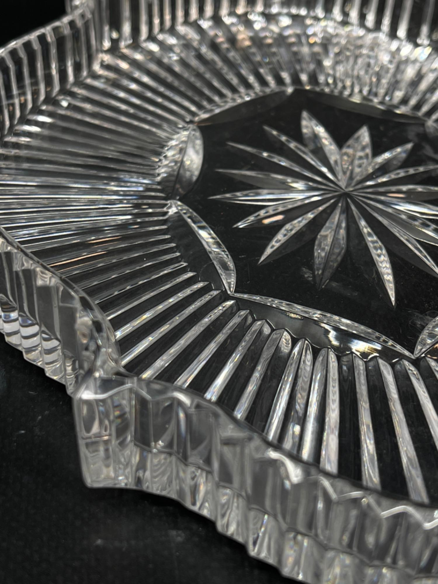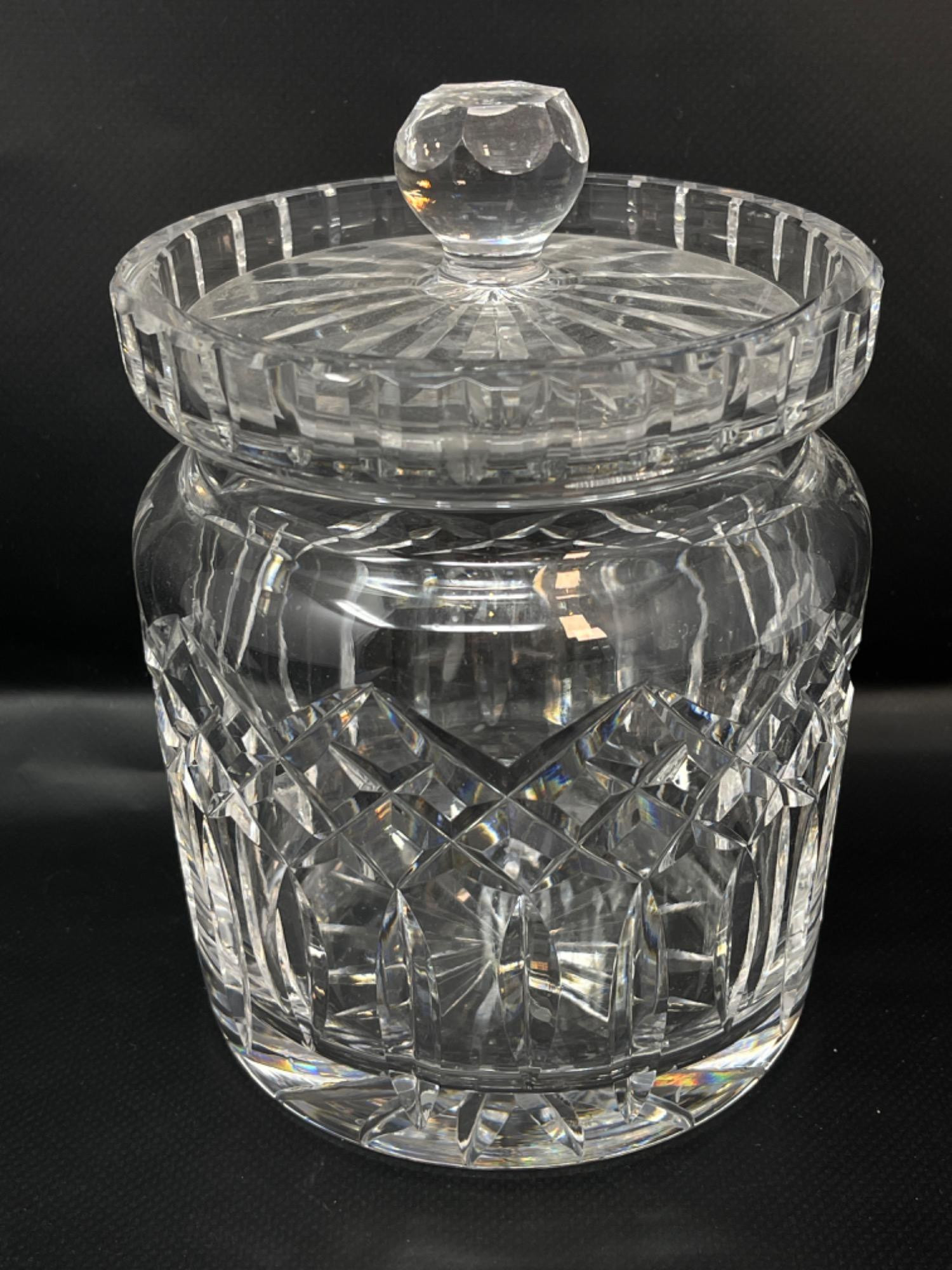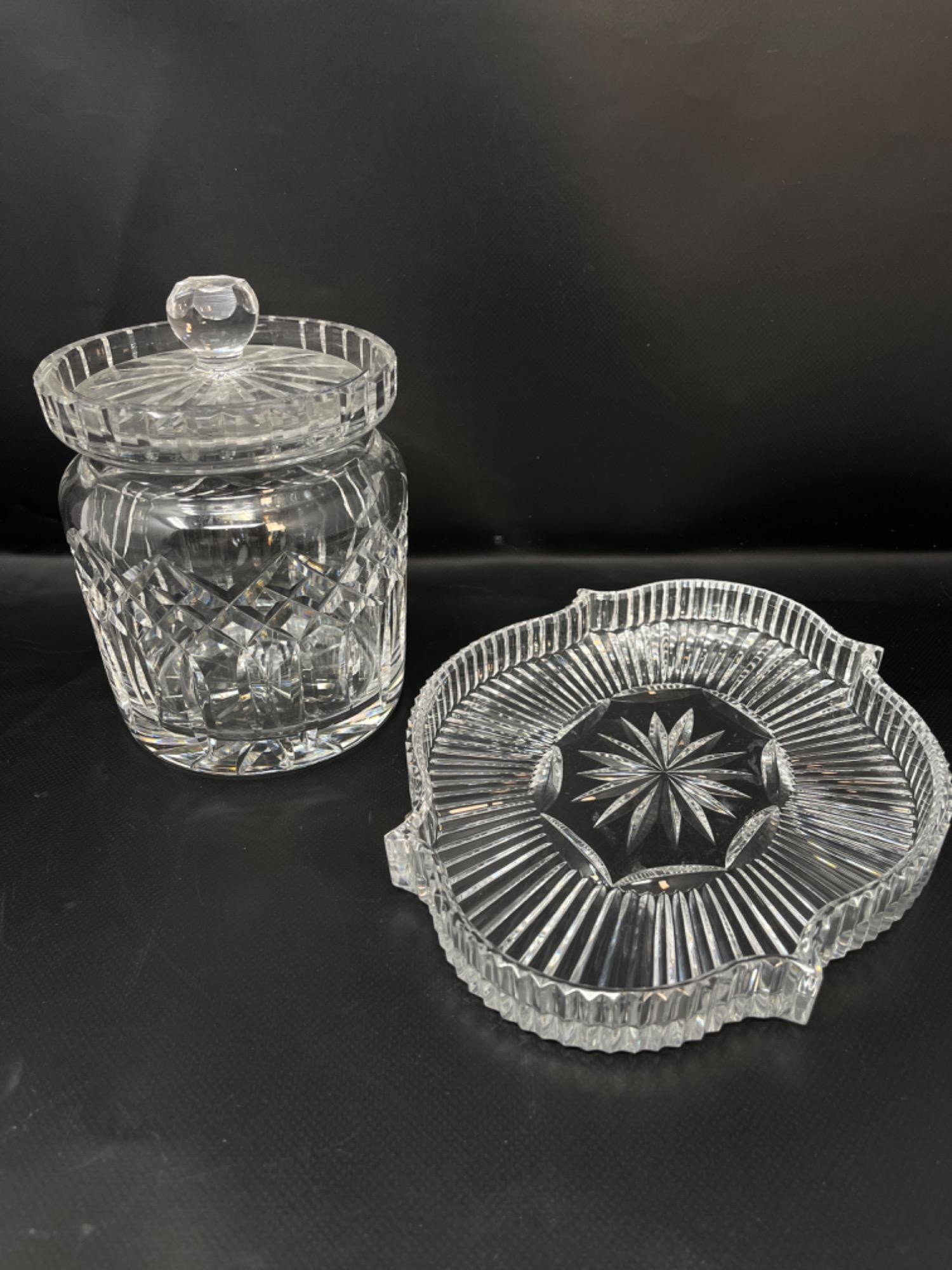Waterford Crystal Biscuit Barrel & Vanity Tray – Elegant Cut Crystal Set Enhance your home with the refined elegance of this stunning Waterford Crystal Biscuit Barrel and Vanity Tray set. Crafted with precision, both pieces feature intricate cut patterns that capture and reflect light beautifully, showcasing the timeless quality of Waterford crystal. Biscuit Barrel: This lidded jar boasts a classic diamond and wedge-cut design, complete with a faceted finial, making it perfect for storing biscuits, cookies, or small treats. Its luxurious craftsmanship makes it a stunning centerpiece for any table or display. Vanity Tray: With a starburst center and fluted edges, this tray is perfect for holding jewelry, perfumes, or decorative items, adding a touch of sophistication to any vanity or dresser. Condition: Both pieces are in excellent condition, with no visible chips, cracks, or damage, ensuring their brilliance and beauty remain intact. Biscuit Barrel: 6.5” H Vanity Tray: 10” W