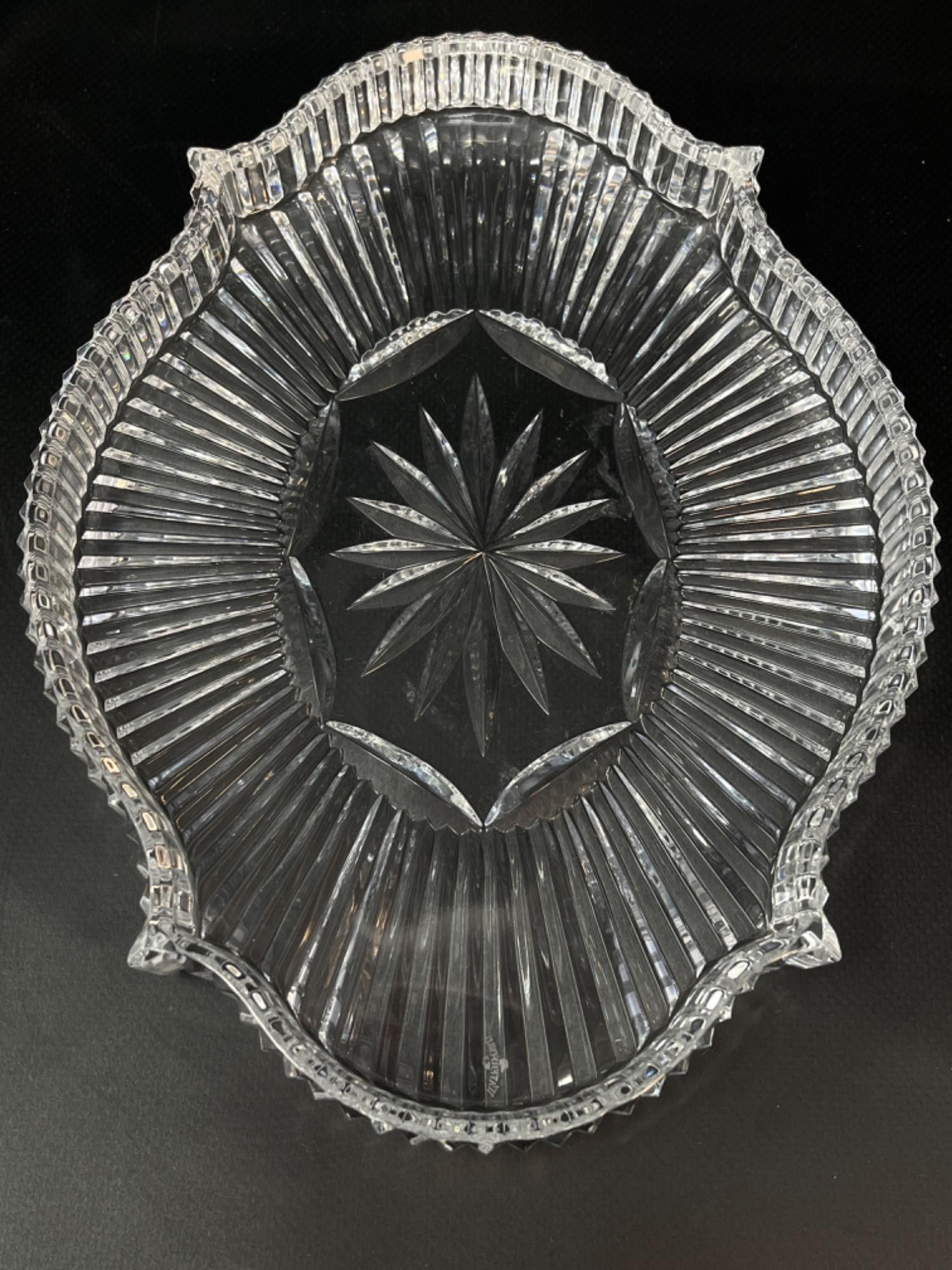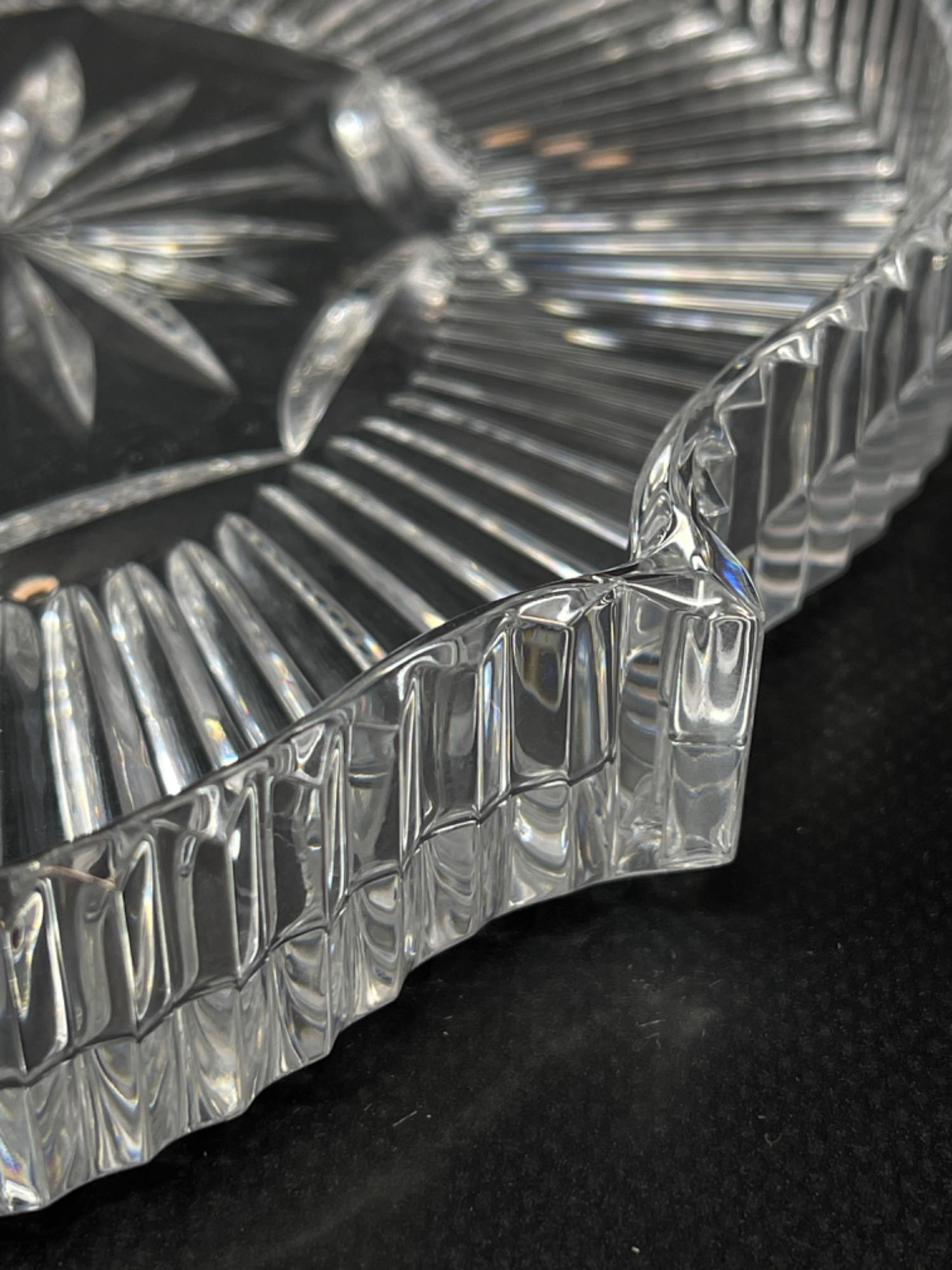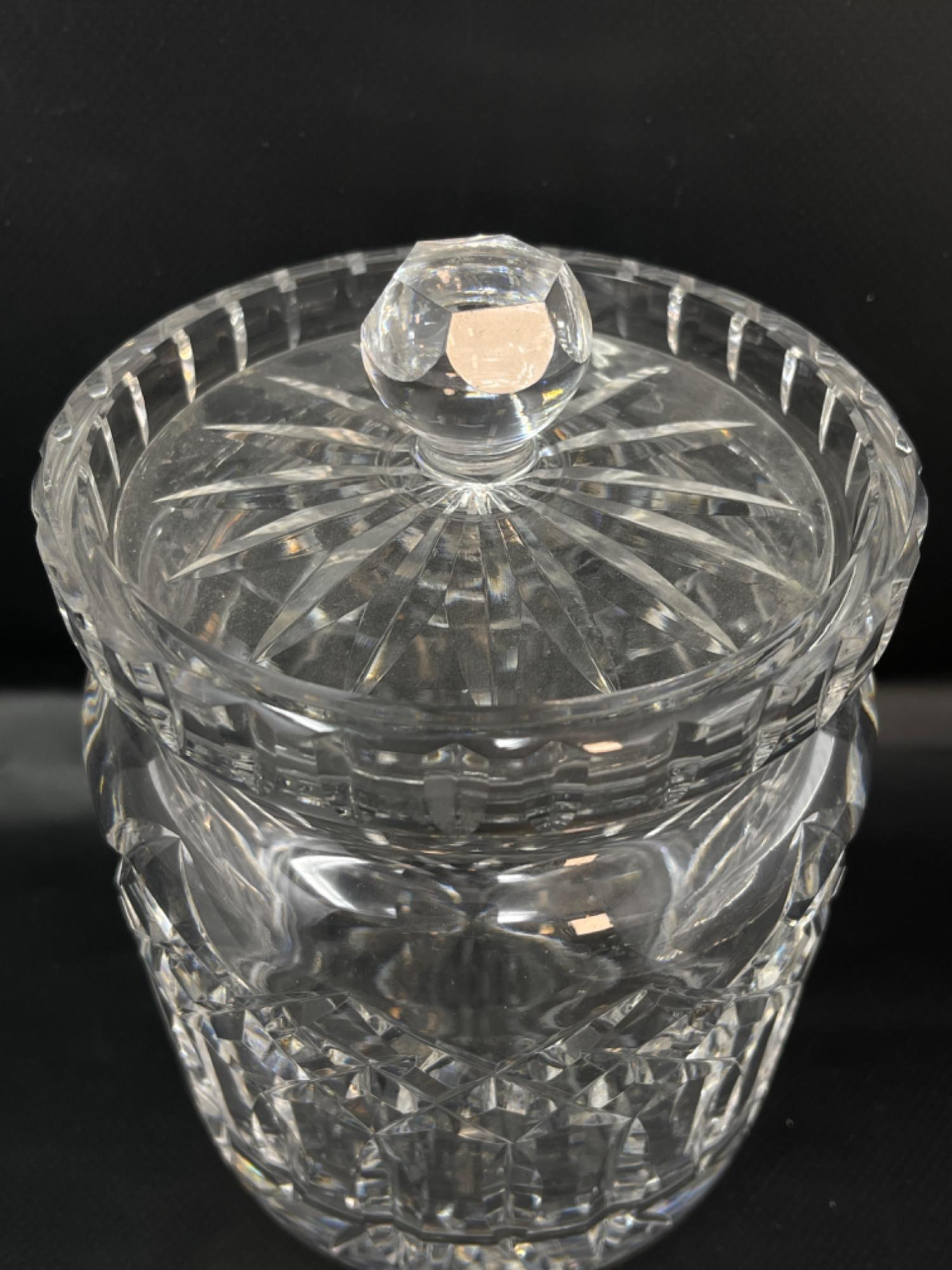 Waterford Crystal Biscuit Barrel & Vanity Tray – Elegant Cut Crystal Set Enhance your home with the refined elegance of this stunning Waterford Crystal Biscuit Barrel and Vanity Tray set. Crafted with precision, both pieces feature intricate cut patterns that capture and reflect light beautifully, showcasing the timeless quality of Waterford crystal. Biscuit Barrel: This lidded jar boasts a classic diamond and wedge-cut design, complete with a faceted finial, making it perfect for storing biscuits, cookies, or small treats. Its luxurious craftsmanship makes it a stunning centerpiece for any table or display. Vanity Tray: With a starburst center and fluted edges, this tray is perfect for holding jewelry, perfumes, or decorative items, adding a touch of sophistication to any vanity or dresser. Condition: Both pieces are in excellent condition, with no visible chips, cracks, or damage, ensuring their brilliance and beauty remain intact. Biscuit Barrel: 6.5” H Vanity Tray: 10” W