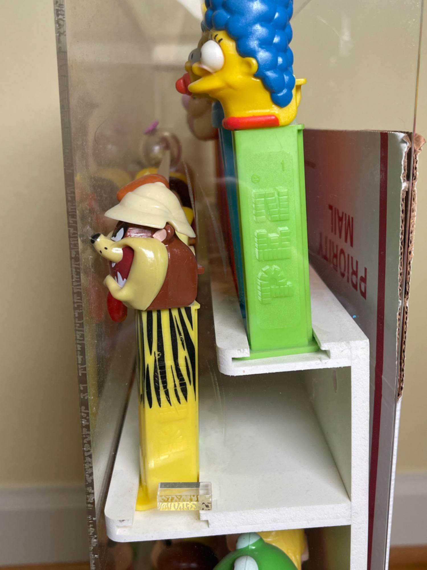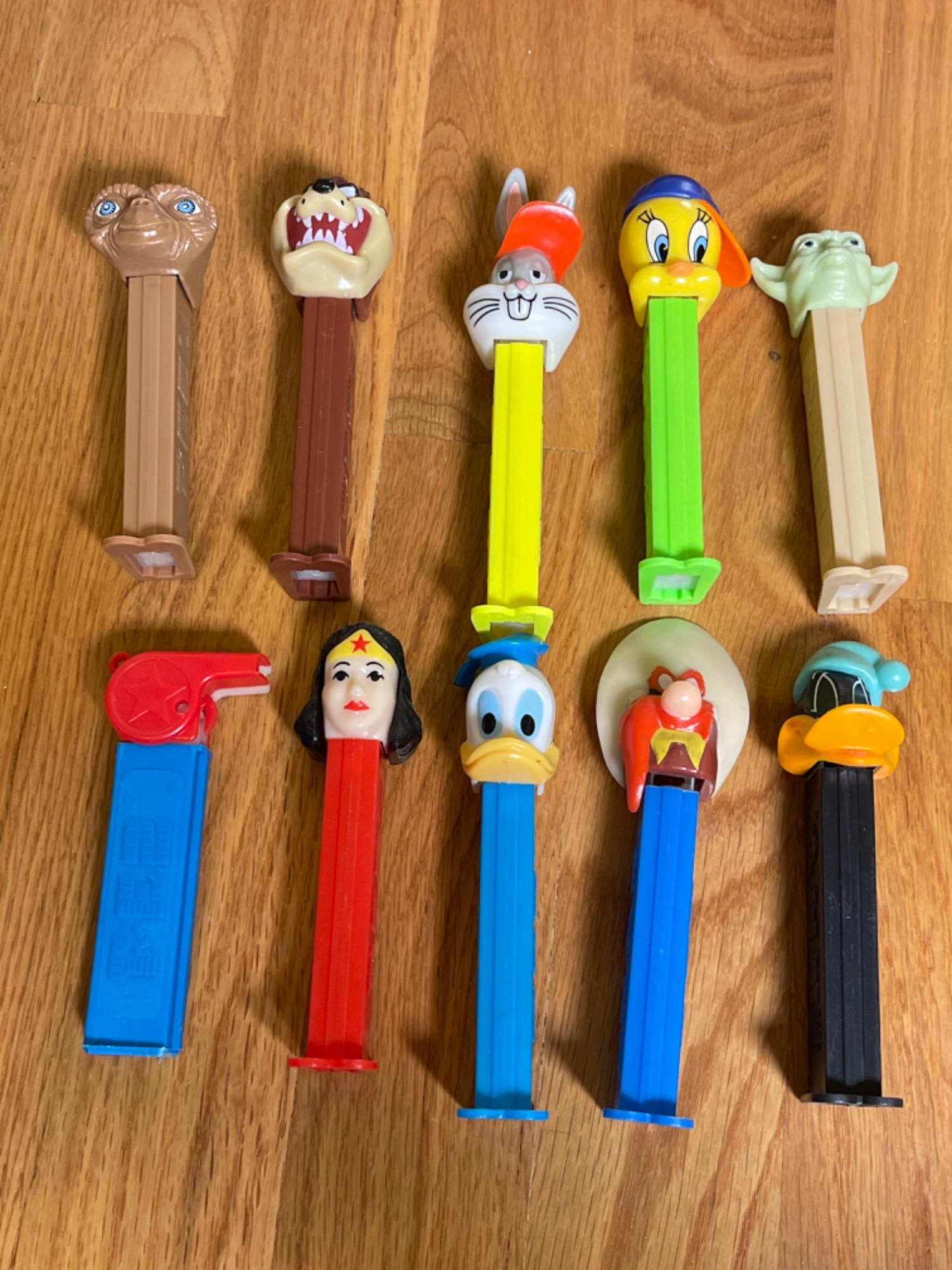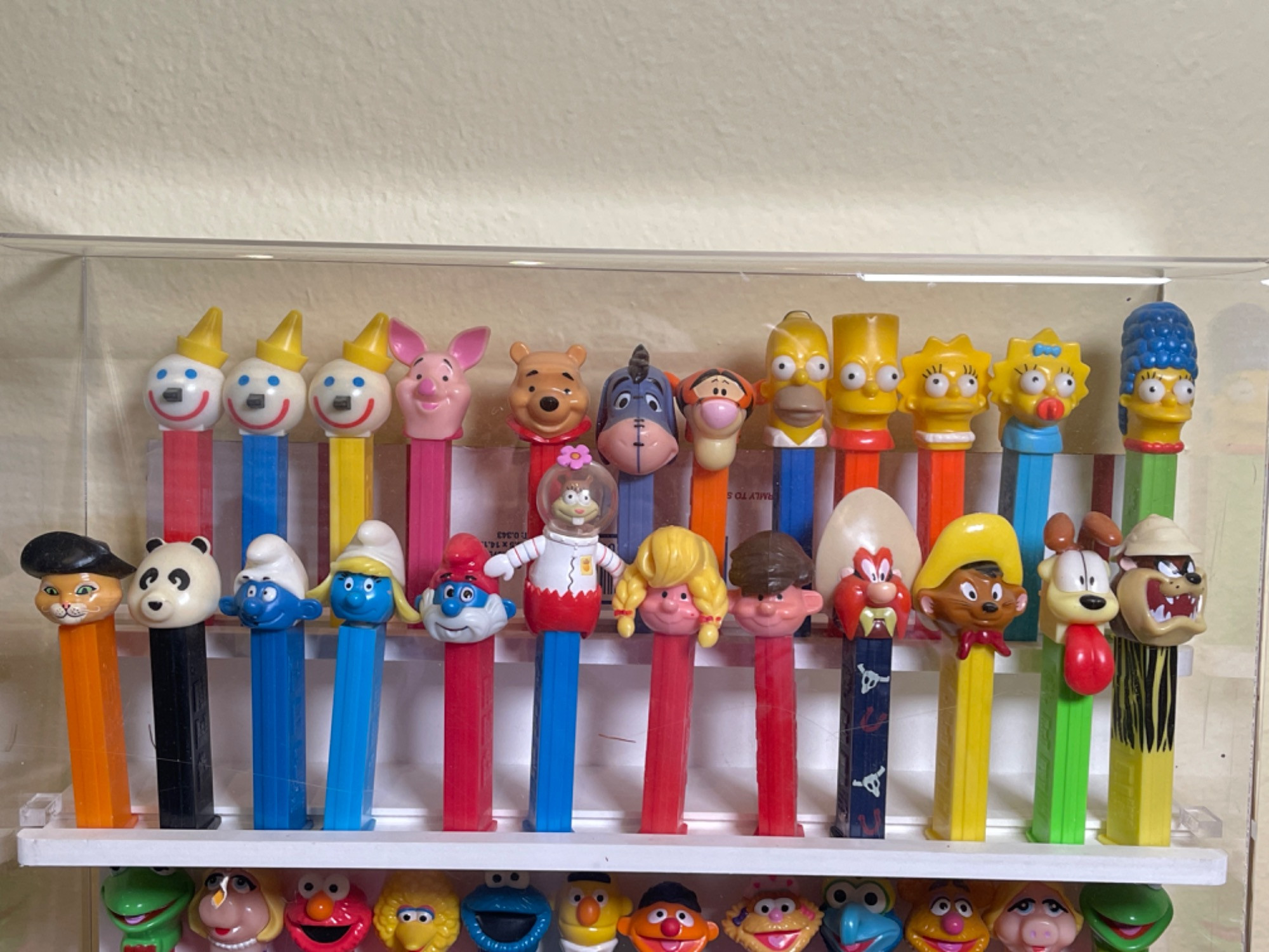 A fantastic assortment of PEZ dispensers featuring a variety of beloved characters from classic cartoons, movies, and pop culture. This collection includes well-known figures such as The Simpsons, Disney characters, superheroes, Star Wars, and more. Many dispensers appear to be vintage, making this a great find for collectors and nostalgic enthusiasts alike.