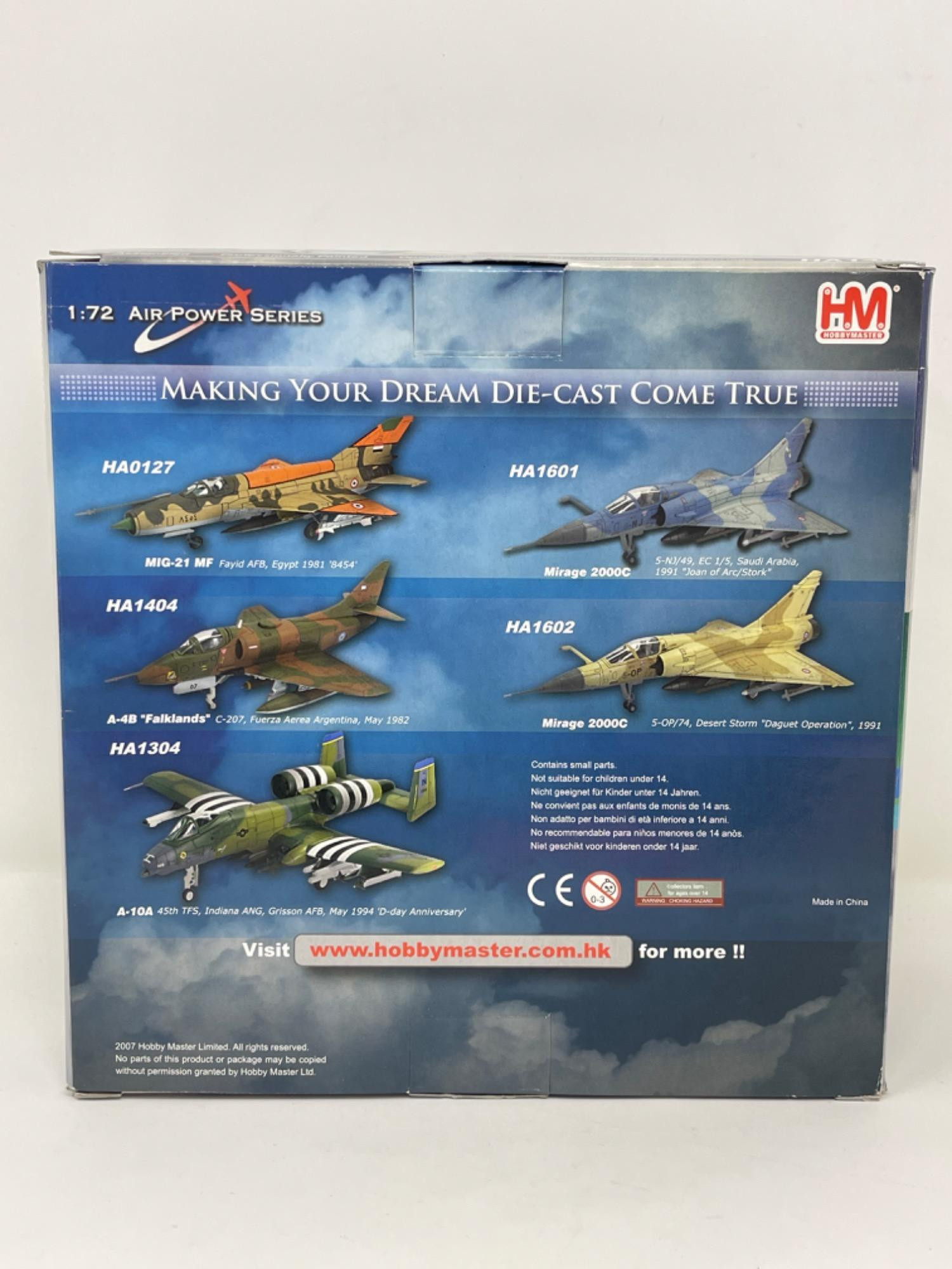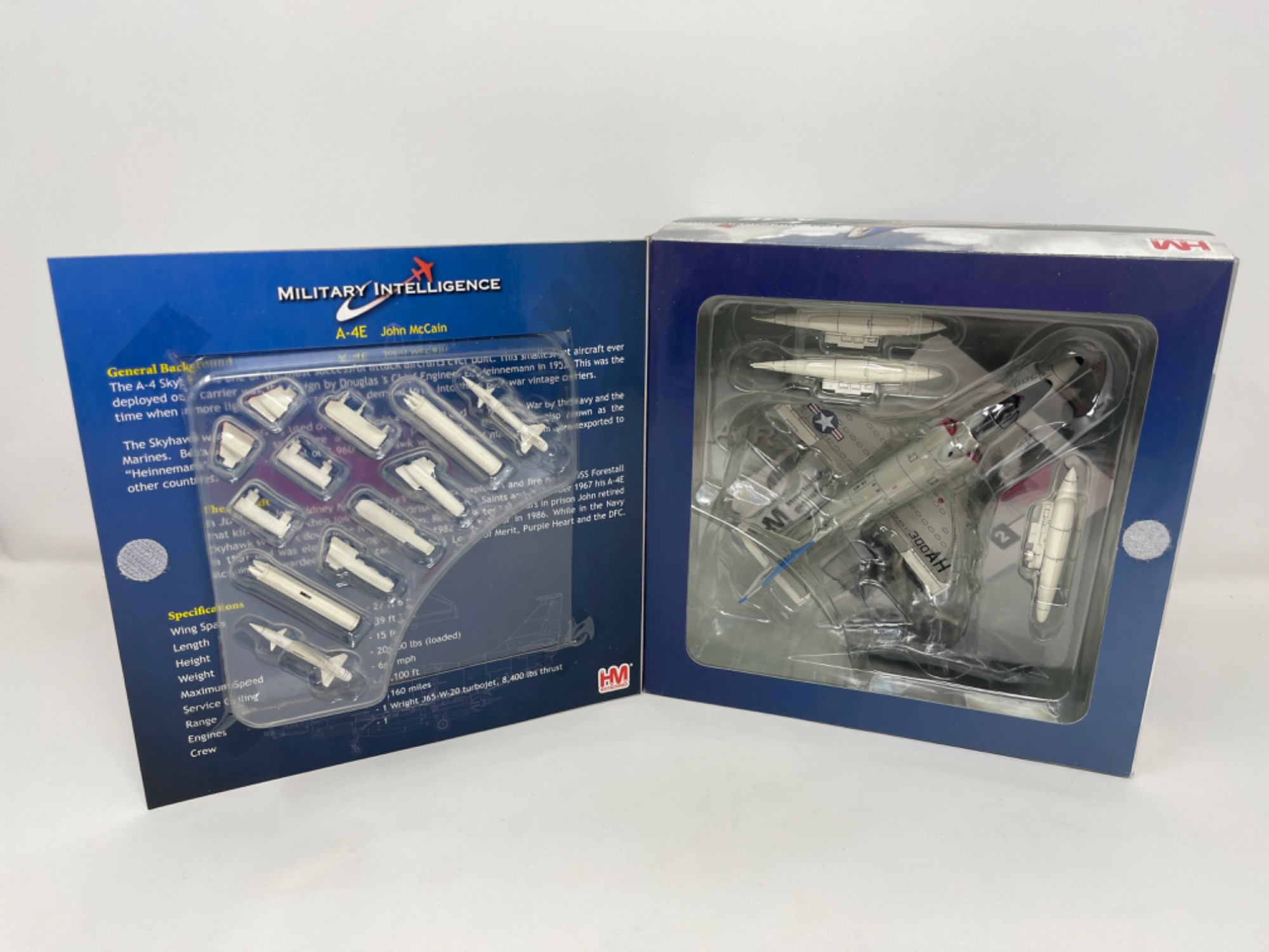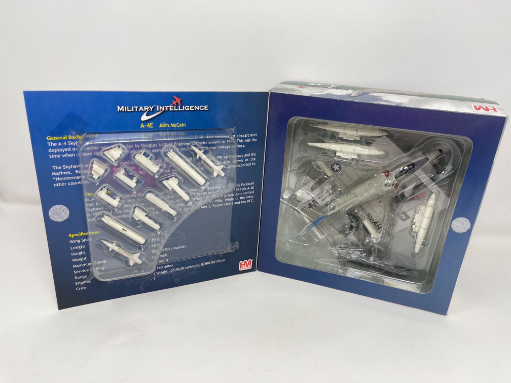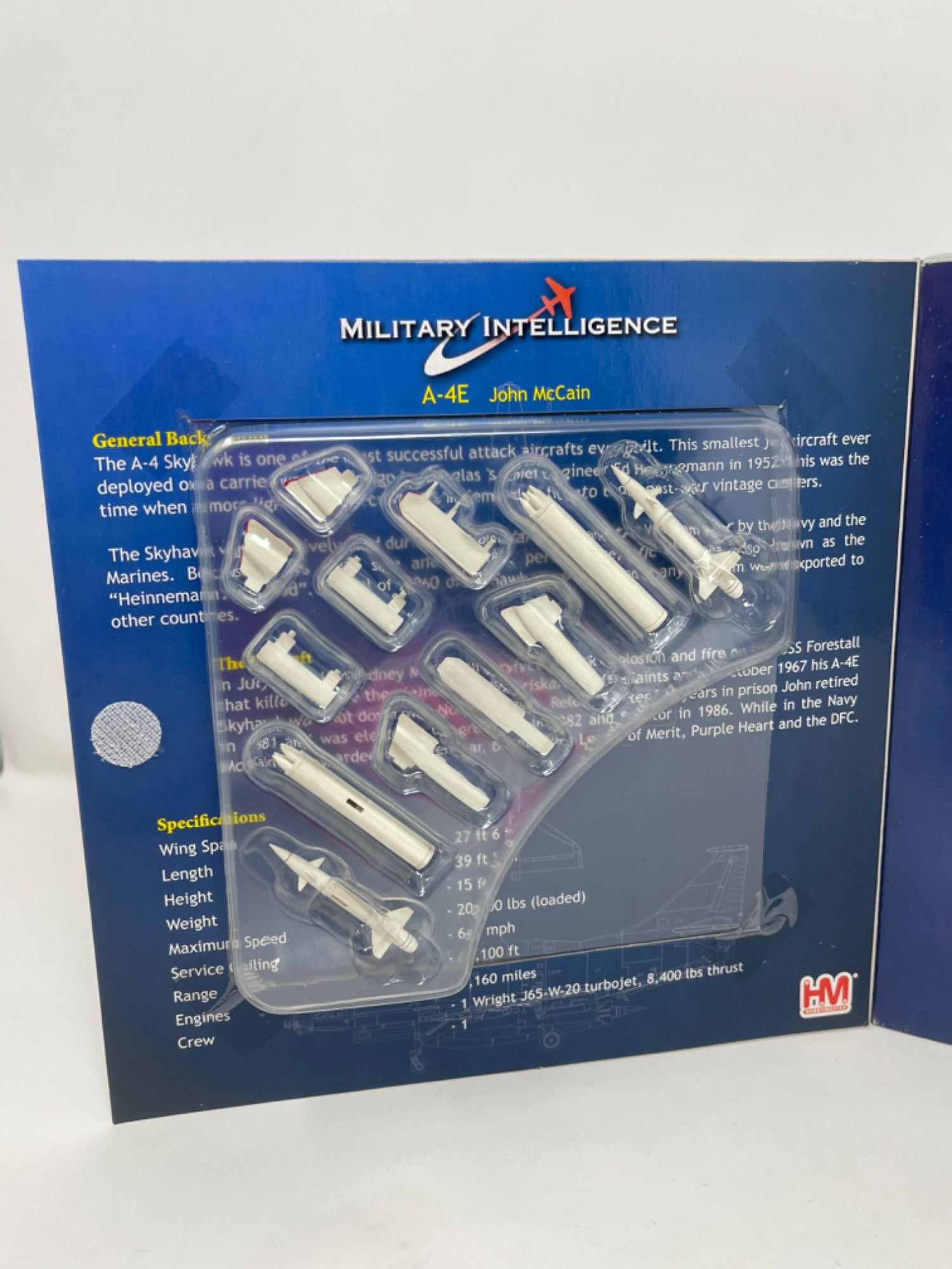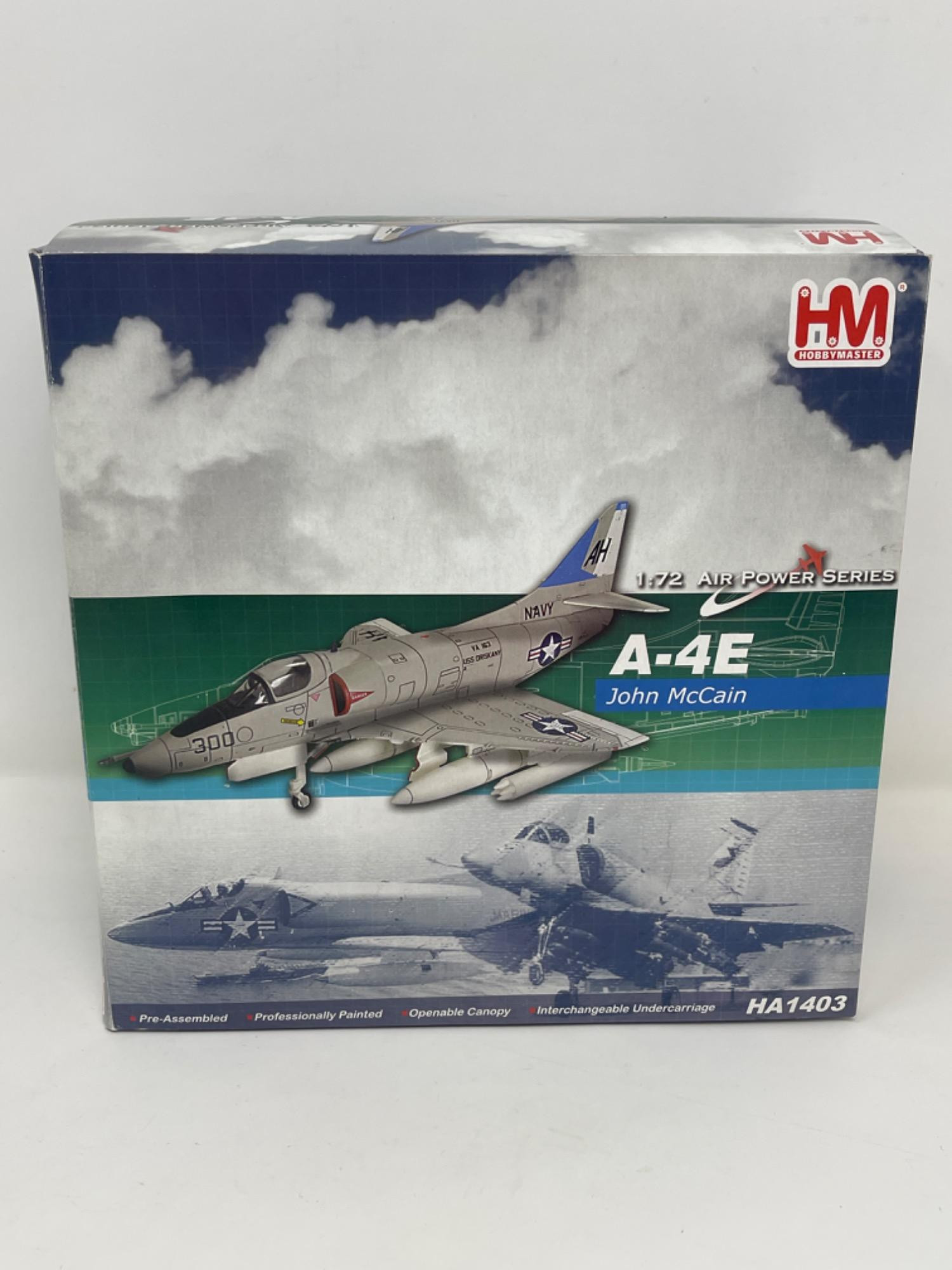 Hobby Master 1:72 A-4E Skyhawk – John McCain Edition (HA1403) – Unopened This Hobby Master 1:72 scale A-4E Skyhawk is a professionally crafted diecast model, commemorating the aircraft flown by John McCain during his service in the U.S. Navy. Part of the Air Power Series, this highly detailed model is pre-assembled, professionally painted, and features an openable canopy and interchangeable undercarriage for display versatility. The A-4E Skyhawk, a compact and agile carrier-capable attack aircraft, played a pivotal role in U.S. military operations. This model authentically replicates McCain’s Skyhawk, with meticulously applied Navy markings, realistic panel lines, and an array of ordnance options included in the set. Product Features: Scale: 1:72 Diecast Model Manufacturer: Hobby Master Model Number: HA1403 Aircraft: A-4E Skyhawk – John McCain Edition Condition: Unopened. Minor scuffs and dents to box. Box is 8” H