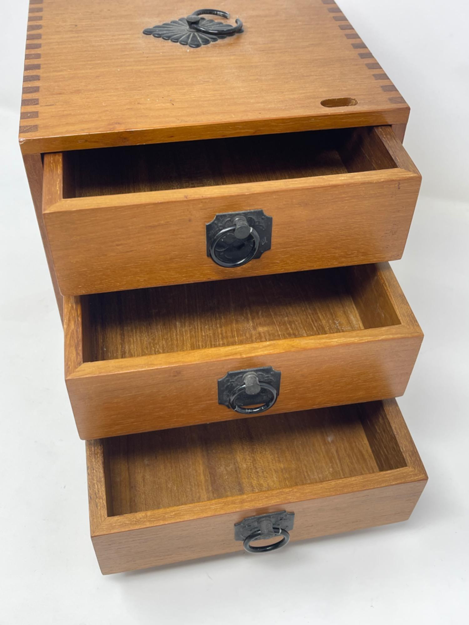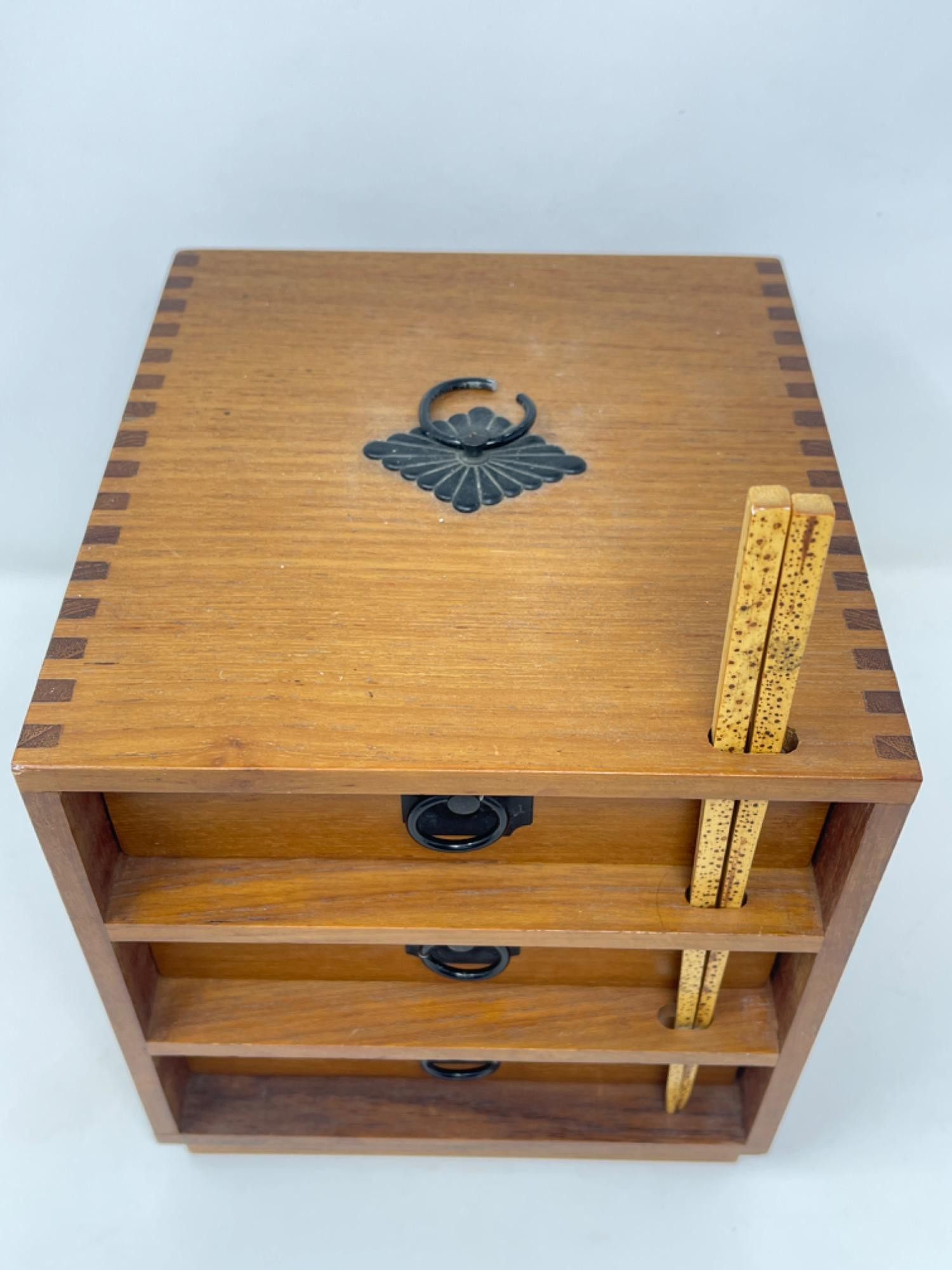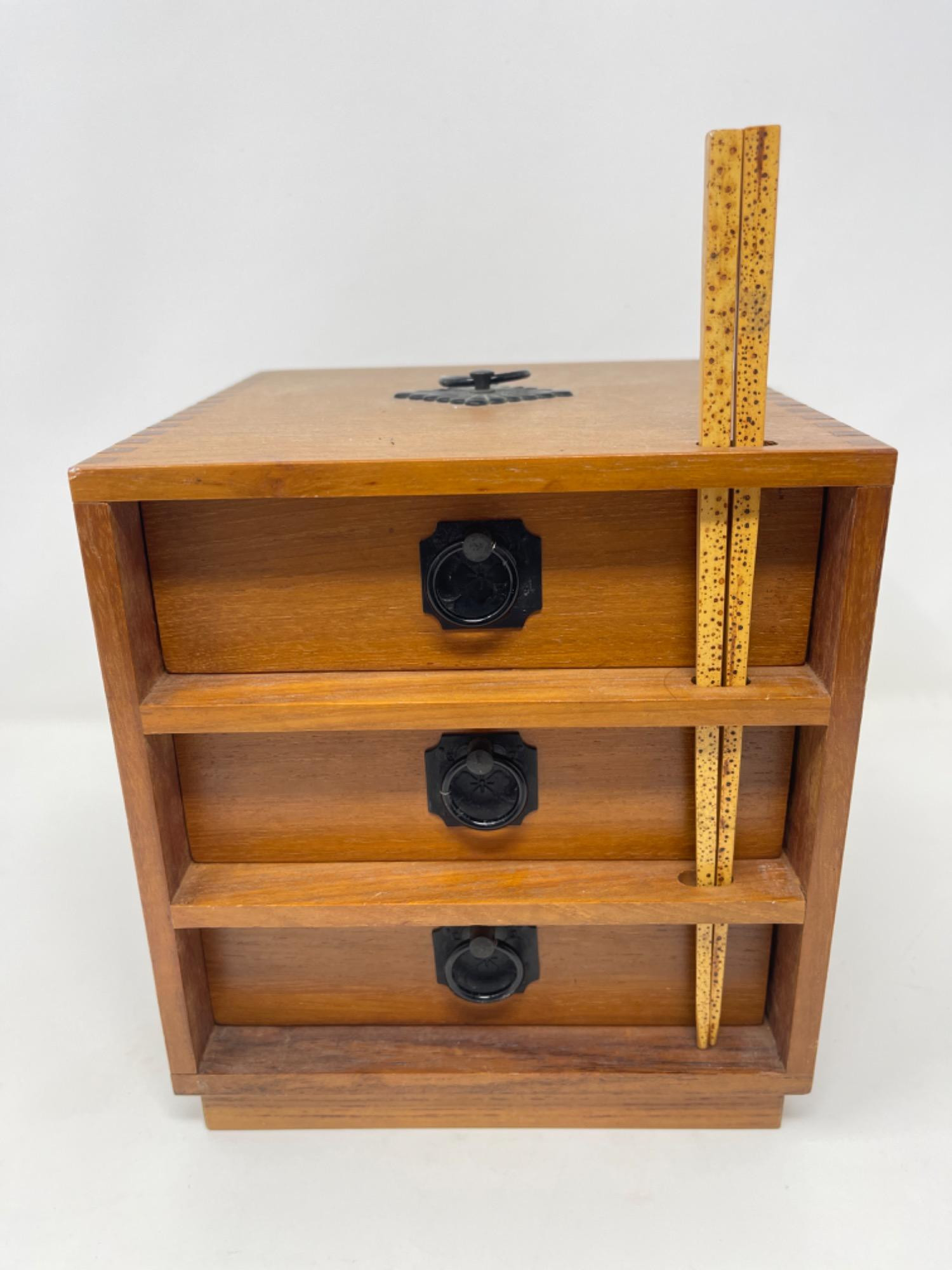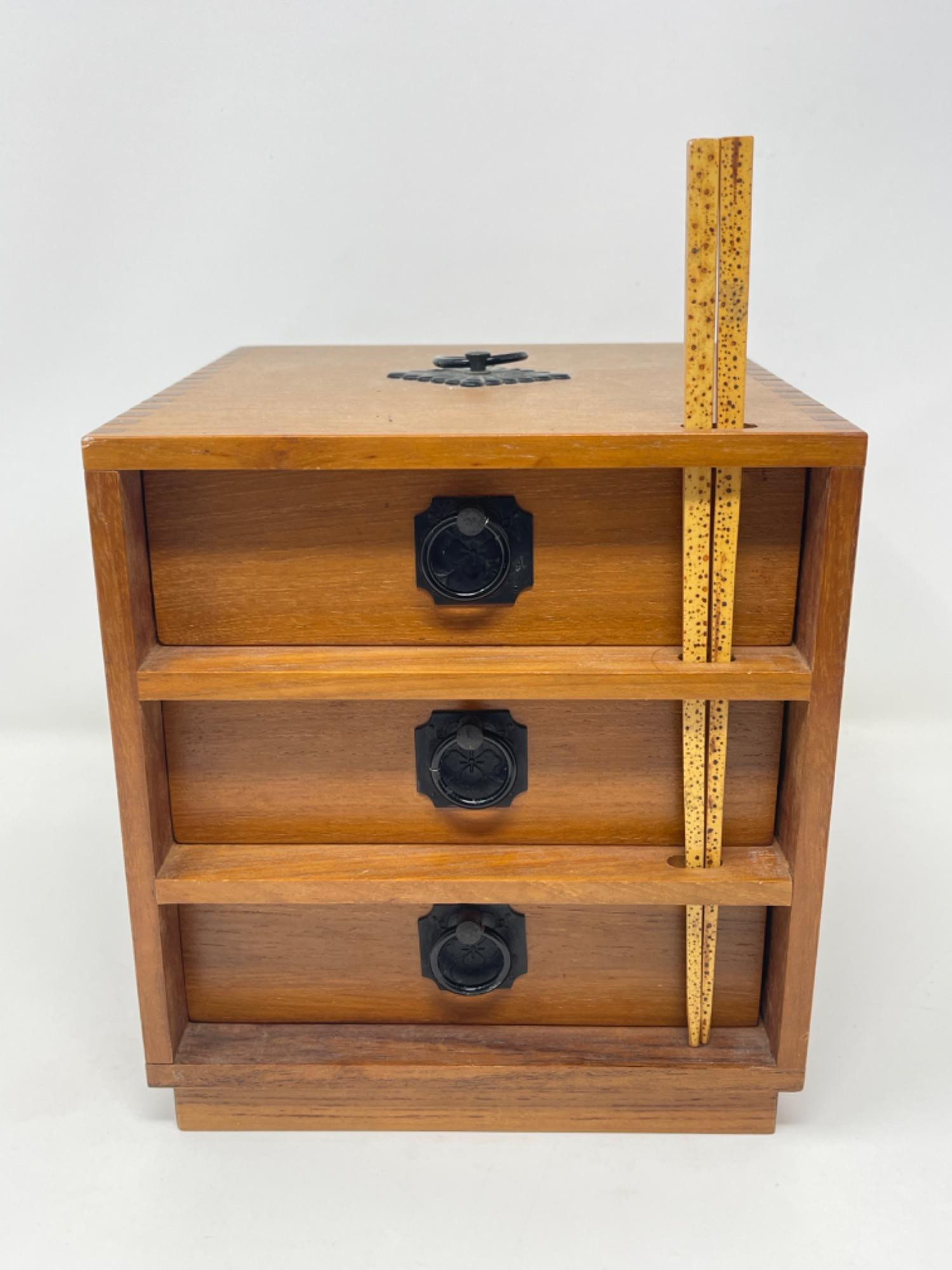 Vintage Japanese Wooden Utensil Storage Chest – 3-Drawer Bento Tansu This vintage Japanese wooden storage chest is a beautifully crafted piece, featuring a compact 8-inch height, three drawers with traditional black metal hardware, and a built-in chopstick holder on the side. Traditionally used as a bento or utensil storage box, this piece embodies the elegant simplicity of Japanese design, blending functionality with artistry. Crafted from warm-toned wood with dovetail joinery, this chest was designed for storing chopsticks, utensils, or other small essentials. Condition: Top hook is broken, minor scuffs and scratches from use.