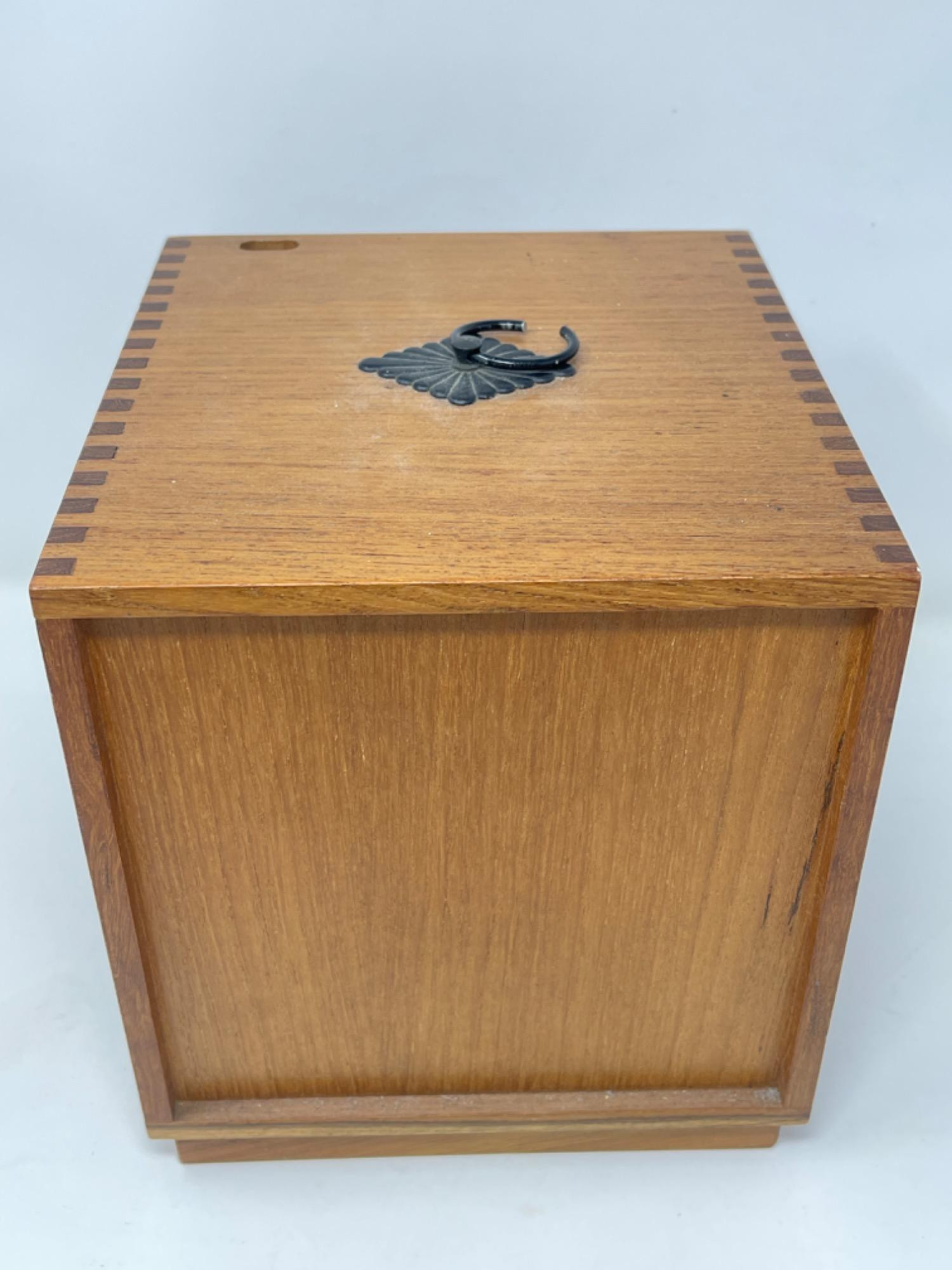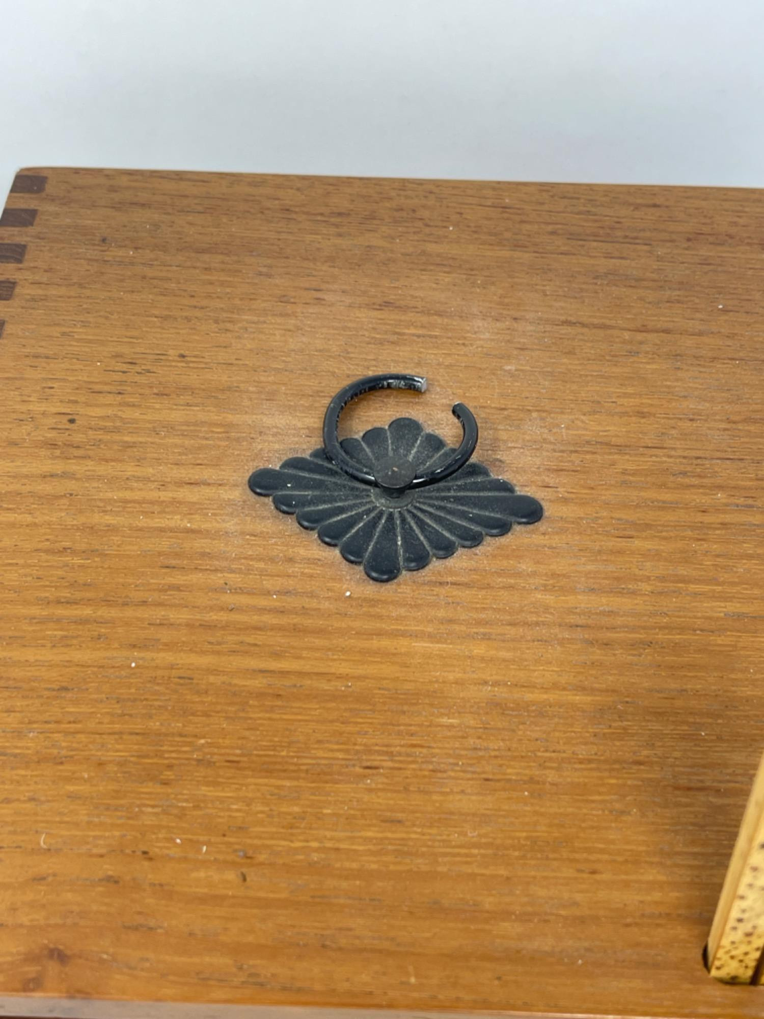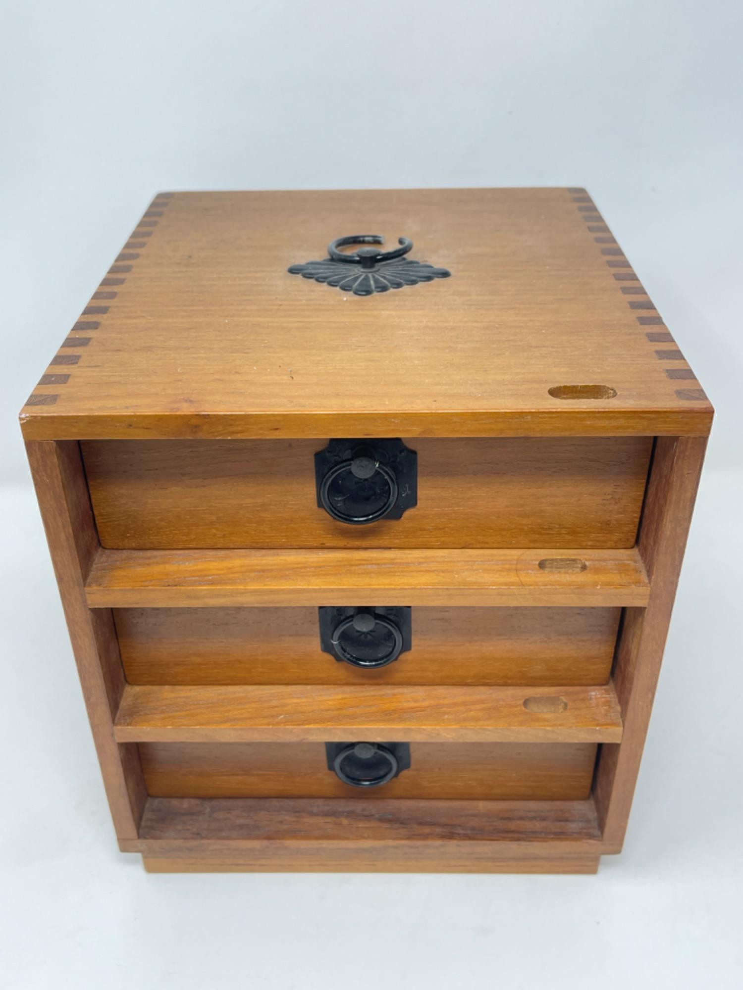 Vintage Japanese Wooden Utensil Storage Chest – 3-Drawer Bento Tansu This vintage Japanese wooden storage chest is a beautifully crafted piece, featuring a compact 8-inch height, three drawers with traditional black metal hardware, and a built-in chopstick holder on the side. Traditionally used as a bento or utensil storage box, this piece embodies the elegant simplicity of Japanese design, blending functionality with artistry. Crafted from warm-toned wood with dovetail joinery, this chest was designed for storing chopsticks, utensils, or other small essentials. Condition: Top hook is broken, minor scuffs and scratches from use.