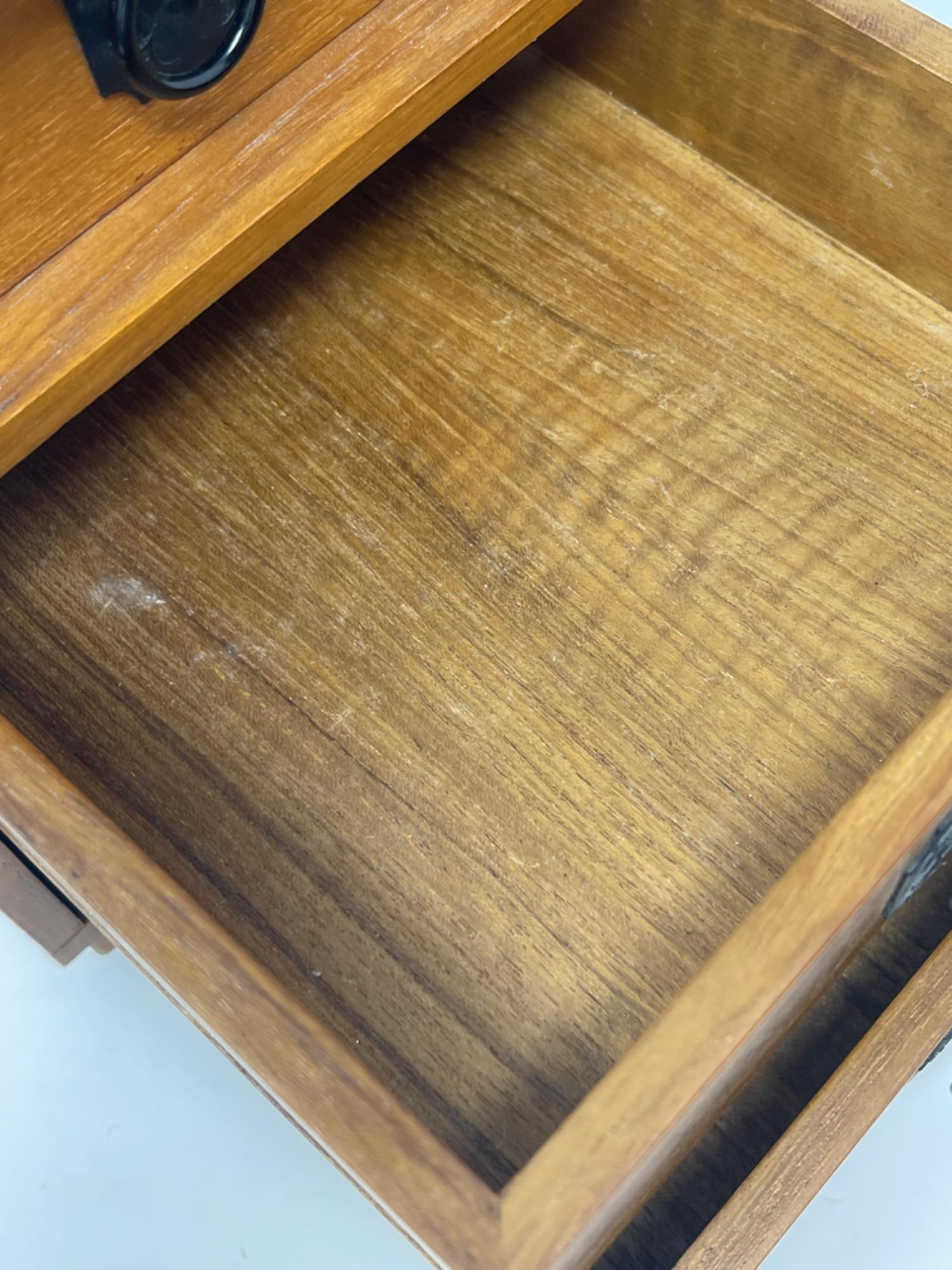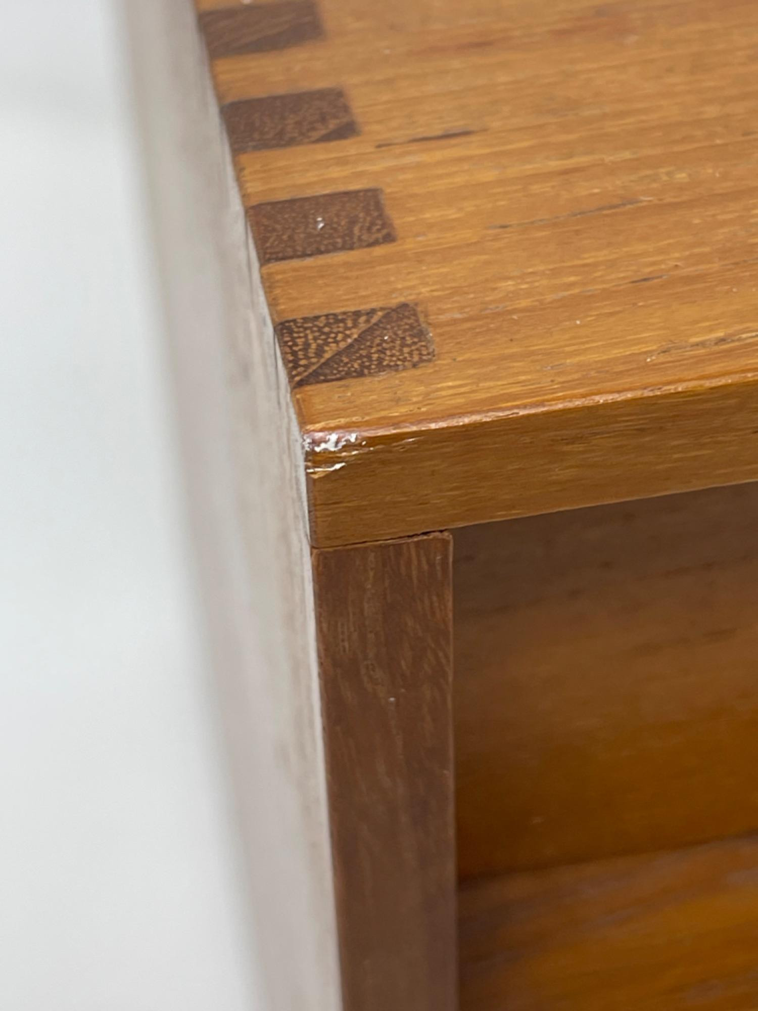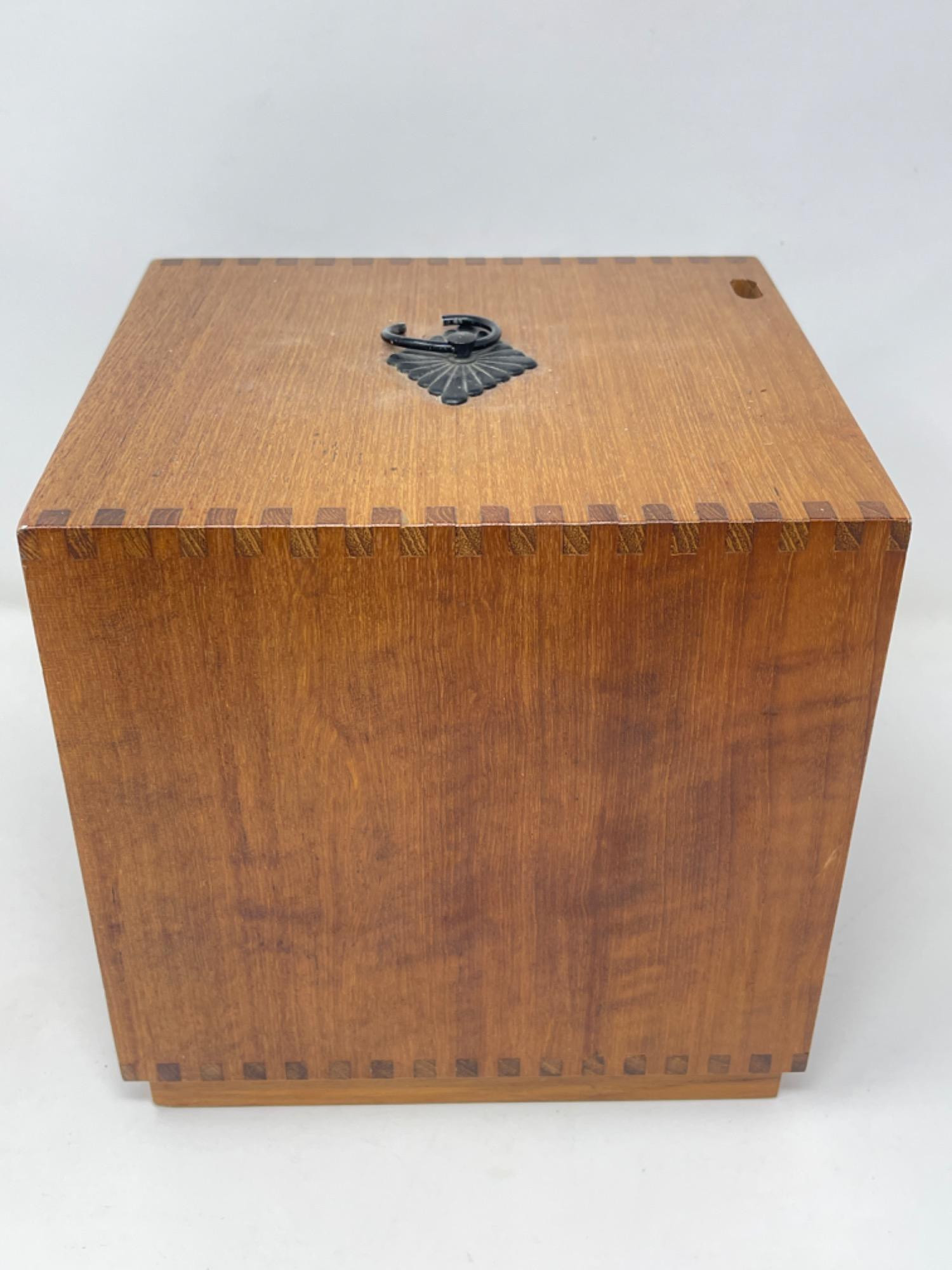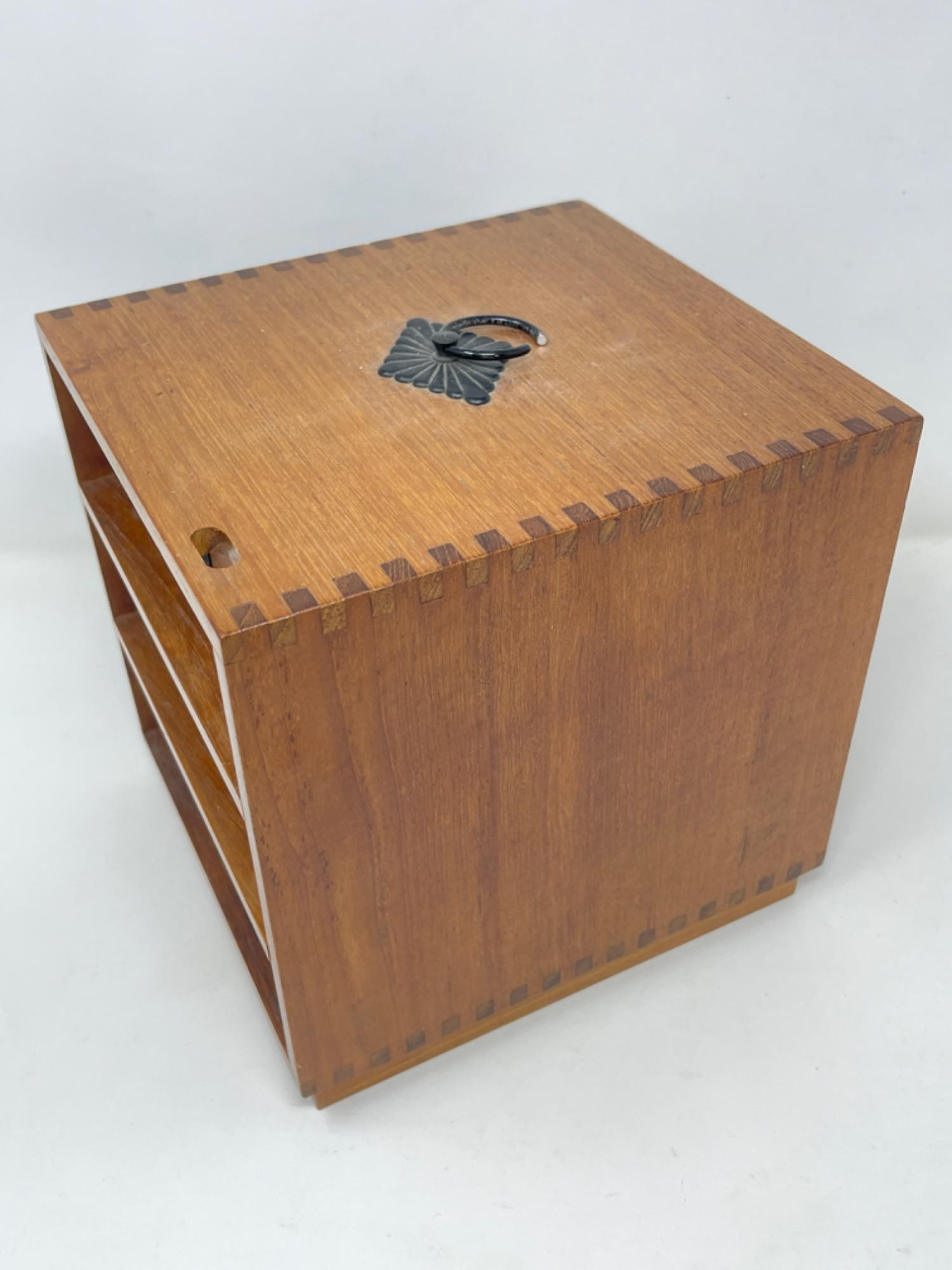 Vintage Japanese Wooden Utensil Storage Chest – 3-Drawer Bento Tansu This vintage Japanese wooden storage chest is a beautifully crafted piece, featuring a compact 8-inch height, three drawers with traditional black metal hardware, and a built-in chopstick holder on the side. Traditionally used as a bento or utensil storage box, this piece embodies the elegant simplicity of Japanese design, blending functionality with artistry. Crafted from warm-toned wood with dovetail joinery, this chest was designed for storing chopsticks, utensils, or other small essentials. Condition: Top hook is broken, minor scuffs and scratches from use.